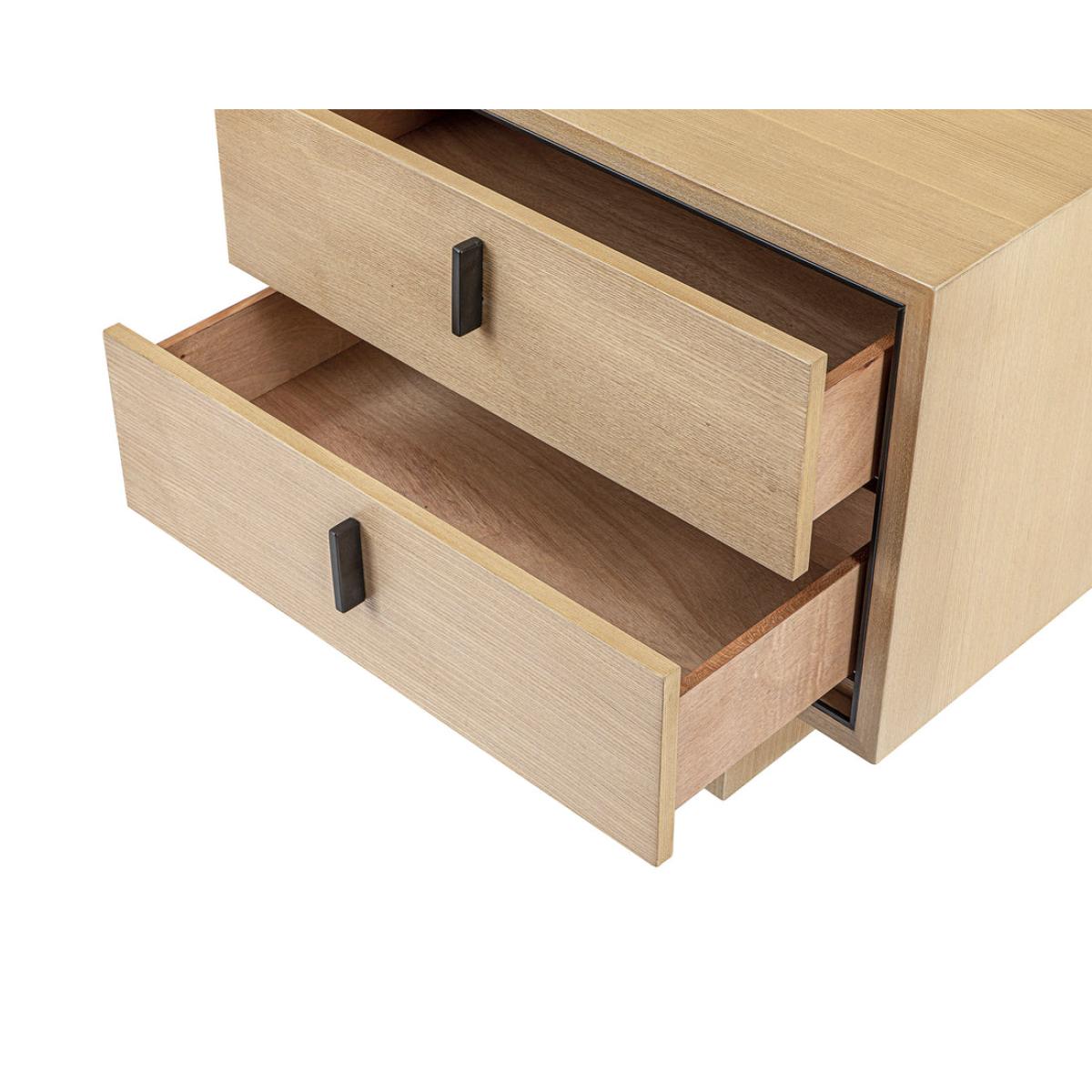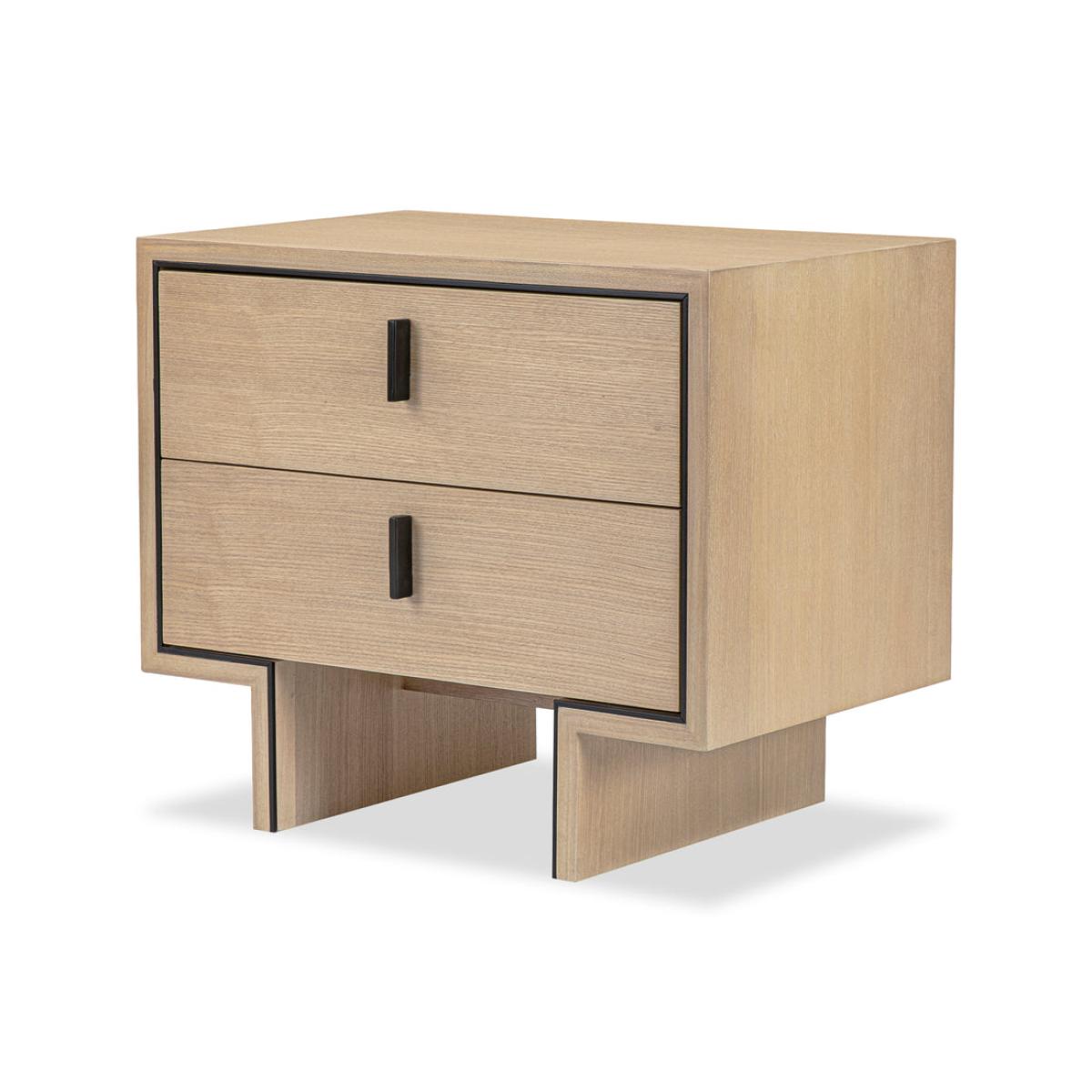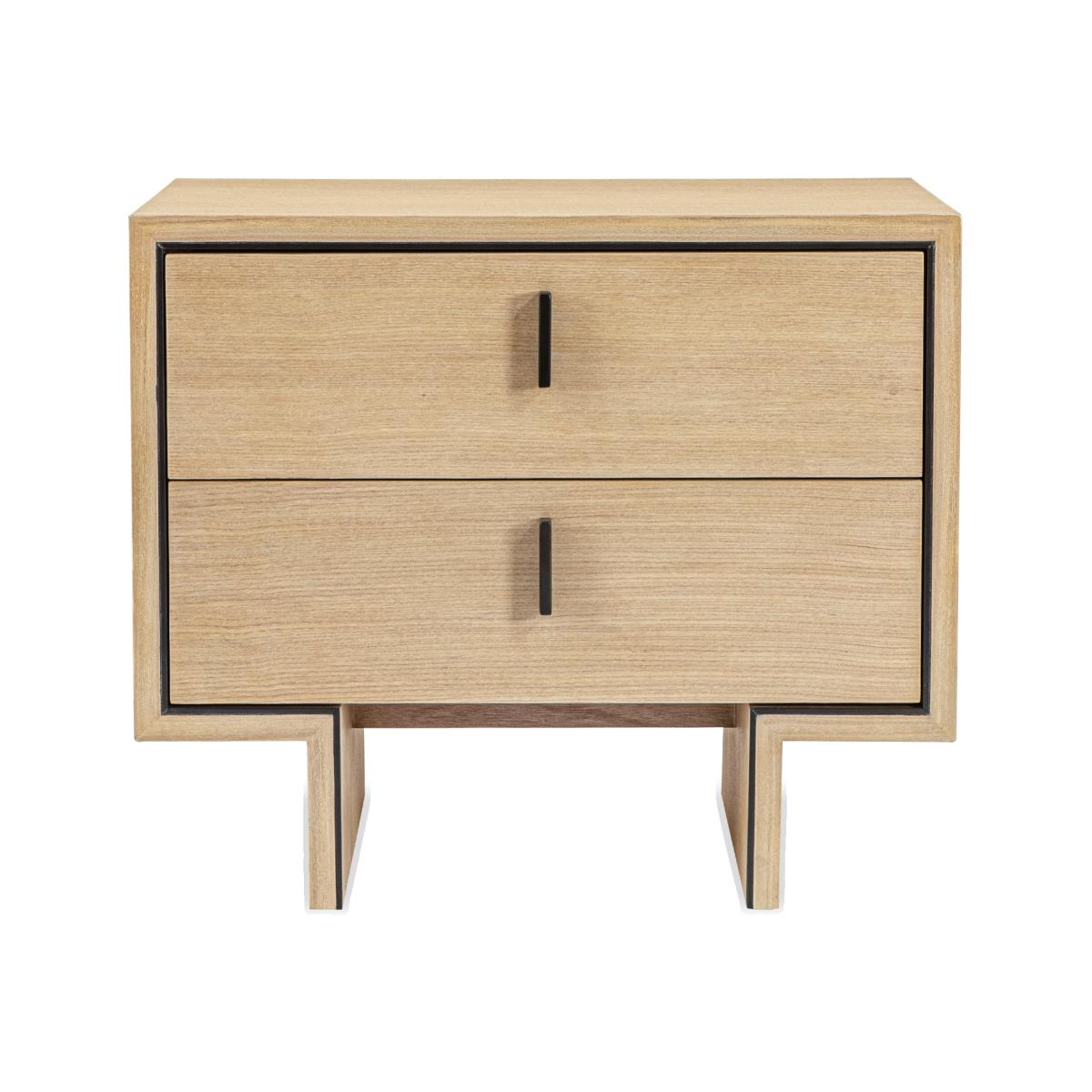 Natural Oak Ash Veneer, Industrial Brown Handle & Decorative Trim The light and welcoming Tigur bedside table will transform the ambience in your master suite. Crafted from natural white ash veneer, this slightly-textured wood grain offers depth and personality like no other. The refreshing feel will create a truly sumptuous ambience in your room of choice. Two drawers offer plenty of storage space for the nighttime essentials of your choice. The Tigur features gorgeous ash veneer in natural white with industrial brown metal handles and decorative trim.