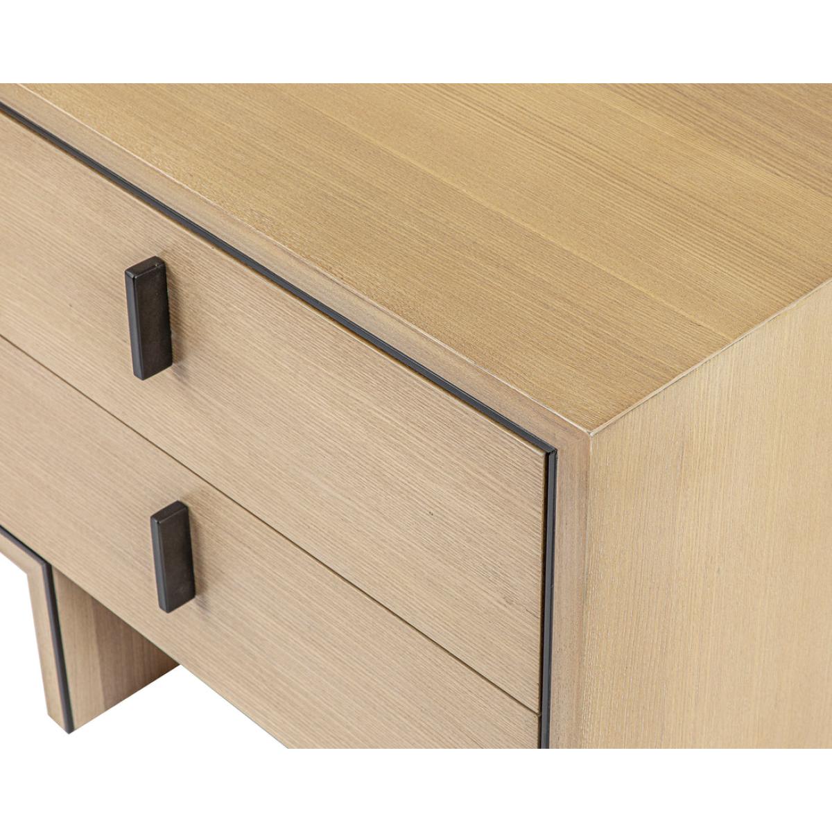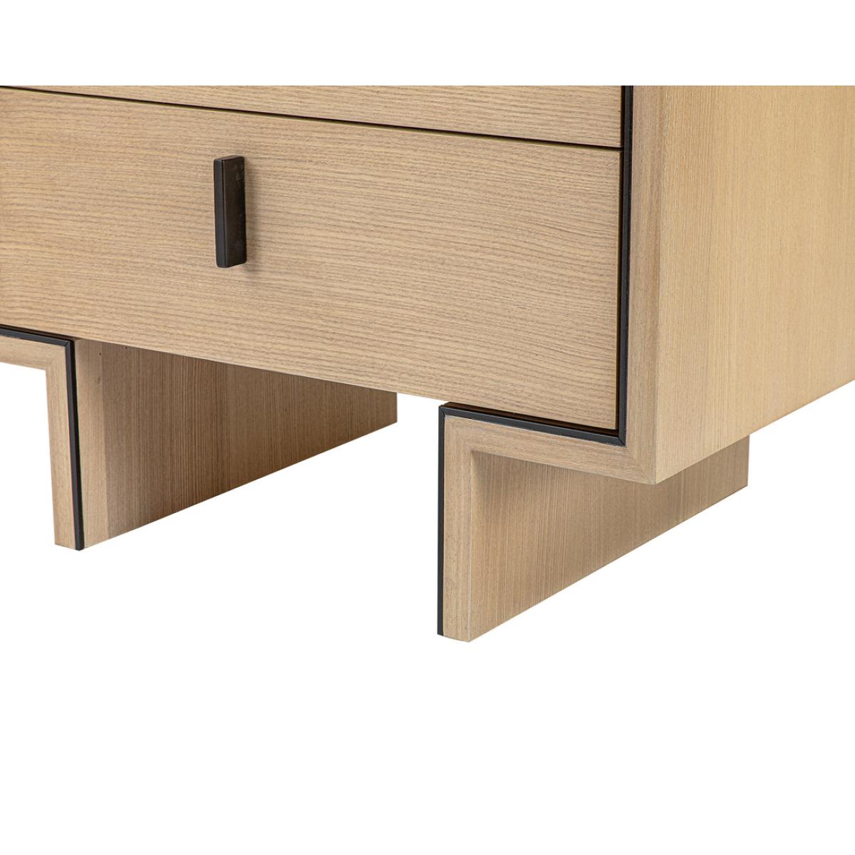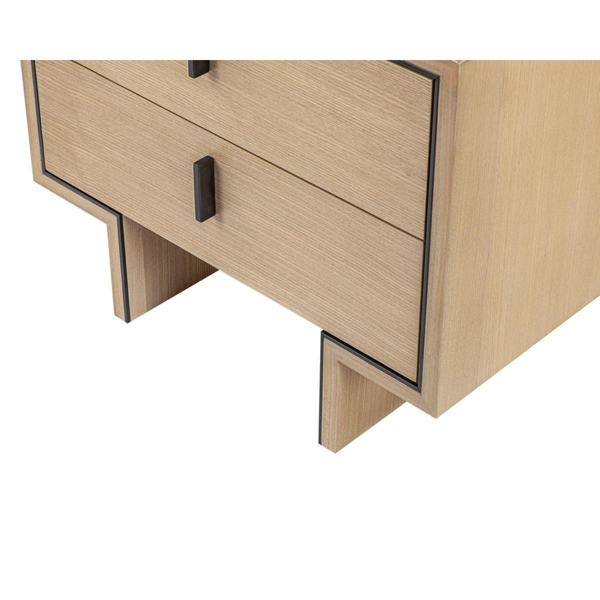 Natural Oak Ash Veneer, Industrial Brown Handle & Decorative Trim The light and welcoming Tigur bedside table will transform the ambience in your master suite. Crafted from natural white ash veneer, this slightly-textured wood grain offers depth and personality like no other. The refreshing feel will create a truly sumptuous ambience in your room of choice. Two drawers offer plenty of storage space for the nighttime essentials of your choice. The Tigur features gorgeous ash veneer in natural white with industrial brown metal handles and decorative trim.