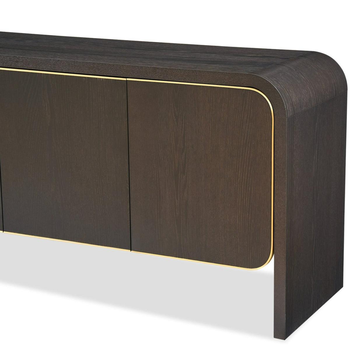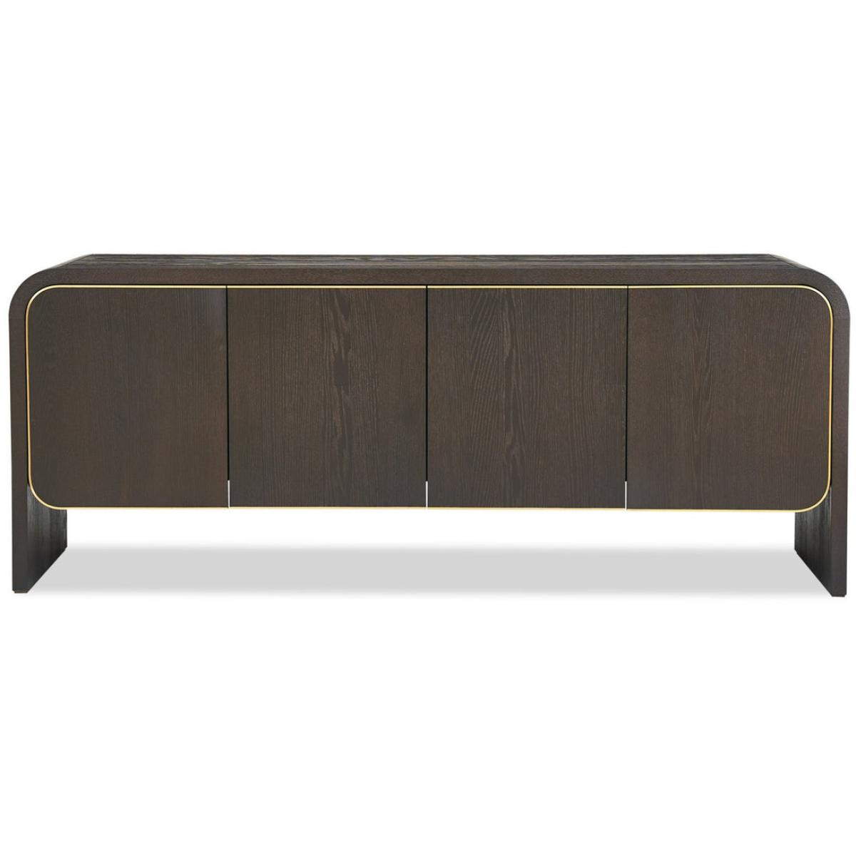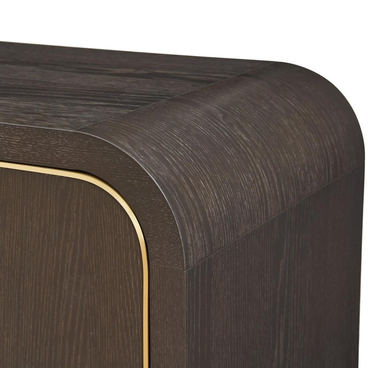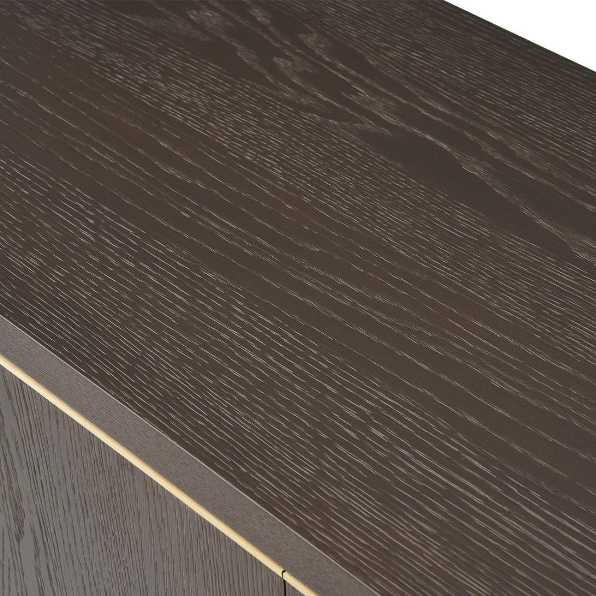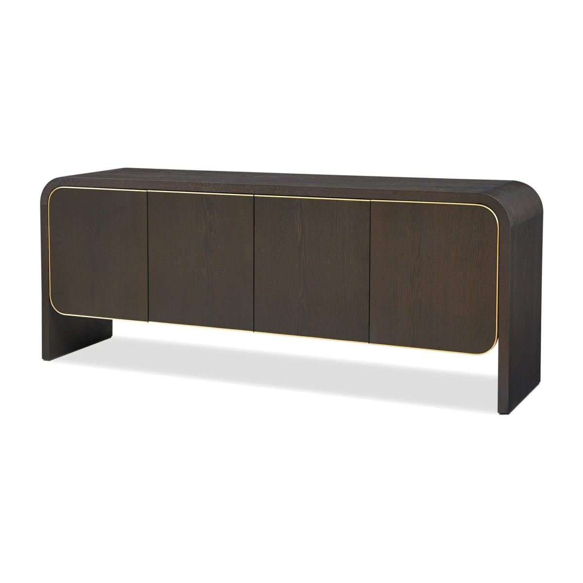 In the realm of interior aesthetics, where design harmonises with functionality, the Walter Sideboard in Dark Grey Oak and Brass emerges as an enchanting symphony of sophistication. This sideboard, swathed in a captivating dark grey oak hue, beckons admirers with an allure that transcends the ordinary. The rich, textured finish not only elevates the tactile experience but also infuses a touch of timeless elegance into any space it graces. What sets the Walter Sideboard apart is its meticulous fusion of wood and brass, an ode to the union of organic warmth and metallic opulence. The dark grey oak whispers tales of resilience while the brass trim elegantly frames the front, adding a touch of regality. This fusion of materials is not just a visual feast, but a lesson in the art of balancing contrasts, seamlessly blending classic with modern design language. Versatility is the keynote of the Walter Sideboard, making it a coveted addition to both residential sanctuaries and hospitality havens. From the private sanctum of a bedroom to the conviviality of a dining room, the quiet sophistication of a living room to the focused ambience of a study, this sideboard transcends boundaries. The Walter Sideboard in Dark Grey Oak & Brass stands as a testament to the synergy between materials, colours, and spaces, inviting you to redefine your surroundings with an eloquent whisper of refined taste. Features: Four doors, Two shelves each section, Dark Grey Oak, Brass Finish Also Available in Natural Walnut