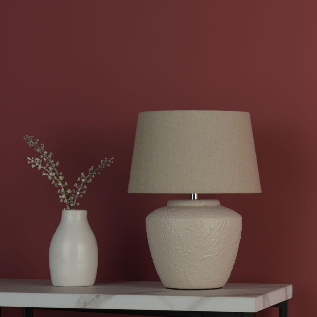 Combines timeless design with subtle texture. Crafted from ivory ceramic with a softly textured finish and paired with a tapered fabric drum shade, it offers a warm, inviting glow that enhances any interior. Perfect for bedside tables, living rooms, or hallway consoles, the Lianne brings understated elegance and versatility to both classic and contemporary spaces.