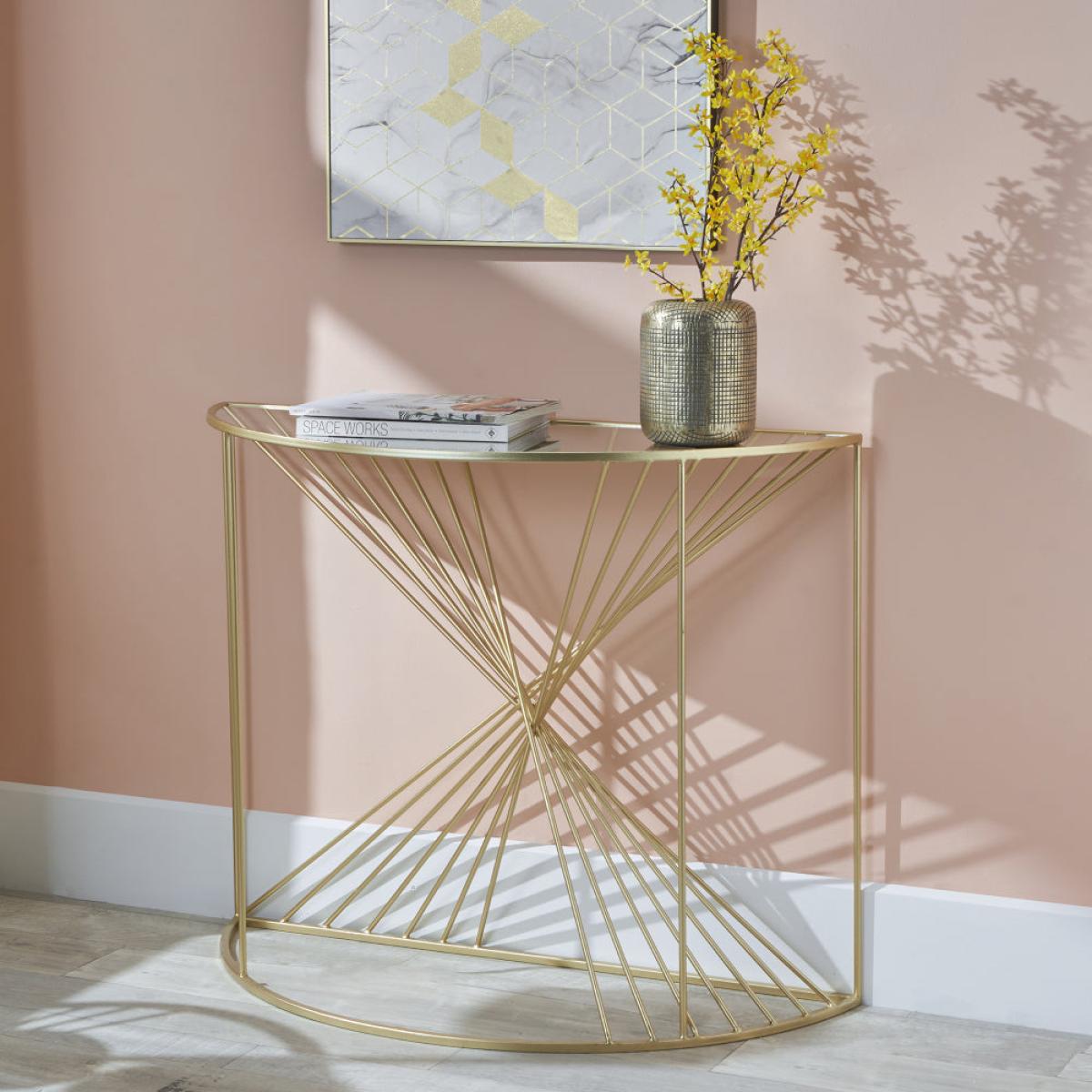 The with fabulous elaborate twisted design is the ultimate style statement. The glamourous glass-topped console offers style and functionality and can be used in a multitude of rooms in your home.