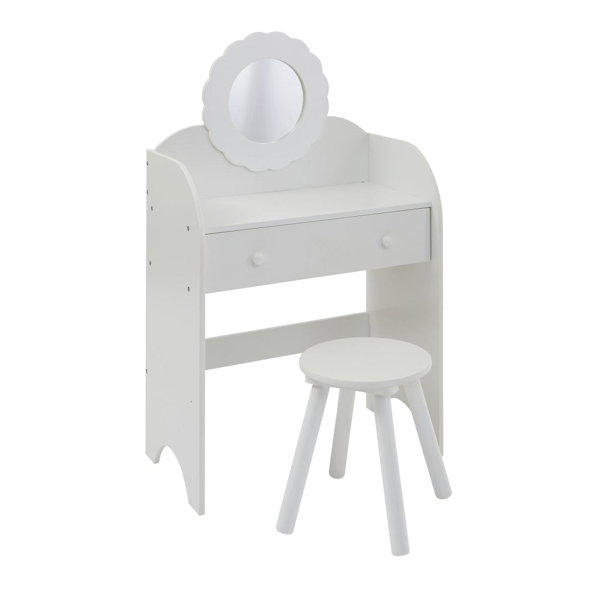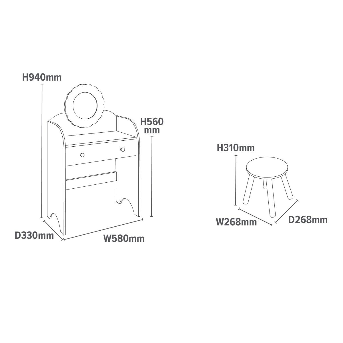 * Durable wooden set* Drawer for storage* Safety acrylic mirror* Easy to clean This dressing table and stool set adds a magical touch to playing dress-up. Your child can sit and get ready for their next adventure, transforming into a princess. With its simple and elegant design and neutral color, this set is a perfect addition to any bedroom, nursery, or playroom. The adorable dressing table features a child-safe circular mirror, a sturdy stool, and a spacious pull-out drawer for extra storage. Versatile and practical, this table and stool can also double as a study desk, ideal for reading, writing, and homework.