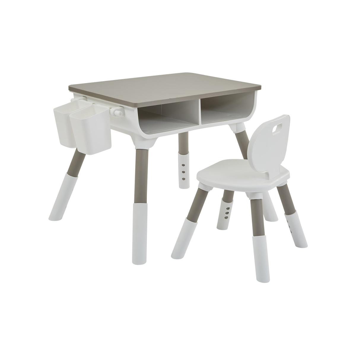 * Durable wooden set* Both table and chairs are adjustable* Under table storage* Easy to clean With its grow-with-me design, both the table and chair legs can be adjusted to suit your child’s age, making it a long-lasting addition to their room. The neutral colors ensure it fits seamlessly into any décor. Perfect for young children to play, draw, read, and enjoy mealtime, this set includes one table and one chair. It features under-table storage for books and notebooks, along with two additional side table storage boxes that click onto the table, ideal for pens, paper, and other stationery supplies.