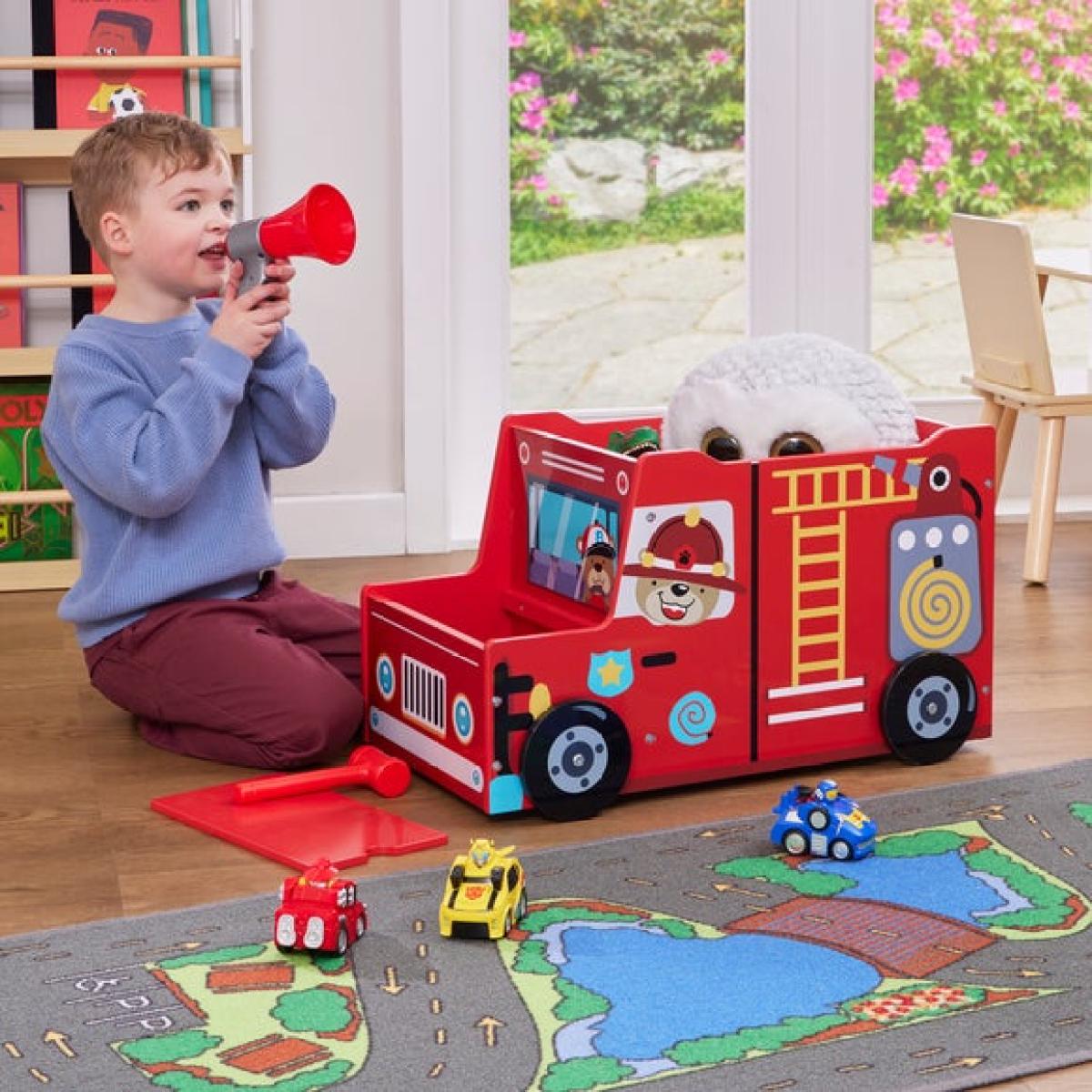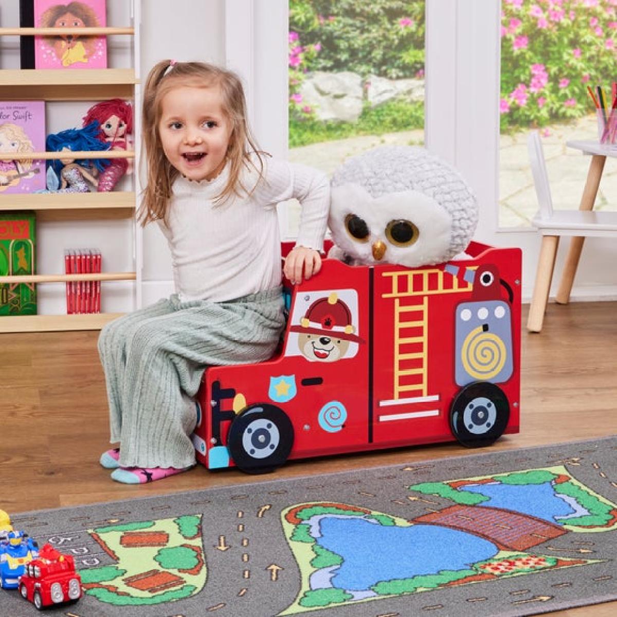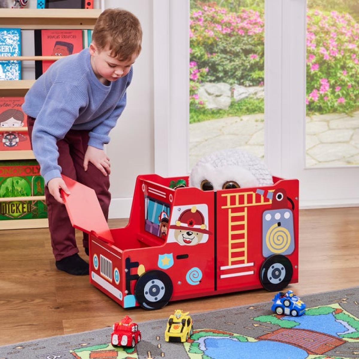 * Playful, bold design * Storage solution * Wheels for convenient transport * Sturdy Wooden composition Make tidying up an exciting adventure with the Liberty House Toys Kids Fire Engine Toy Box. This sturdy wooden composition storage solution boasts a playful, bold fire engine design, perfect for any little hero's room. It provides ample space for toys, plus extra storage for smaller items at the front. Functional wheels allow for convenient transport, letting your child easily move their toys around. It's a fun and long-lasting piece that meets all relevant safety standards.