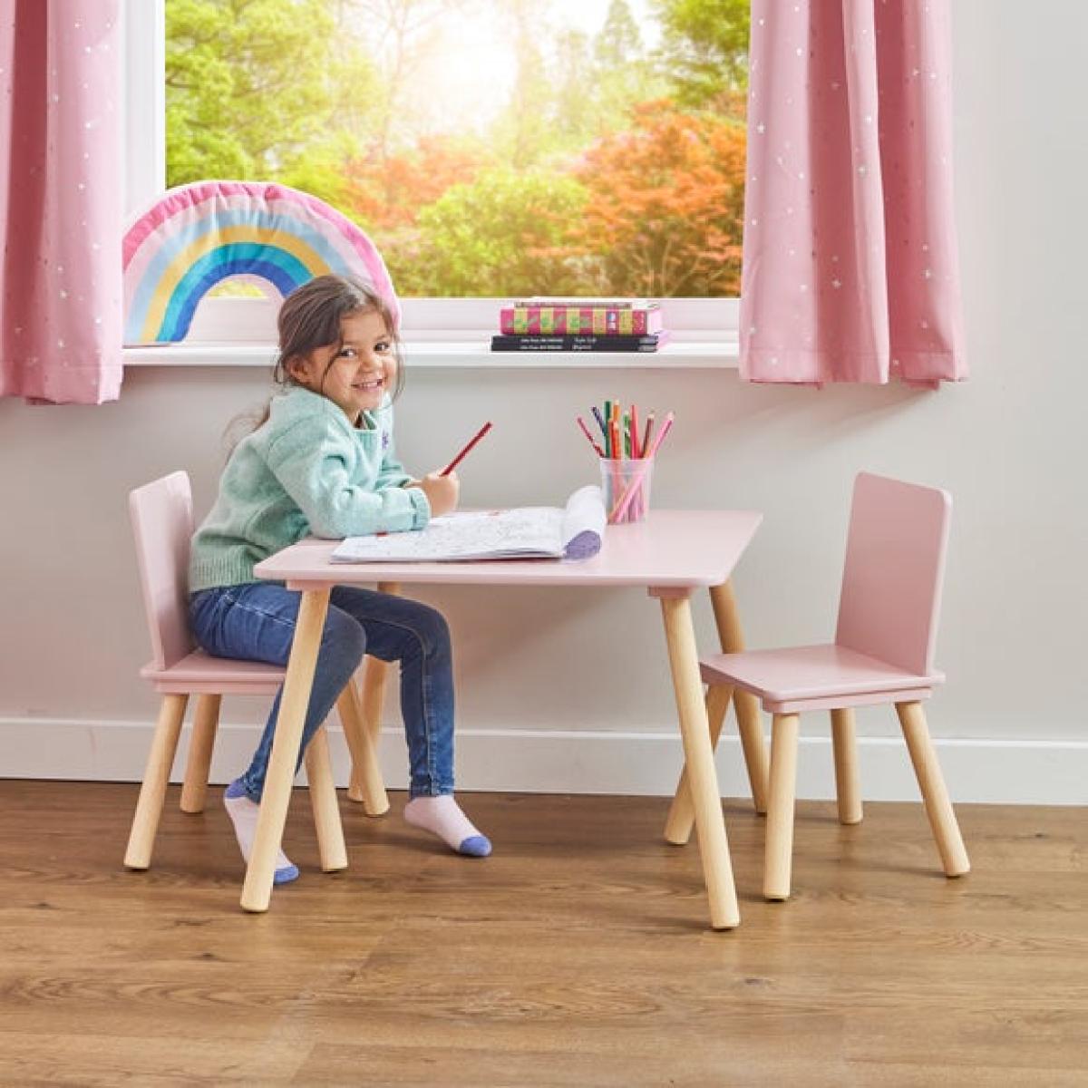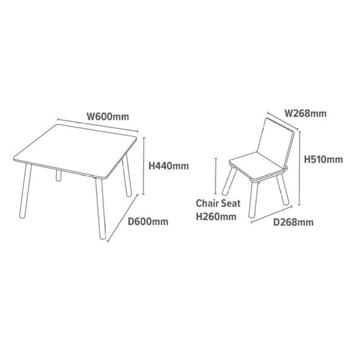 * Wooden furniture set * 1 x Table and 2 x Chairs * Lacquered coating * Scratch proof Ideal for creative play, mealtimes, and learning, this wooden table and chair set is a practical addition to any playroom or bedroom. The set includes one table and two chairs, perfect for siblings or playdates. A smooth lacquer coating makes the surfaces easy to wipe clean and helps protect against everyday wear and tear.