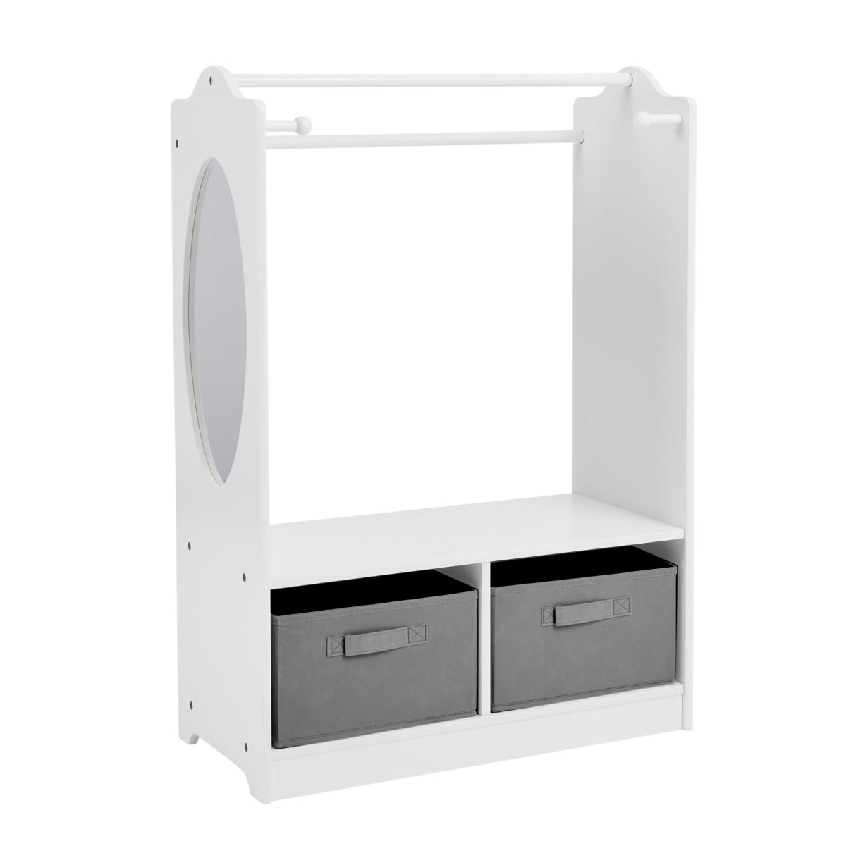 * Wooden frame* 3 large storage boxes* Wooden rail This dress up station's classic design and neutral colors ensure it fits effortlessly into any décor. Kids will love using the play rail for their dressing-up costumes, favorite clothes, or even school uniforms. This unit features two wooden rails for ample storage and two knobs on either side to hang hats, scarves, or clothes. It includes two grey fabric storage boxes, perfect for storing shoes, accessories, or clothes. Additionally, it has a child-safe oval mirror made from acrylic safety glass.