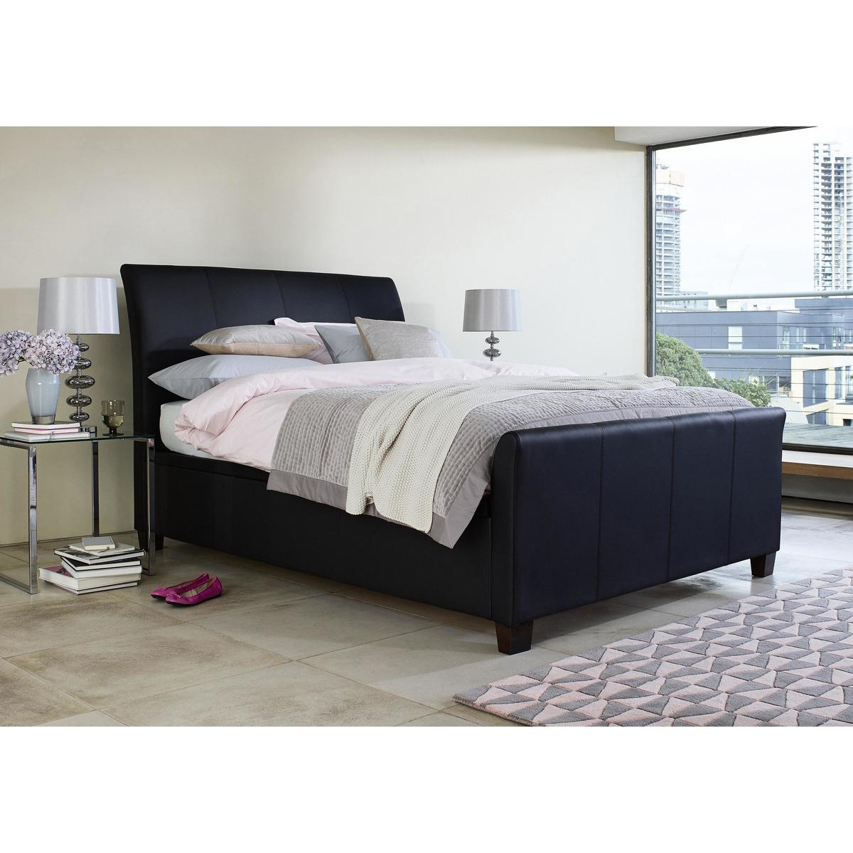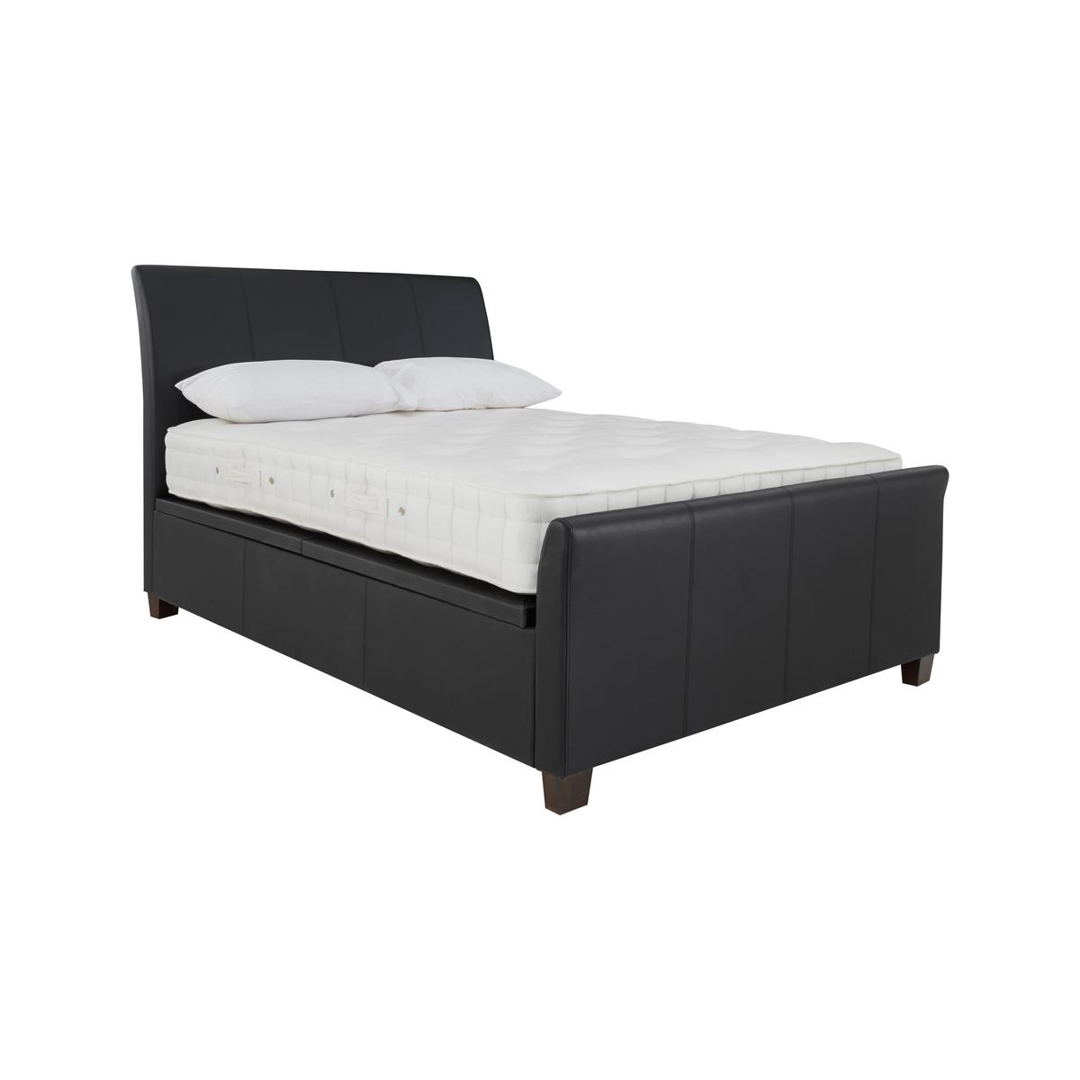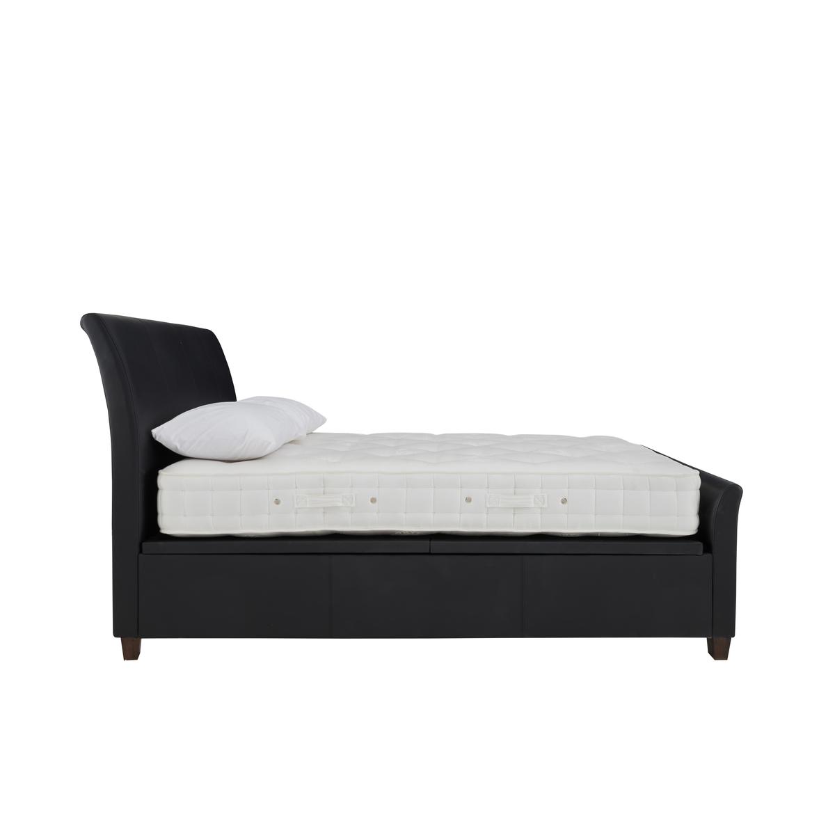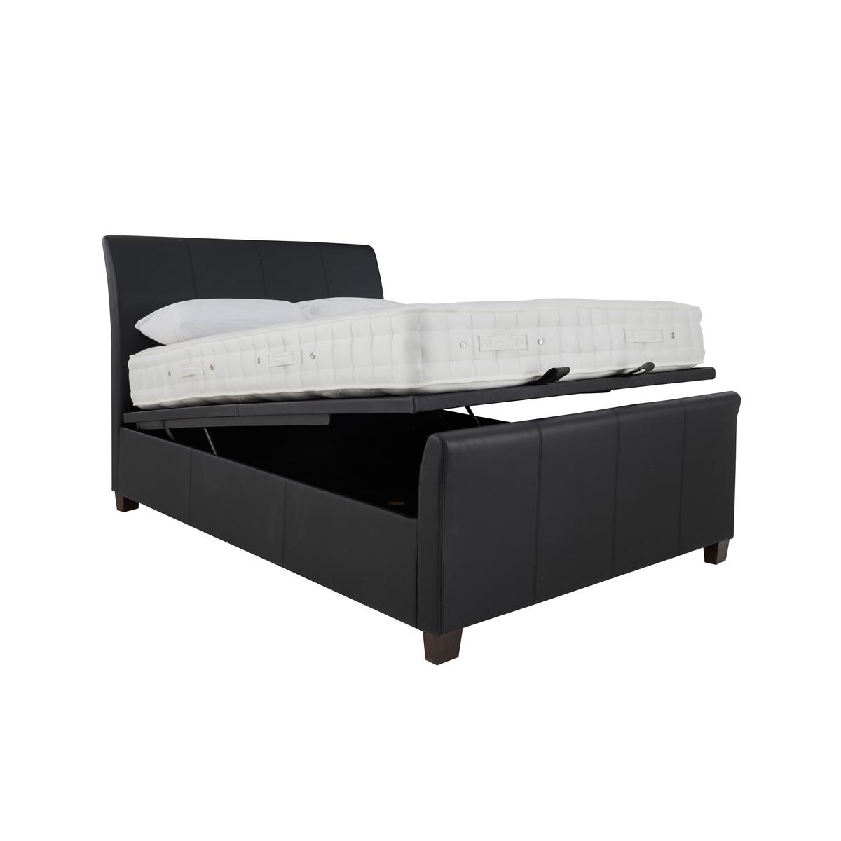 Headboard and footboard each come as one single piece. With the Liberty ottoman bed frame from Kaydian, you’ll enjoy the best of both worlds – a stylishly elegant upholstered bed frame and useful hidden storage. Simply raise the bed frame’s base – so easy thanks to the piston-assisted lift mechanism – and you’ll find an exceptionally large compartment that’s perfect for bedding, pillows and even clothing. But that’s just only one reason to choose this gorgeous bed frame. Contemporary in style, this bed has a beautiful sleigh-style curved headboard and rounded footboard. It’s upholstered in a fashionable leather-like fabric that gives the entire bed frame an altogether luxurious feel. The platform bed base is designed to accommodate any standard size mattress, and is ventilated to help keep you cool and comfortable at night. Available in a choice of upholstery colours, the Kaydian Liberty bed frame with ottoman storage can transform any bedroom into a haven of comfortable luxury. Mattress available separately