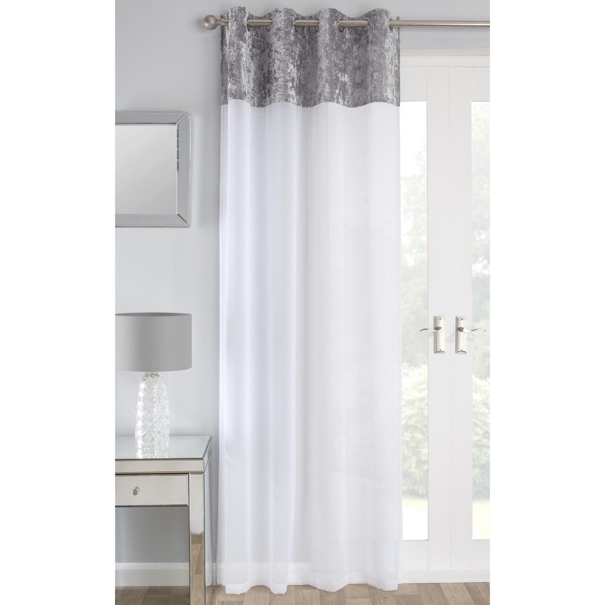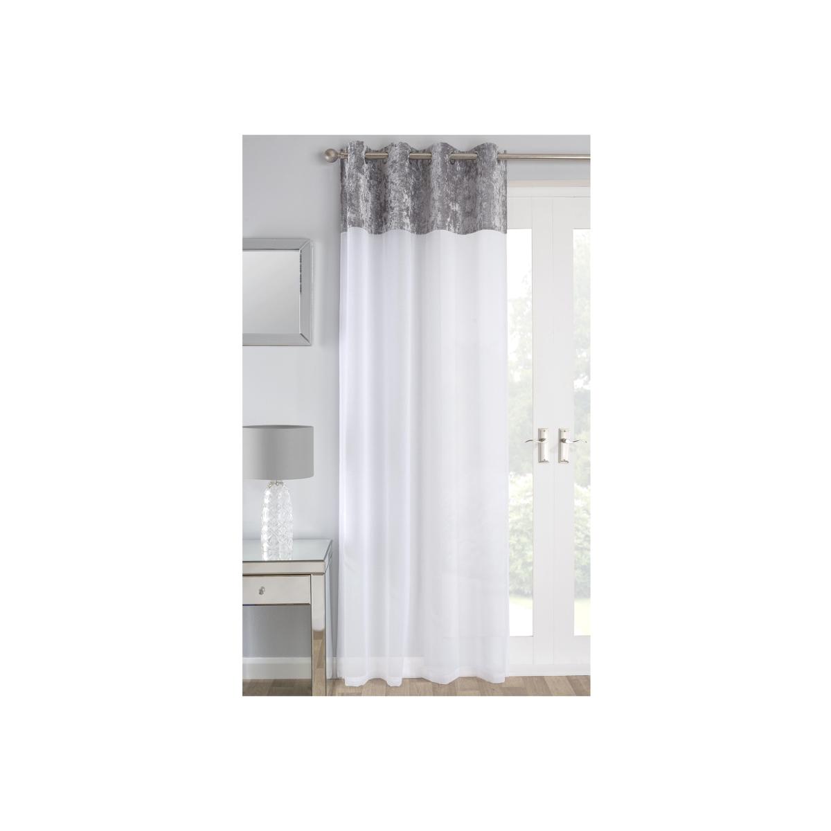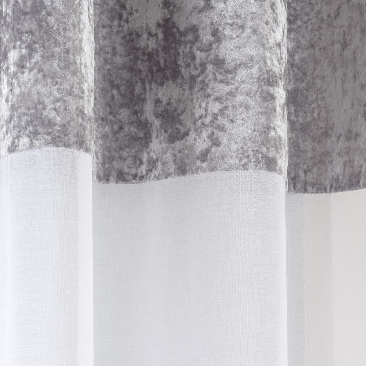 The Liberty Silver Panel is the ideal way to bring some privacy to glass doors without blocking out natural light. Hanging from eyelet headers, its sheer white fabric is topped with a luscious velvet panel in metallic silver to create an aesthetic of contemporary elegance.
