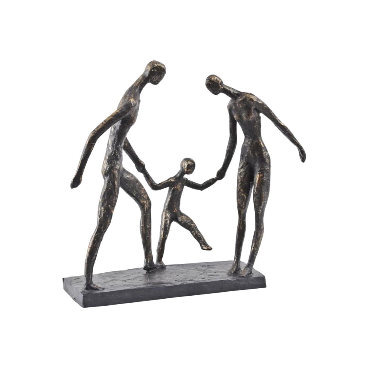 Contemporary roughly textured sculpture of a family of three holding hands. Cast in resin and finished in antique bronze with a matt black base. Weight: 1kg Dimensions: W 31.7 x D9.7 x H 29.8cm Base material: Polyresin Colour: Bronze