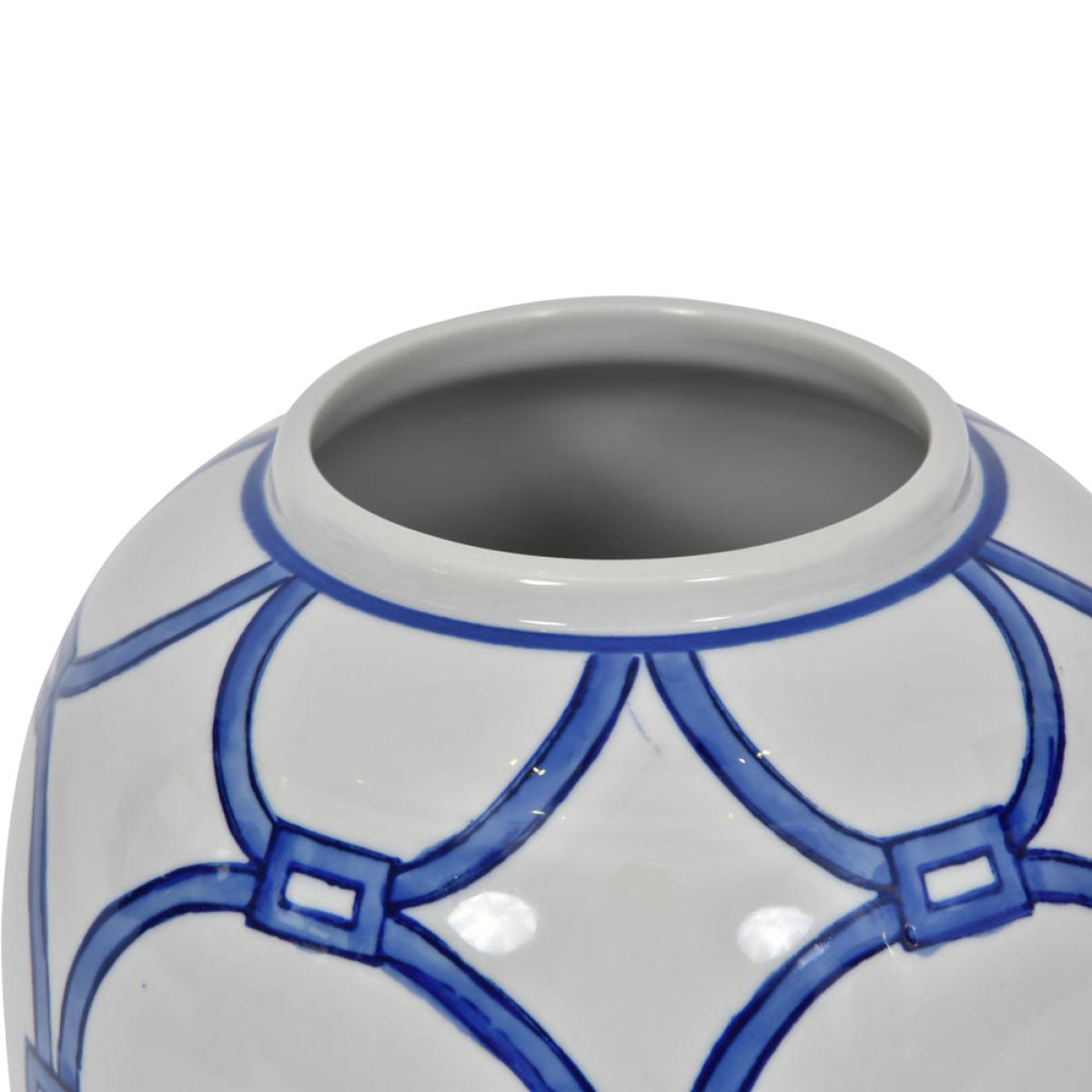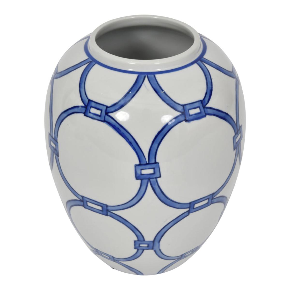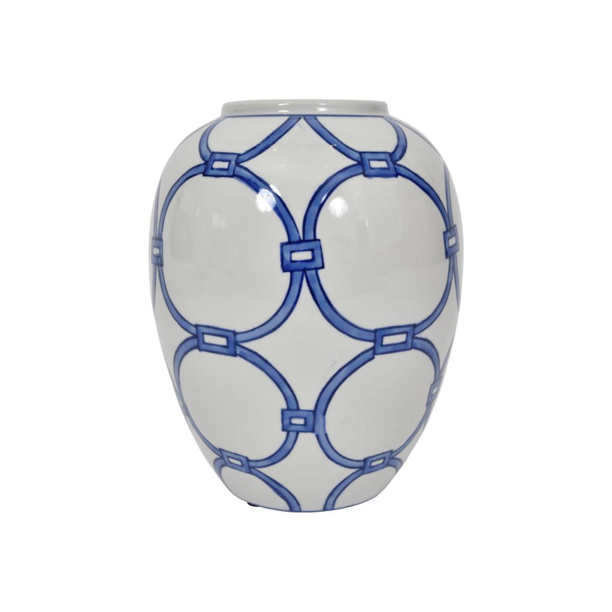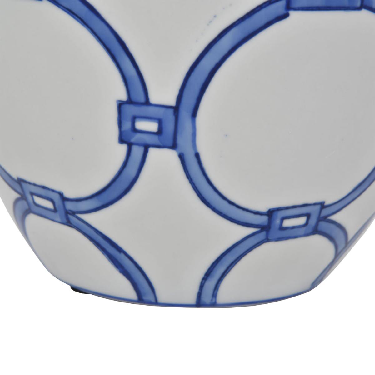 The Libra Blue Loops vase is an intriguing piece which will have your visitors trying to guess its age, due to its classical styling with a modern twist. This vase is hand painted with the mid-blu. View More. The Libra Blue Loops vase is an intriguing piece which will have your visitors trying to guess its age, due to its classical styling with a modern twist. This vase is hand painted with the mid-blue pattern adorning a pale biscuit coloured base. The interlocking loops pattern is eye-catching whilst remaining subtle, and this piece is versatile to fit in with a wide range of décor styles. Standing 20cm high this vase could be a standalone feature or could hold some dainty, cute flower stems to add even more appeal.