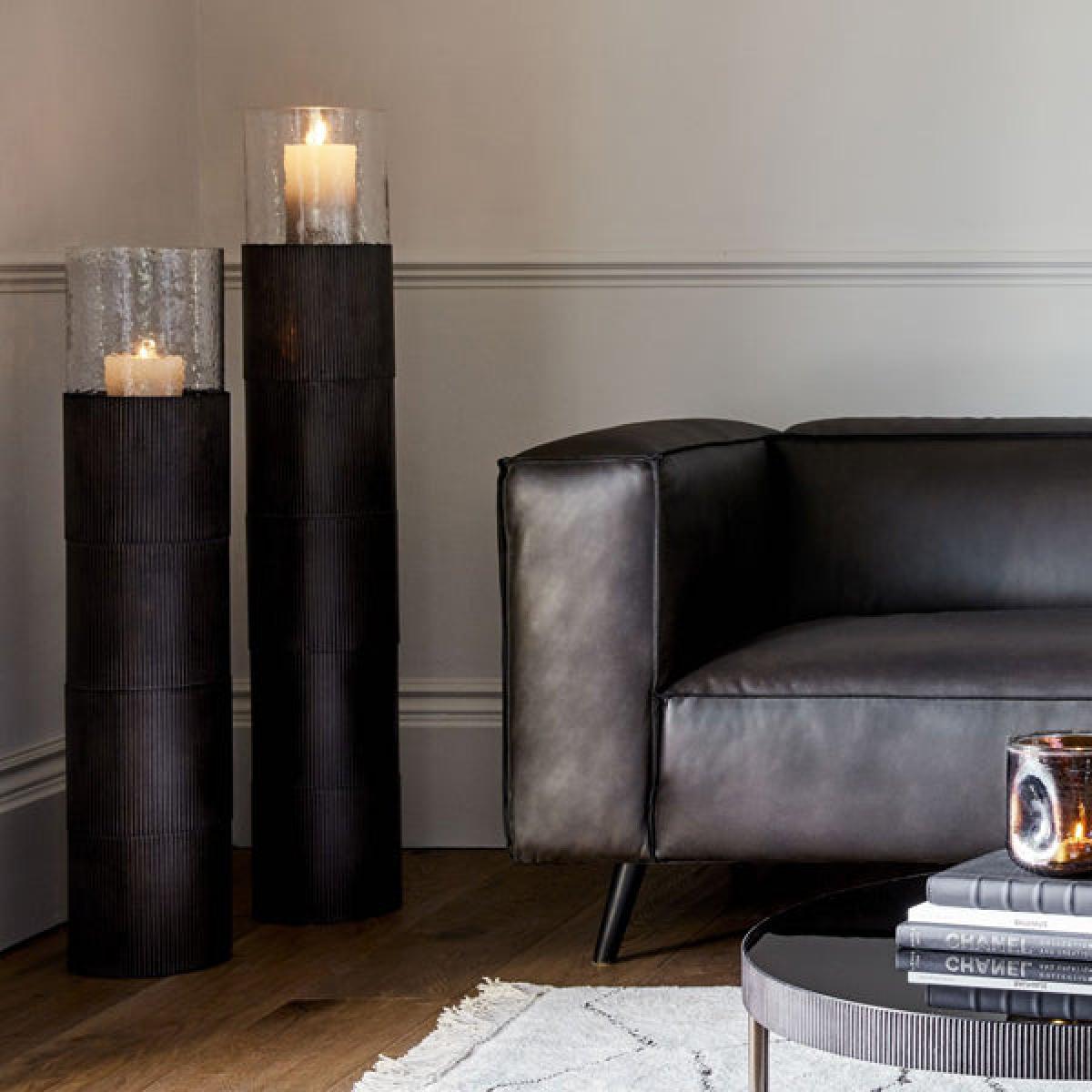 The Libra Braithwaite Floor Lamp Hurricane is a striking and unusual design, made from a combination of glass and oak. It stands 122cm tall with a diameter of 21.2cm, with the base of the lamp covered in a sleeve of textured wood pieces that evoke a tree trunk. The top portion of the lamp is a glass cylinder to help reflect and project light from within. This lamp has a rustic feel with a high-end style, combining natural influences with artistic sensibility to create a lamp that has impact. Whether you place it alone or pair it with others, you create a focal point. Dimensions: H: 101.5 x W: 21.2 x D: 21.2 cm. H: 122 x W: 21.2 x D: 21.2 cm