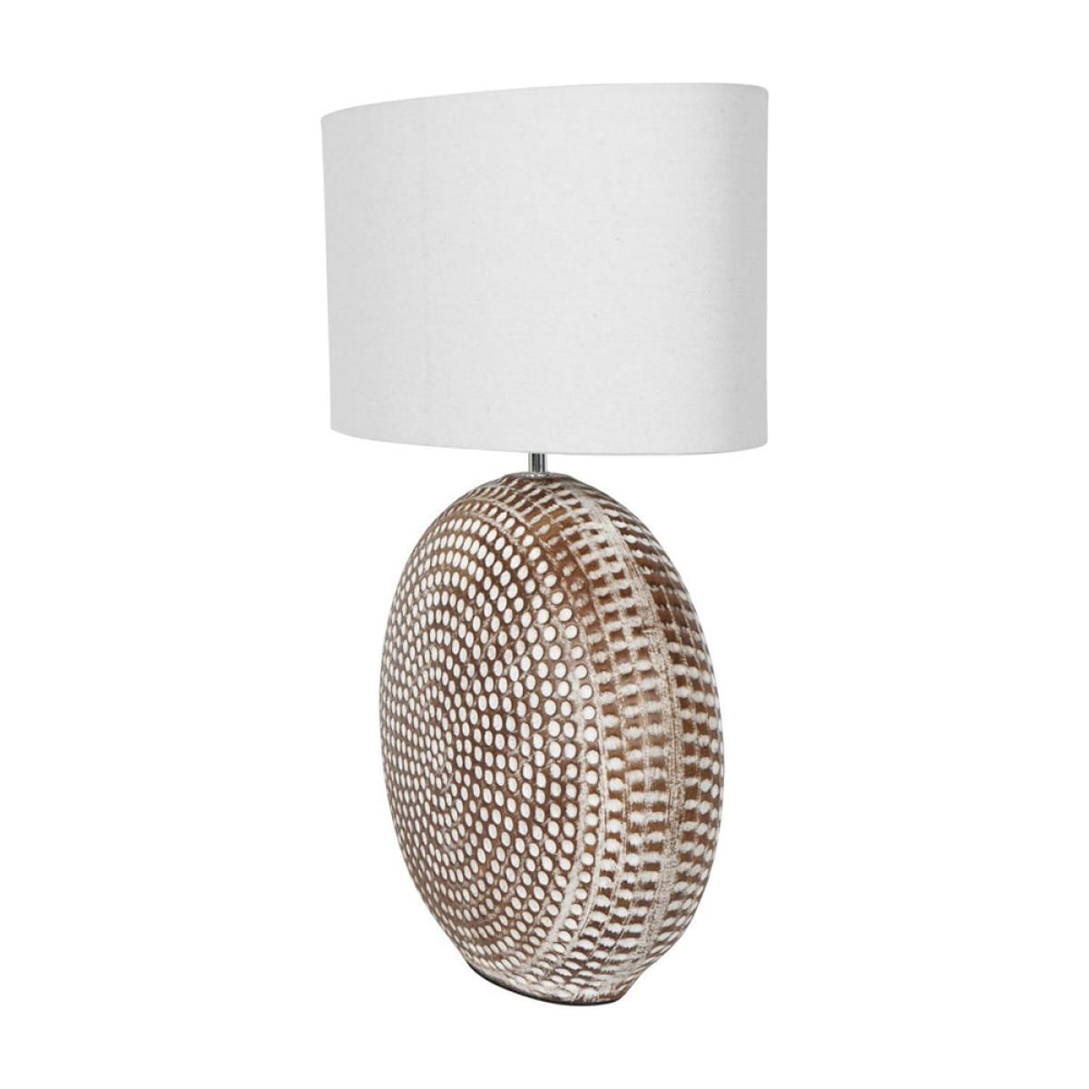 Our Chariot Round Table Lamp is made in ceramic and is a flat round drum with soft curved edges, and beautifully adorned with little round dimples. The texture is then highlighted by the hand finished painting technique, in antique creams and browns. Thanks to the unique finishing of this piece, each lamp is completely unique. Comes complete with an oval lamp shade in a natural unbleached linen fabric. Thanks to the narrow depth of this piece measuring 26cm, it is perfectly suited to sideboards, window ledges and sideboards, and any other narrower areas within the home. The lamp stands 50cm tall and benefits from a 120cm black cable, with an inline rocker switch. Dimensions: H: 50 x W: 50 x D: 26 cm Materials: 60% Ceramic base, 40% Linen shade Assembly Required: No Care Instructions: Dust with a dry, soft cloth Bulb Type: 1x E27 Bulb - not included