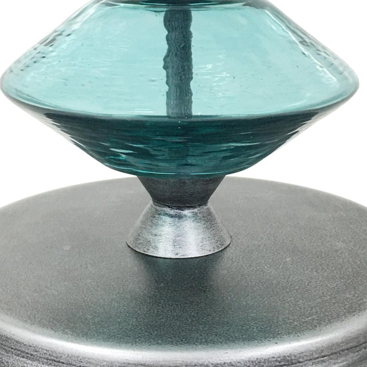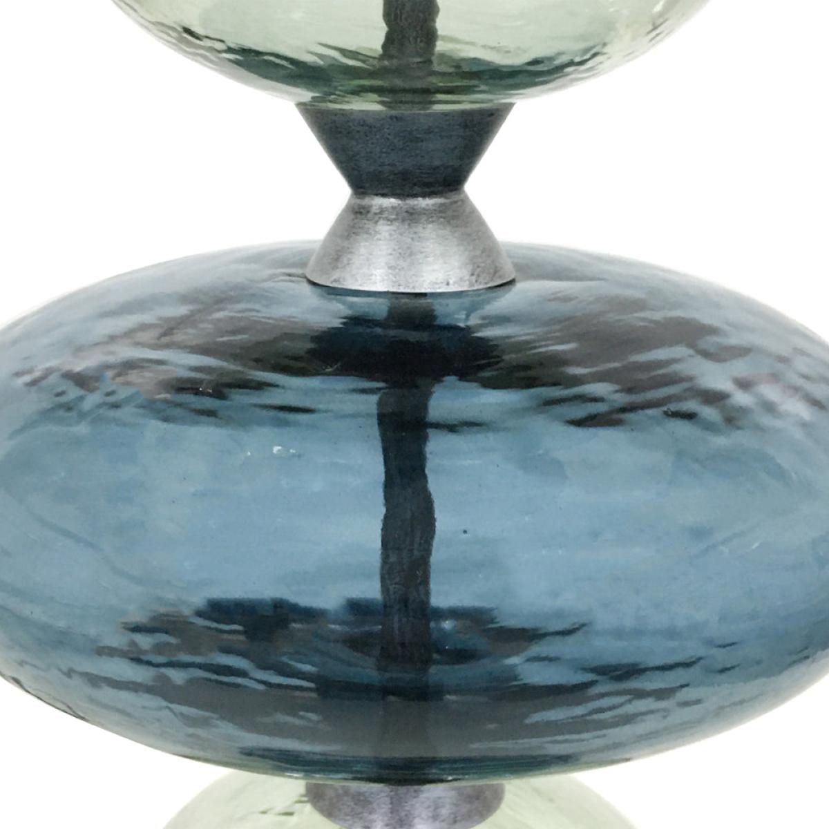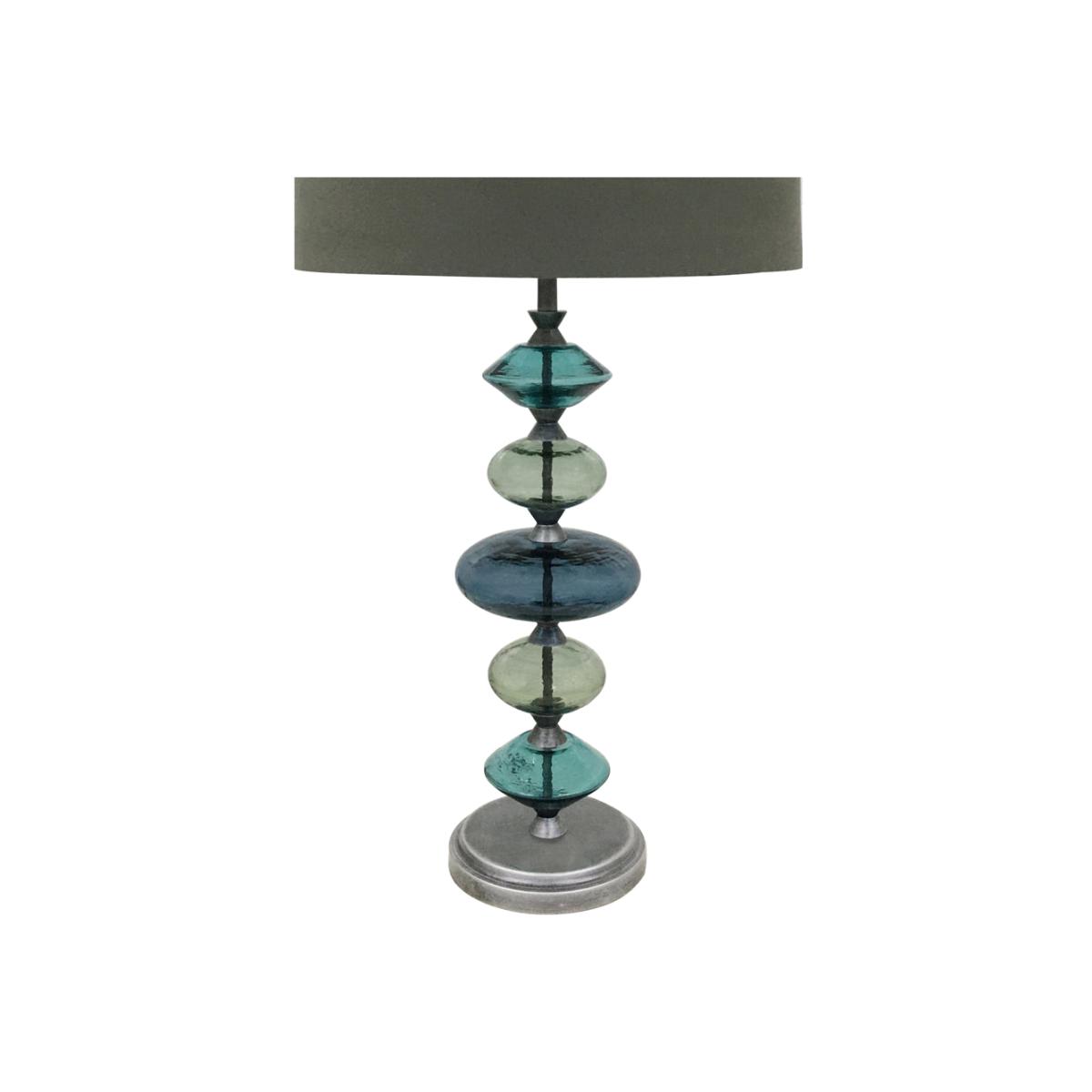 Glass is a timeless material choice for beautiful home decor pieces, and this Eva table lamp uses coloured glass to its full effect. A brushed grey metal base supports an elegant column of five glass shapes in cool shades of blue and green. Each is separated by a neat metal collar, and the pinnacle of the lamp is ready to receive your choice of E27 60W bulb. A well-chosen shade will encourage the light from the bulb to interplay with the different colours and shapes of the glass features on this gorgeous table lamp. Dimensions: W: 20 x D: 20 x H: 65 cm Materials: Iron, Glass Assembly Required: No Care Instructions: Dust with a clean, lint free cloth Bulb Type: Requires 1 x E27 Max 6W - Not included
