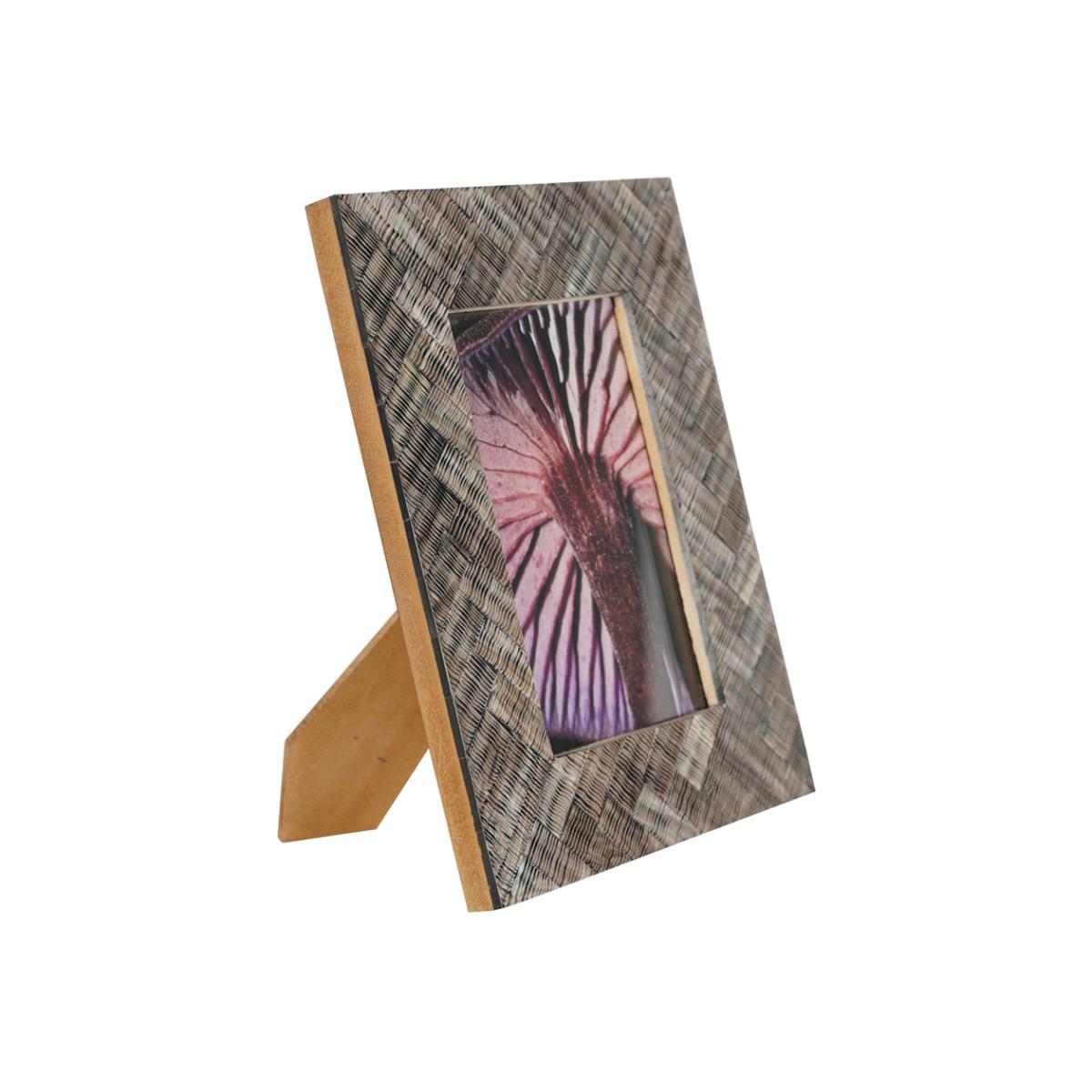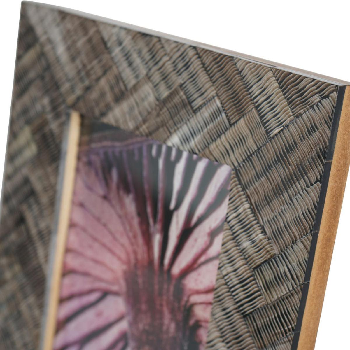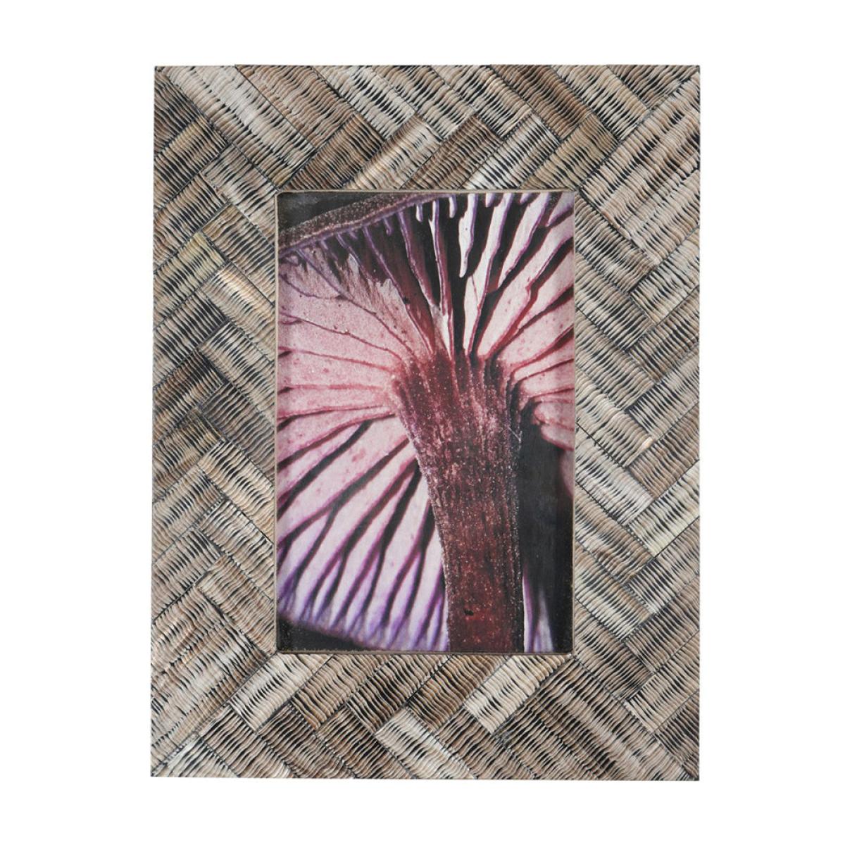 This 6x4" rectangular photo frame has a rustic finish, made in durable polyresin, it has a beautiful organic herringbone woven effect with a rustic brown bronze finish. It has a trendy fungi photo inserts which can be easily interchanged. This table standing photo frame can be displayed Portrait or Landscape. Dimensions: H: 21.6 x W: 16.5 x D: 1.3 cm Materials: Horn Assembly Required: No Care Instructions:Dust with a dry, soft cloth