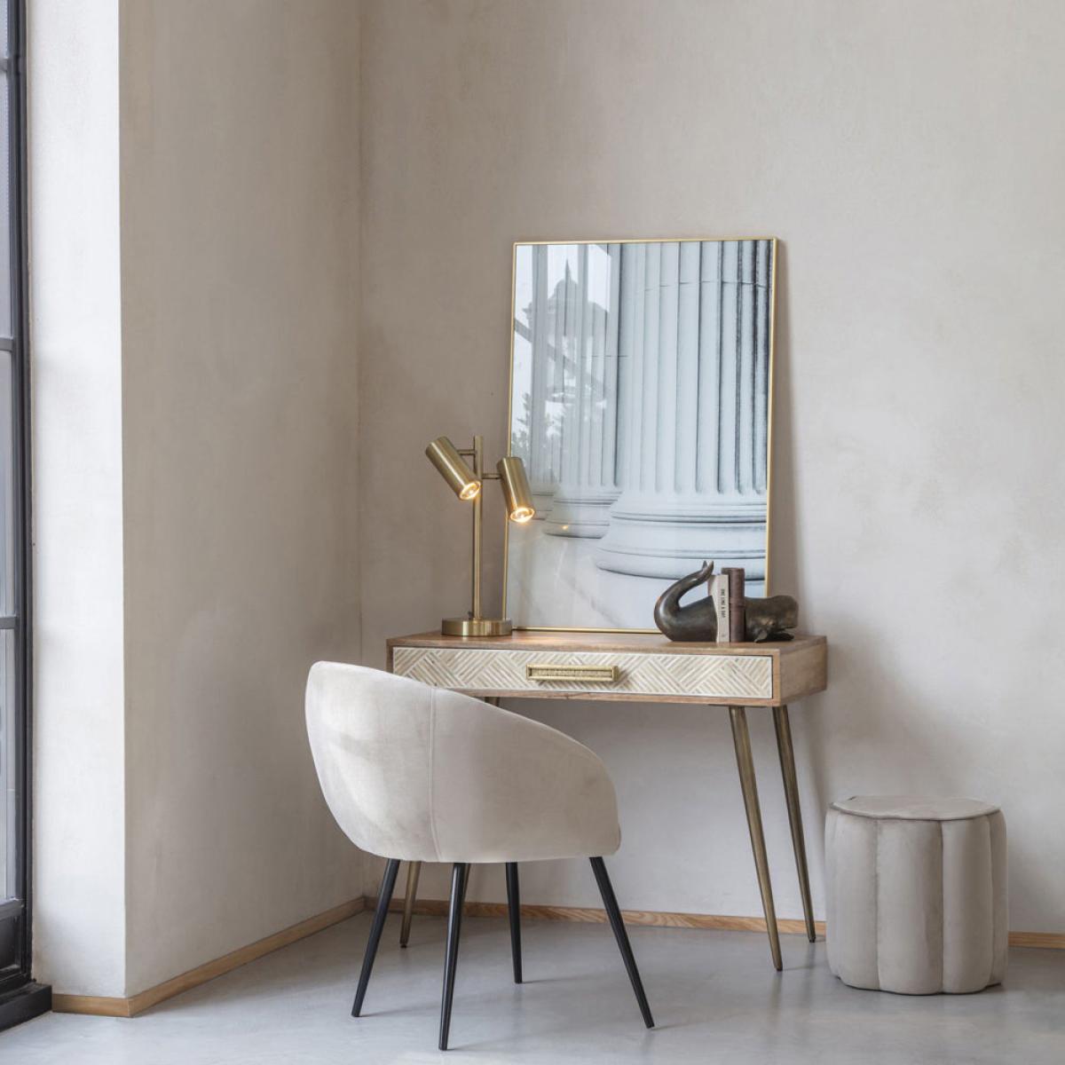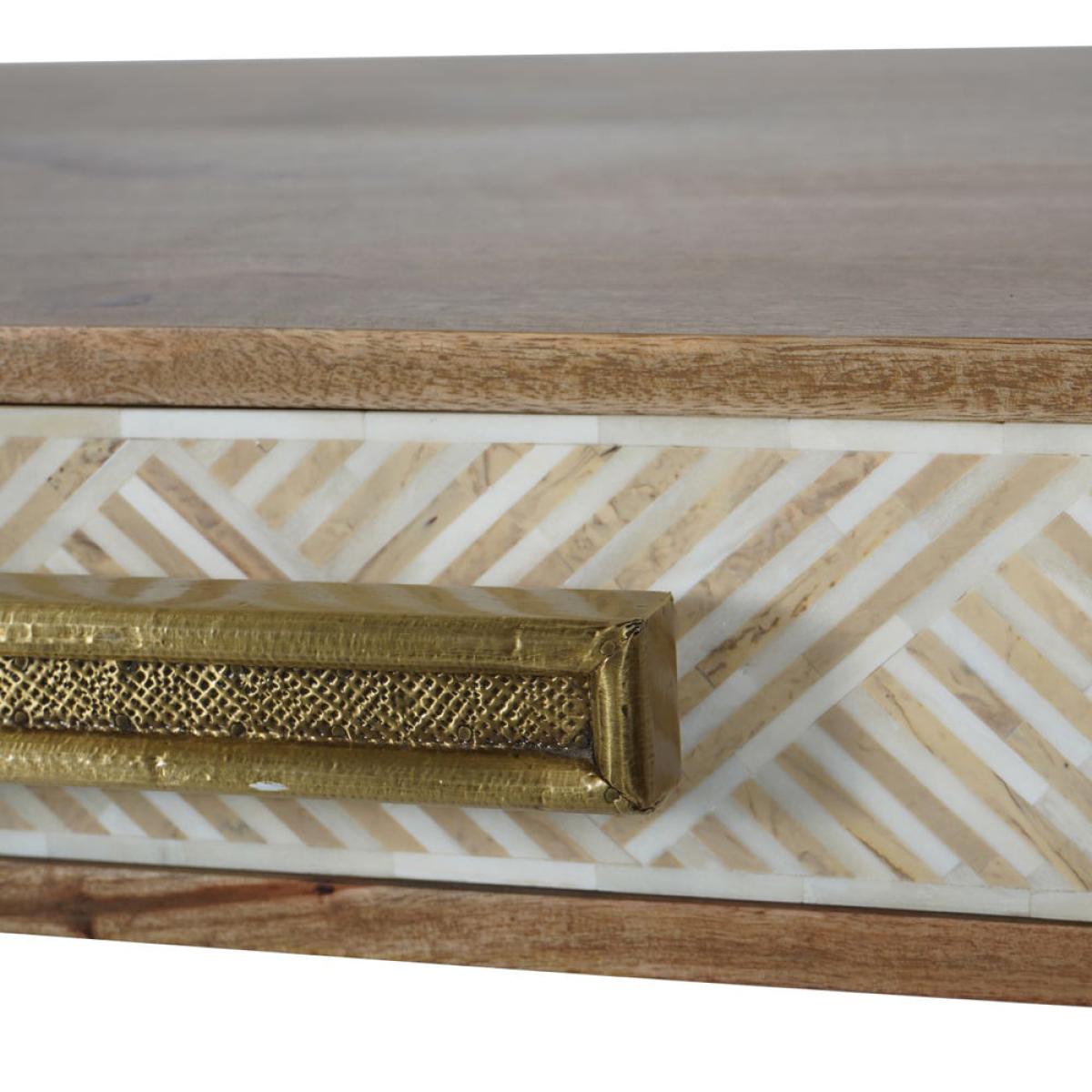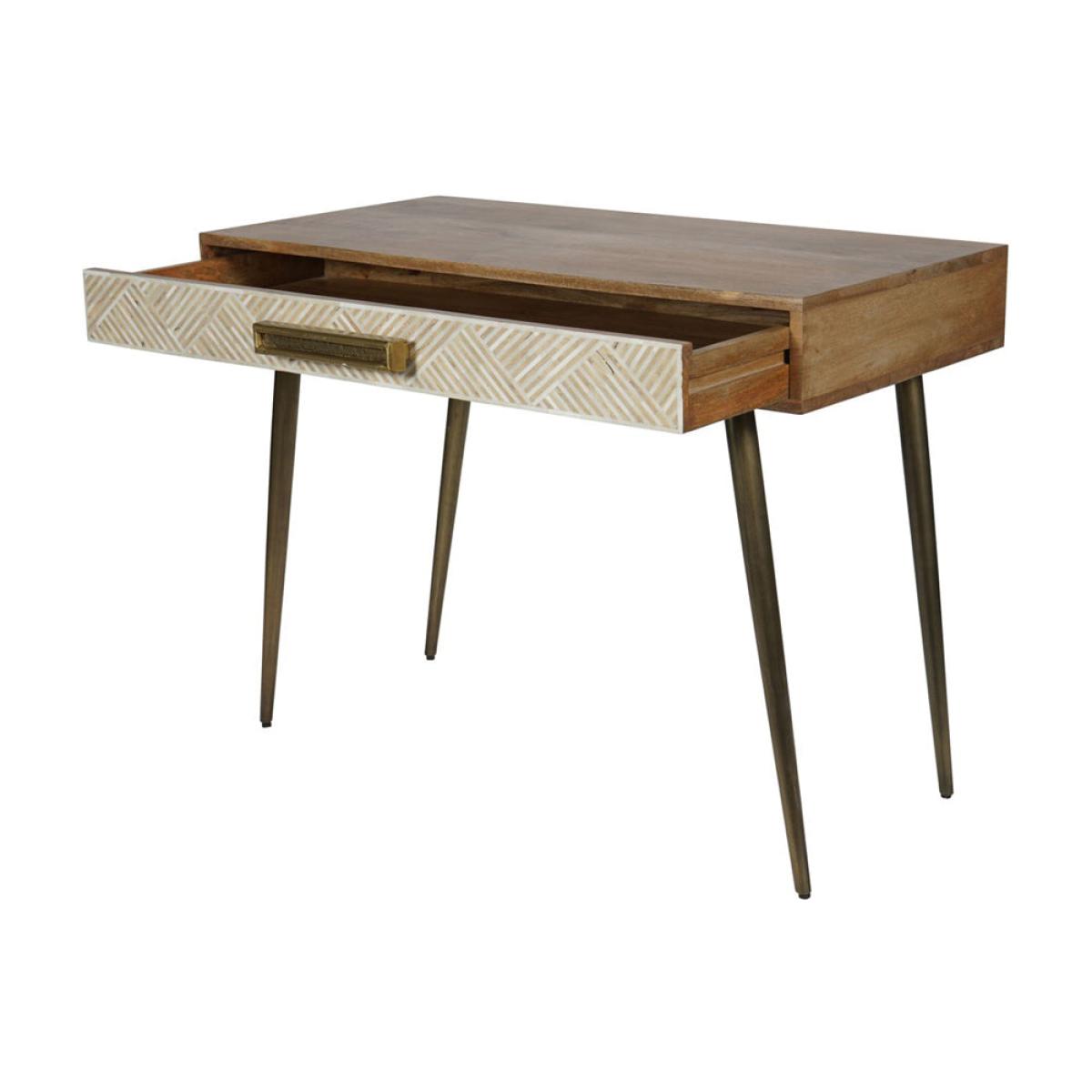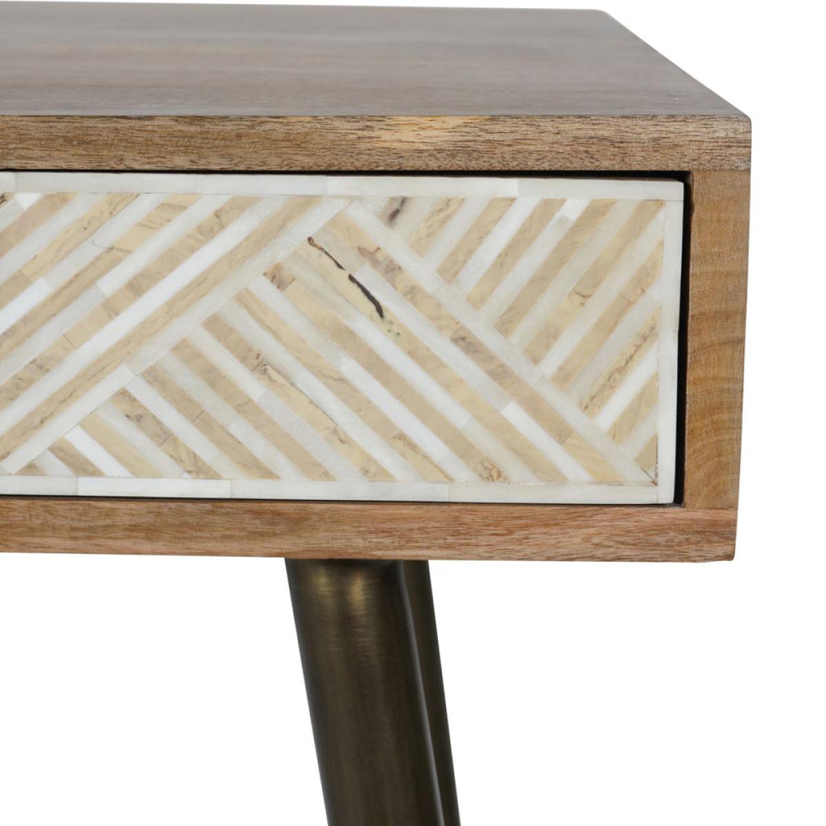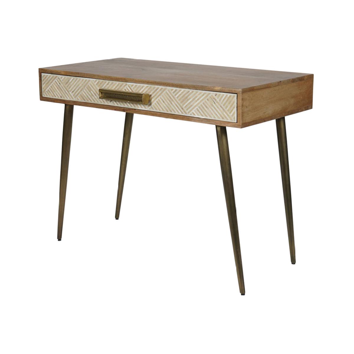 Introducing our Linden furniture Collection. Sustainable Mango wood frames encase ethically sourced bone in a calm ivory colour palette with aged gold metal handles and legs. Bone inlay is expertly applied to panels in a geometric formation, and paired with a complimentary toned soft grey resin. The natural beauty of the wood is visible on the top of this desk table, which could also pair as a console table or dressing table, perfect for a hallway or dressing room. Dimensions: H: 75 x W: 100 x D: 50 cm Materials: 60% Mango Wood, 35% Bone Resin, 5% Iron Assembly Required:Yes Care Instructions: Dust with a dry, soft cloth
