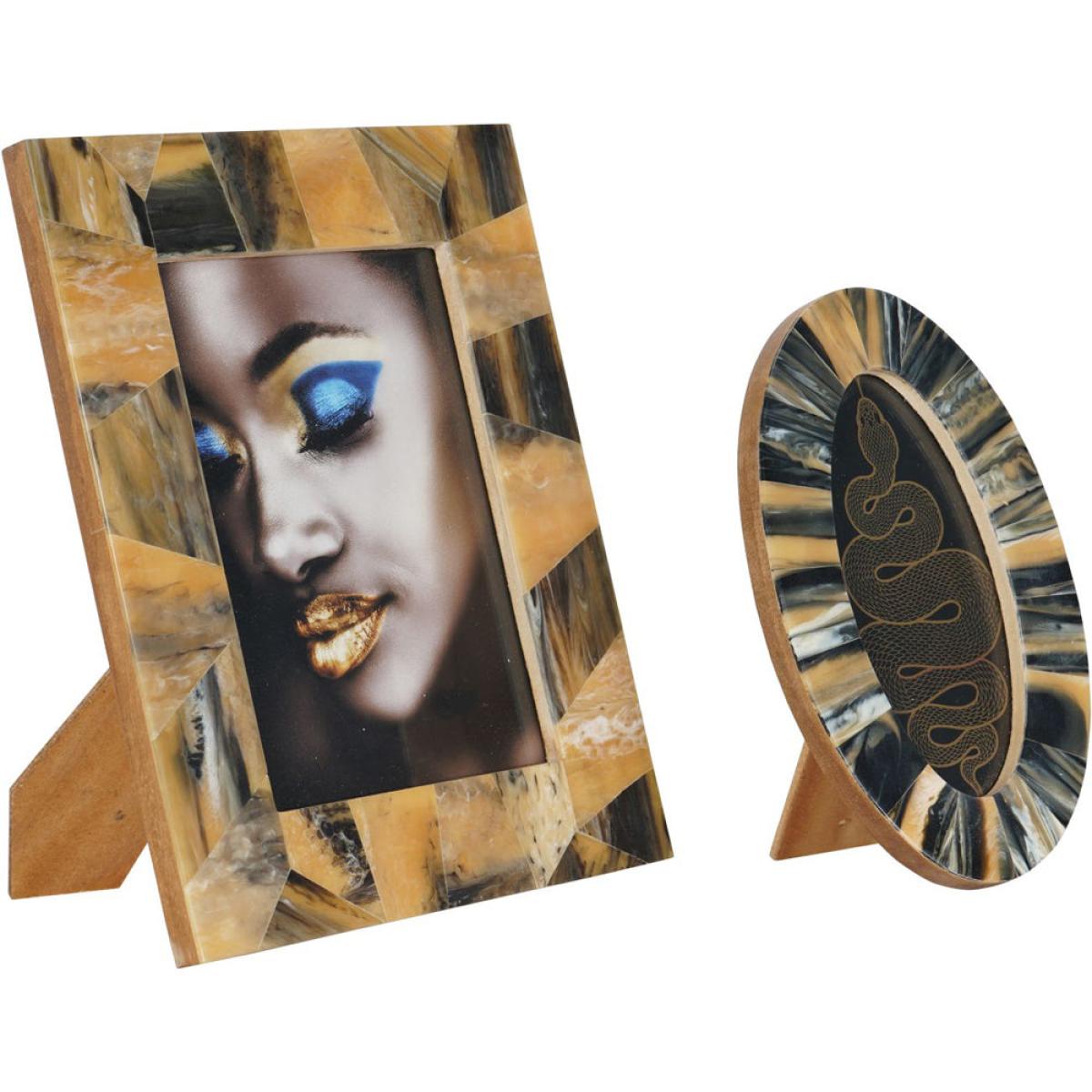This unique oval photo frame has a beautiful tortoiseshell effect frame, made in durable polyresin, it features natural tones of browns and creams. It features a stylish fashion photo insert, which can be easily interchanged. Dimensions: H: 19 x W: 12 x D: 1.3 cm Materials: Polyresin Assembly Required: No Care Instructions:Dust with a dry, soft cloth