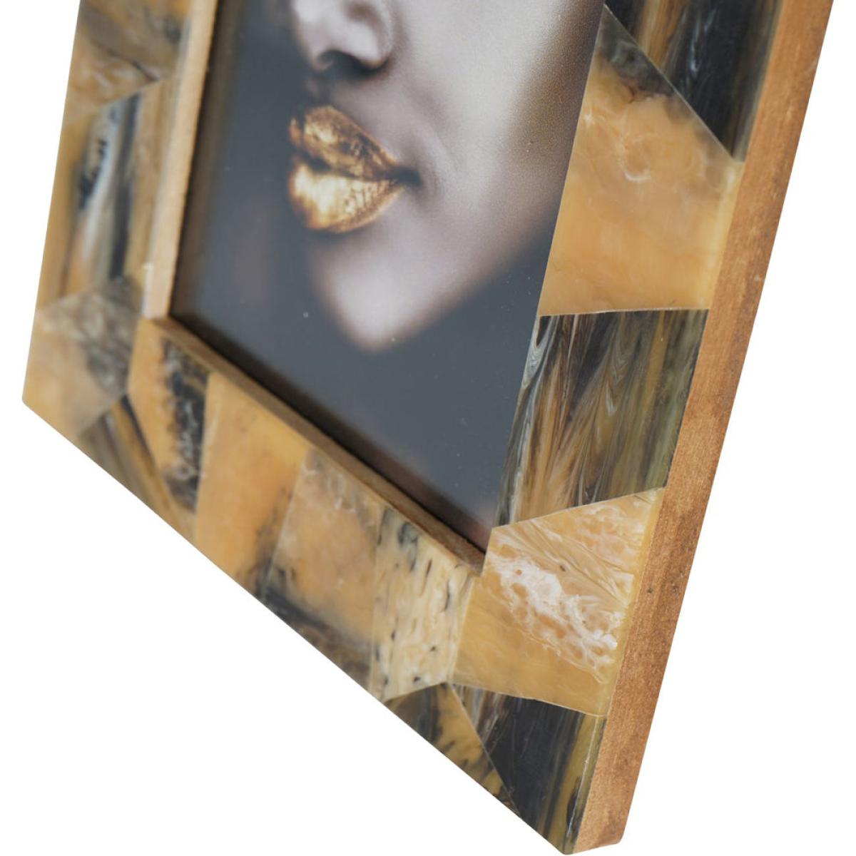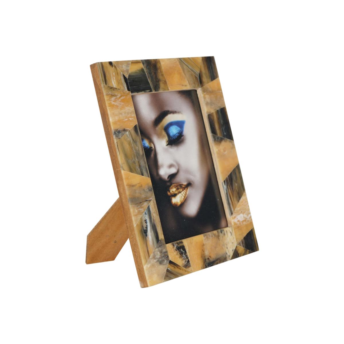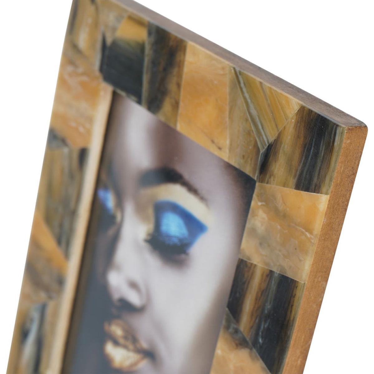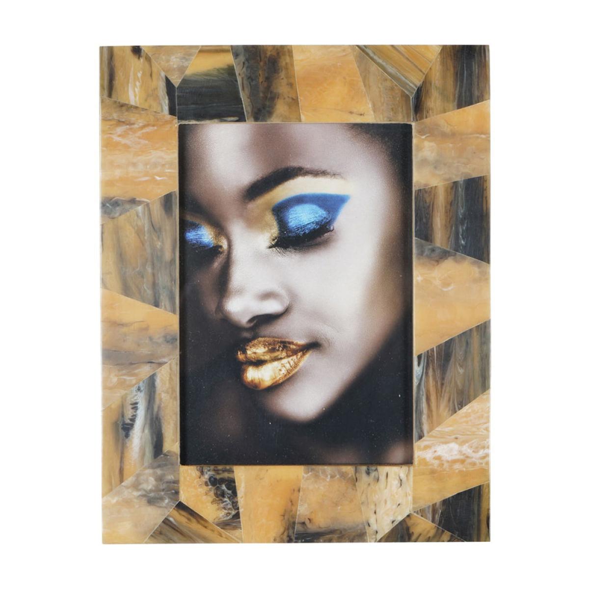 This 5x7" rectangular photo frame has a beautiful tortoiseshell effect frame, made in durable polyresin, it features natural tones of browns and creams. It features a stylish fashion photo insert, which can be easily interchanged. This table standing photo frame can be displayed Portrait or Landscape. Dimensions: H: 24 x W: 19 x D: 1.3 cm Materials: Polyresin Assembly Required: No Care Instructions: Dust with a dry, soft cloth