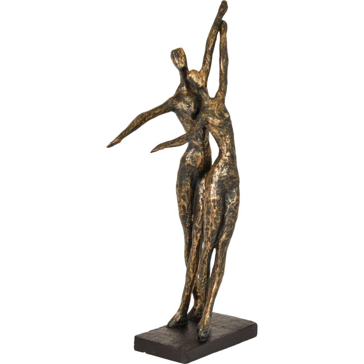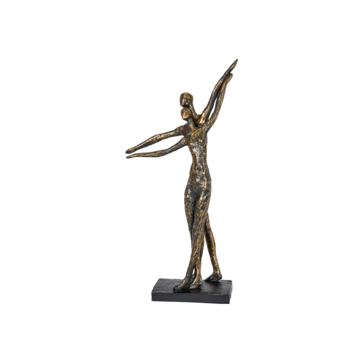 Cast in bronze resin, this sculpture depicts a couple in a celebratory dance pose. Their elegant forms are raised up, arms held high - the female figure holding the male's arms aloft. The male counterpart's chin rests on her head - suggesting a symbiosis of support. Standing 42cm high, this is a beautiful sculpture to adorn your home and appreciate for years to come. Weight: 1kg Dimensions:W 20 x D10.2 x H 42cm Base Material: Polyresin Colour: Bronze