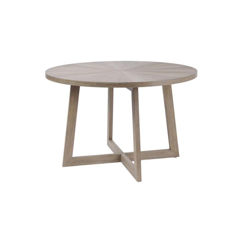 Dowell round mindi wood dining table. The table has a radial wooden inlay design on the top and a cross frame leg design adding a modern twist to this traditional look.