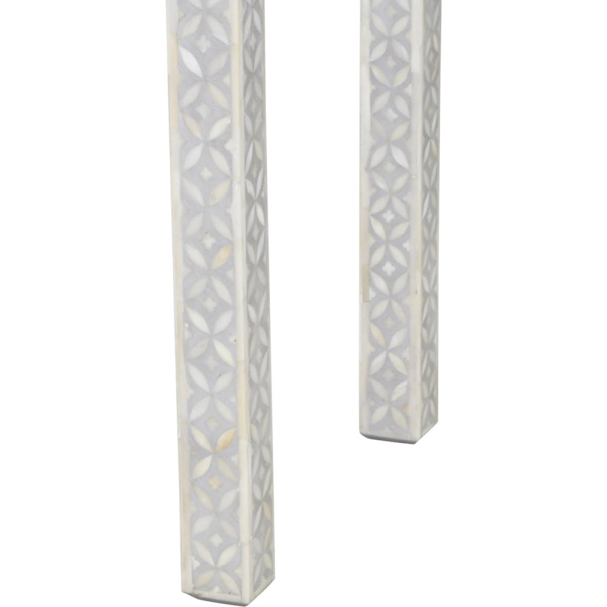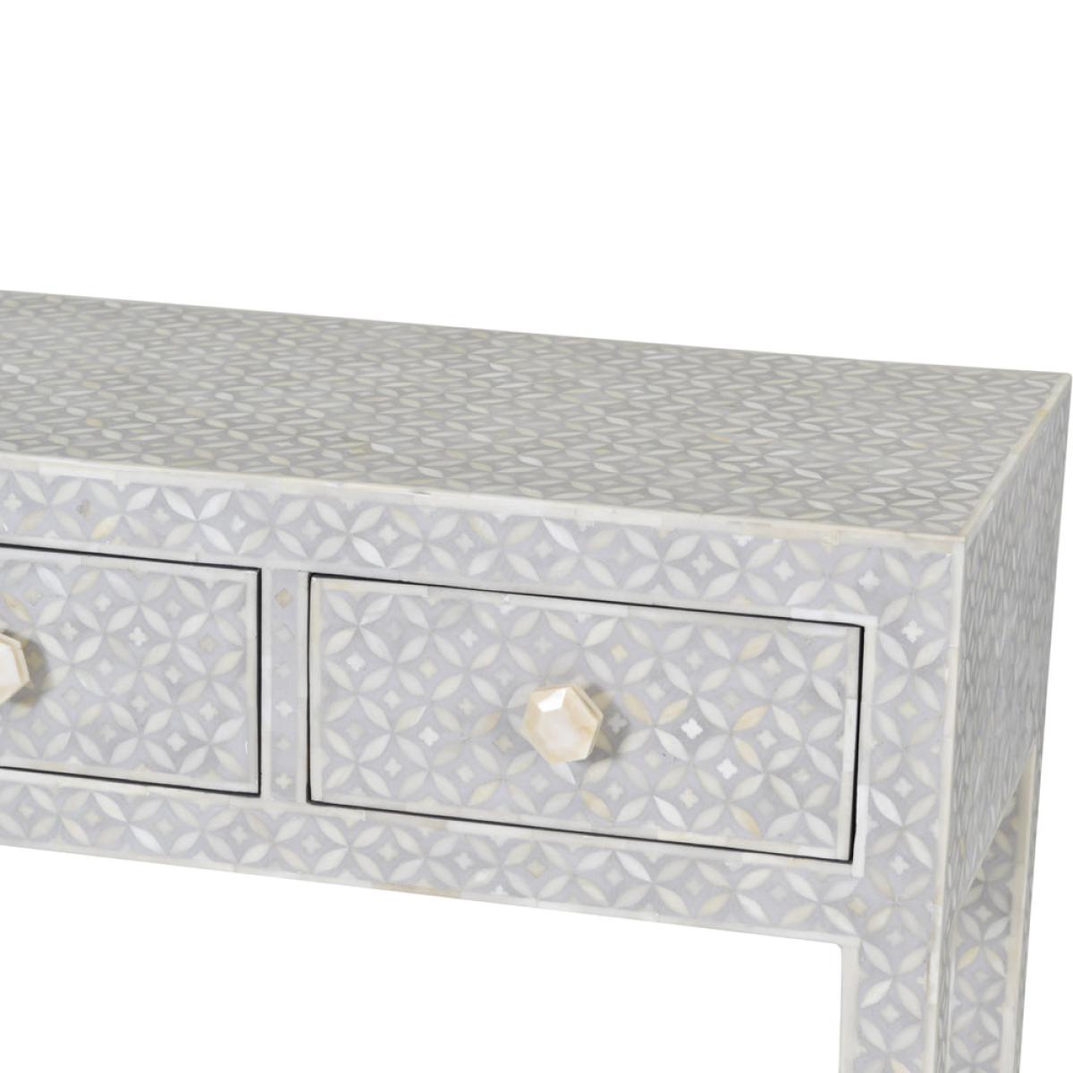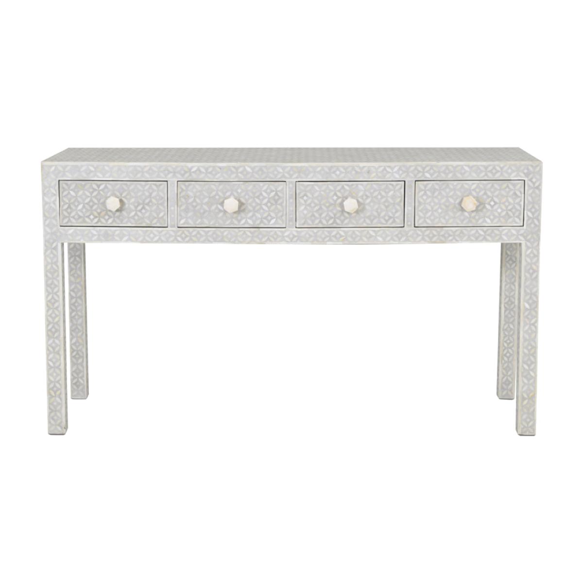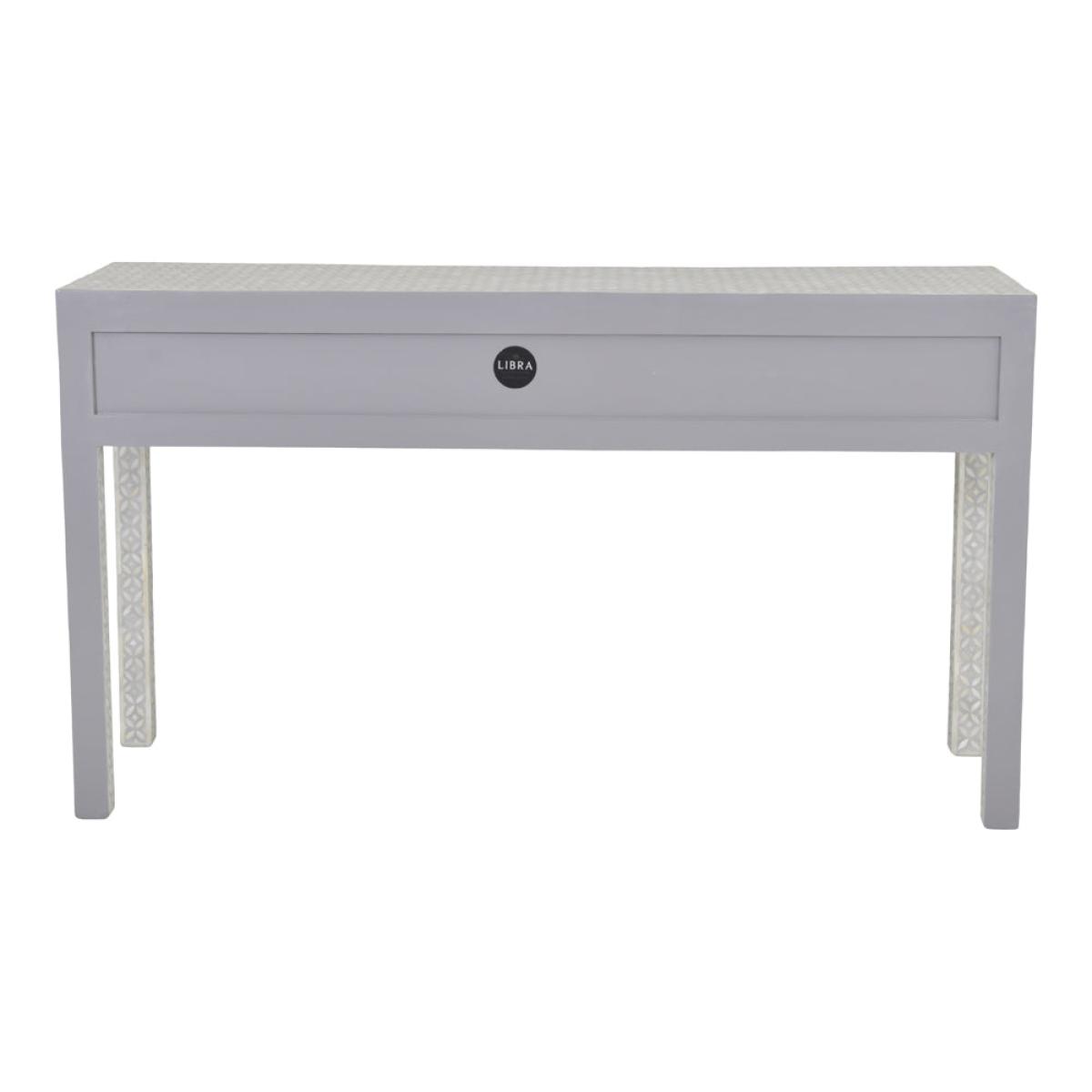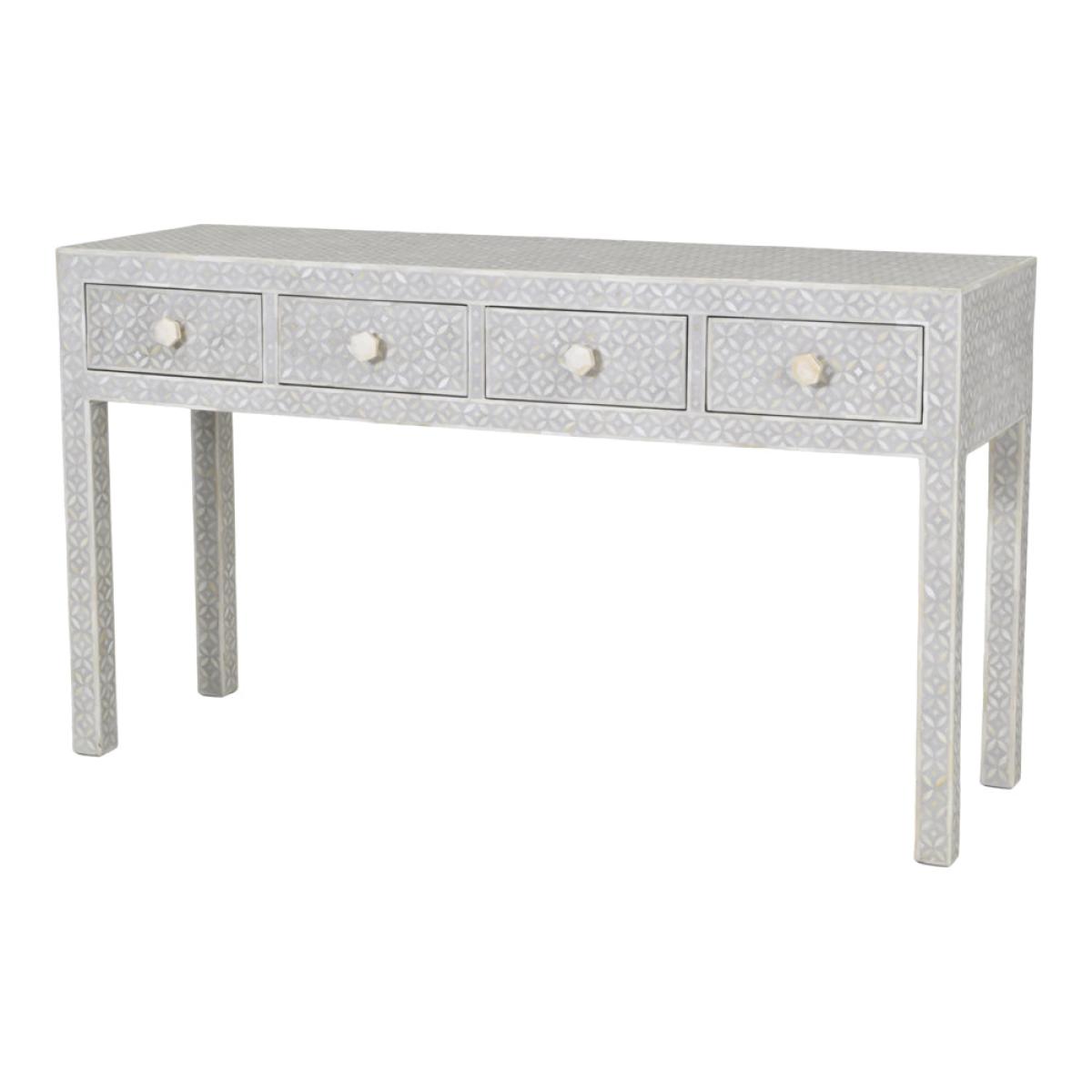 The Libra Floreat is a stylish console table with a beautiful geometric style bone inlay pattern. The four drawers have hexagonal handles and give the table functionality as well as style, meaning. View More. The Libra Floreat is a stylish console table with a beautiful geometric style bone inlay pattern. The four drawers have hexagonal handles and give the table functionality as well as style, meaning it would be perfect in your entryway to house essentials like keys, gloves and sunglasses. In addition, the console can be used to display treasured photos, ornaments and candles. The delicate grey and neutral tones of the pattern give a neutral feel, allowing it to blend tastefully with a variety of colour schemes. The table's width is 135. 5 cm, depth is 40 cm and its height is 76. 25cm.