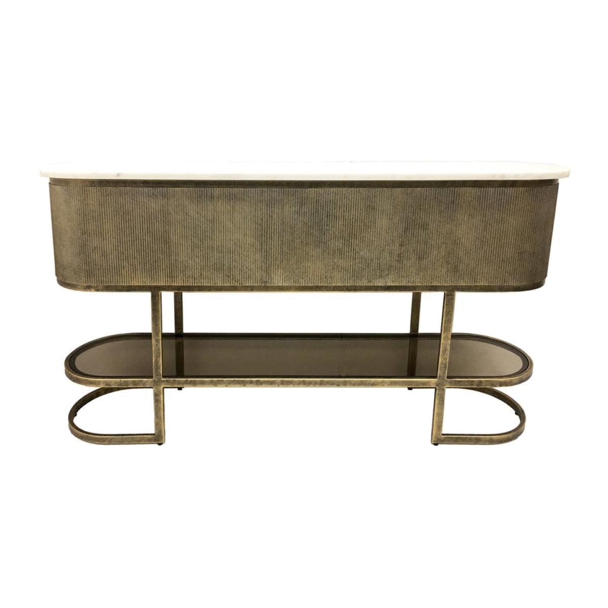 Create an elegant entryway with the Libra Interiors Belvedere Large Console Table with Shelf. This console table features a champagne-finished iron frame with a white marble top, adding a touch of sophistication to your hallway decor. With its generous size and additional shelf, it provides ample space for displaying decorative accents, keys, and mail. Whether placed in your hallway or foyer, the Belvedere Console Table is sure to make a statement. Crafted from high-quality materials, it is as durable as it is stylish. Elevate your home decor with the timeless elegance of the Belvedere Console Table from Libra Interiors.