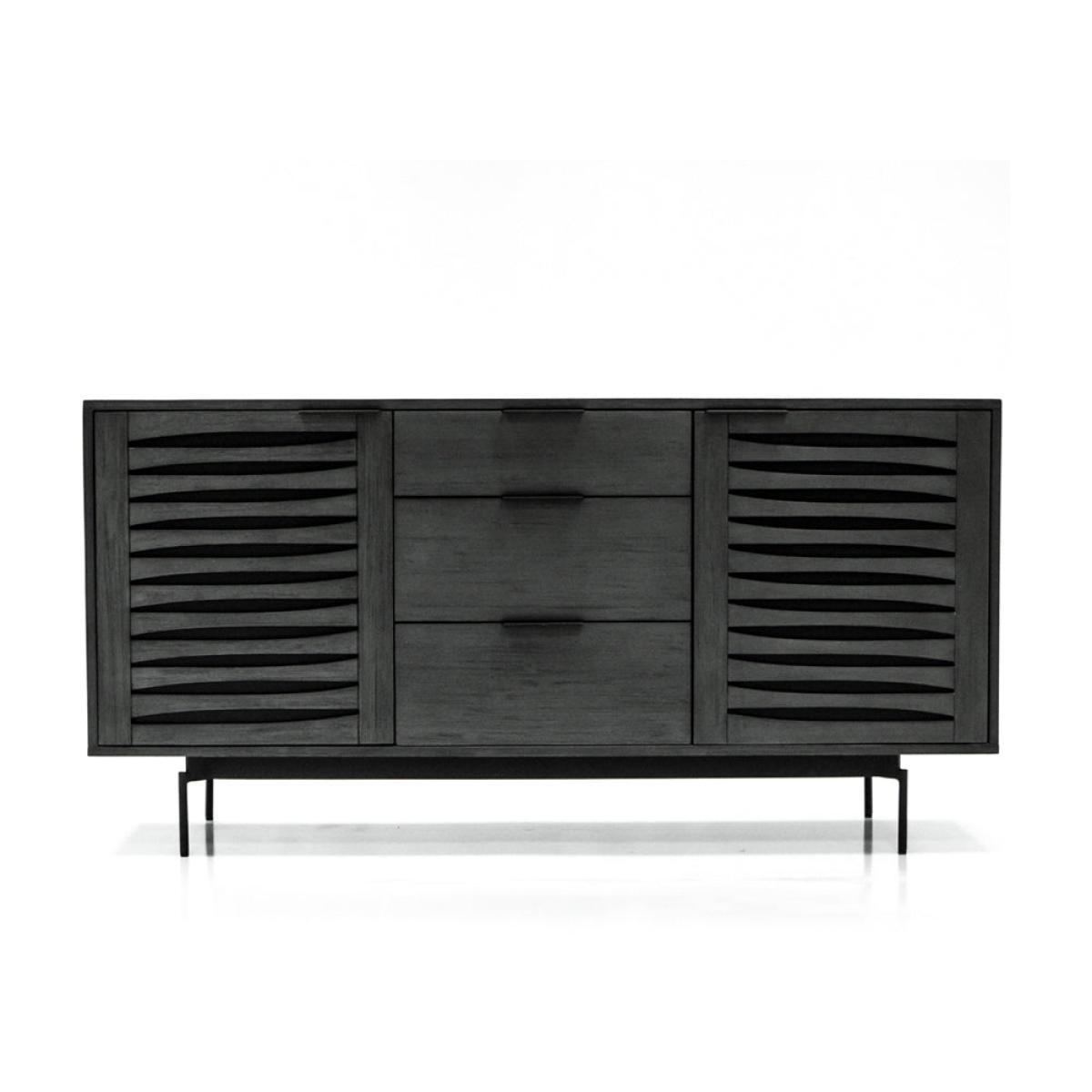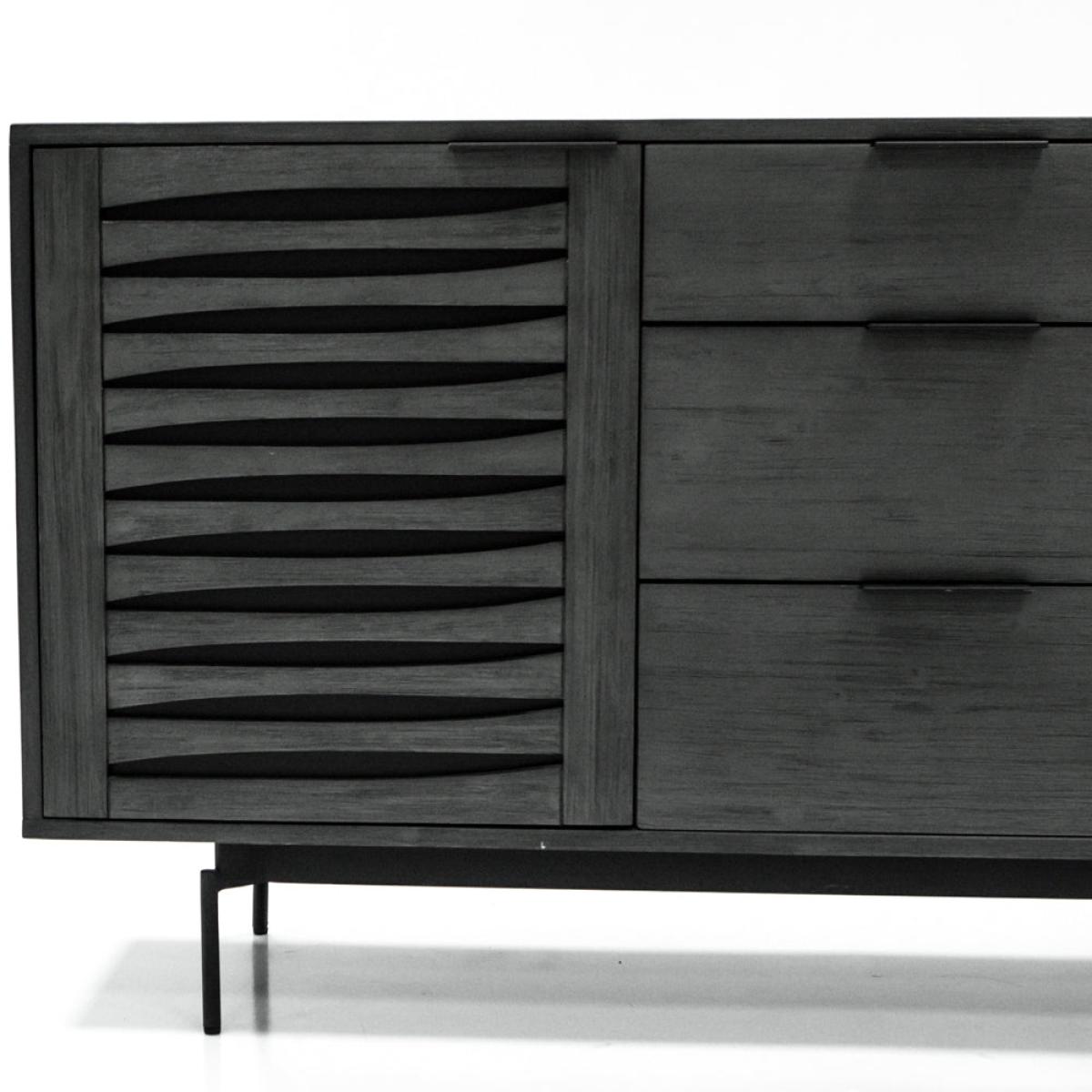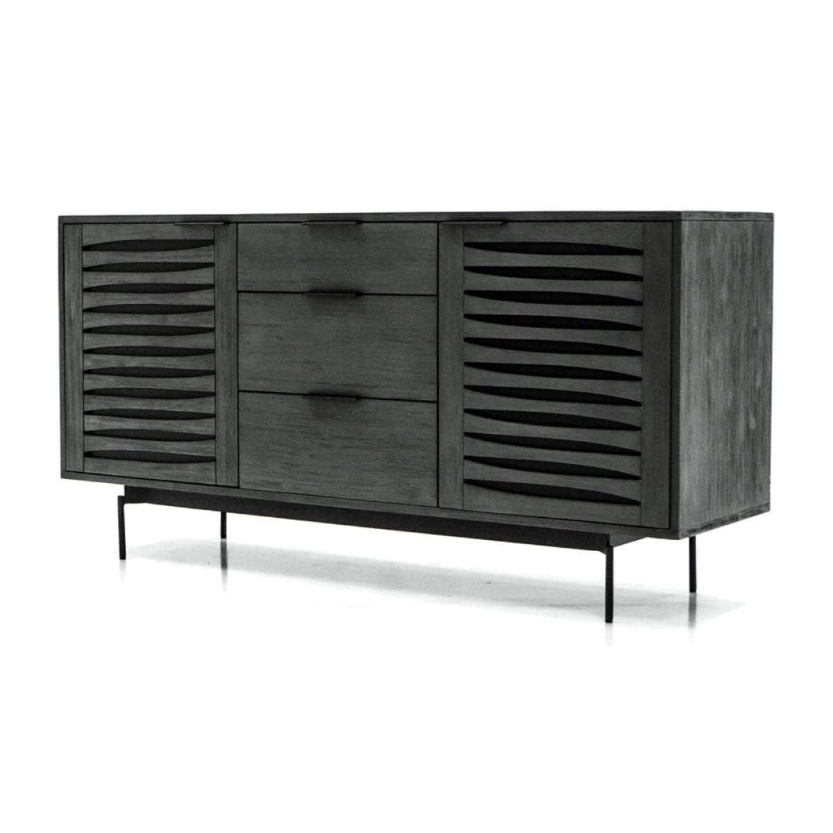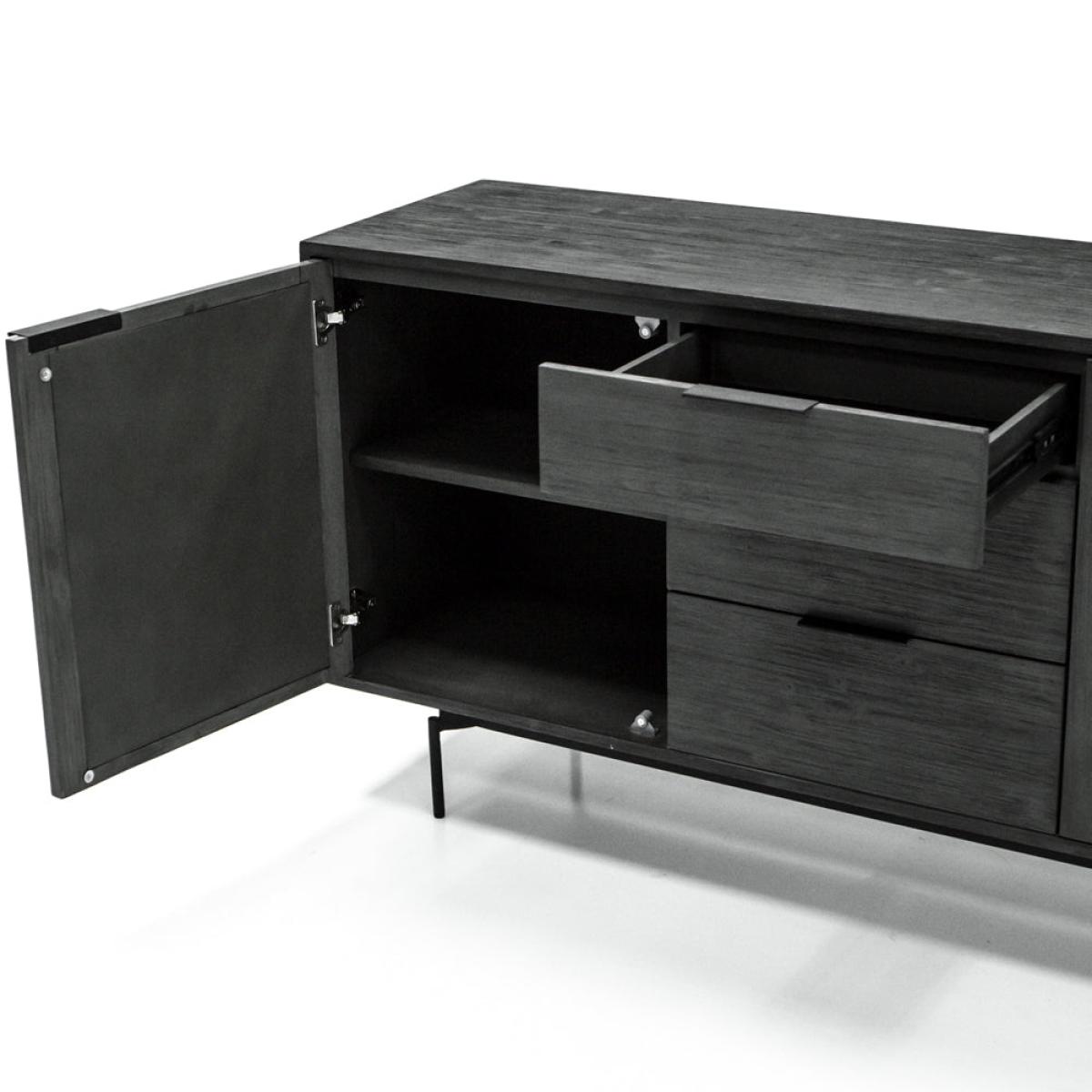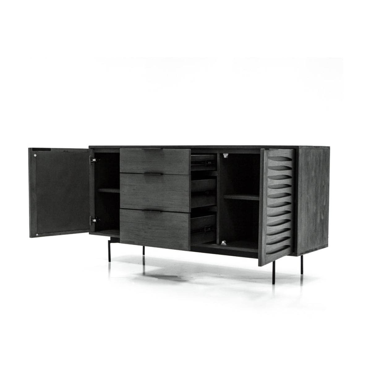 Add functional storage and rustic charm to your dining room with the Libra Interiors Bronx Black Acacia Wood Sideboard. Crafted from solid acacia with an MDF veneer and metal base, this sideboard exudes industrial-inspired style. Its dark wood finish and clean lines create a striking silhouette, while the spacious cabinets offer ample storage for dining essentials. Whether used for serving or display, it adds character and versatility to your space. Perfect for casual or formal dining areas, this sideboard combines form and function beautifully. Elevate your dining room decor with the Bronx Sideboard from Libra Interiors.