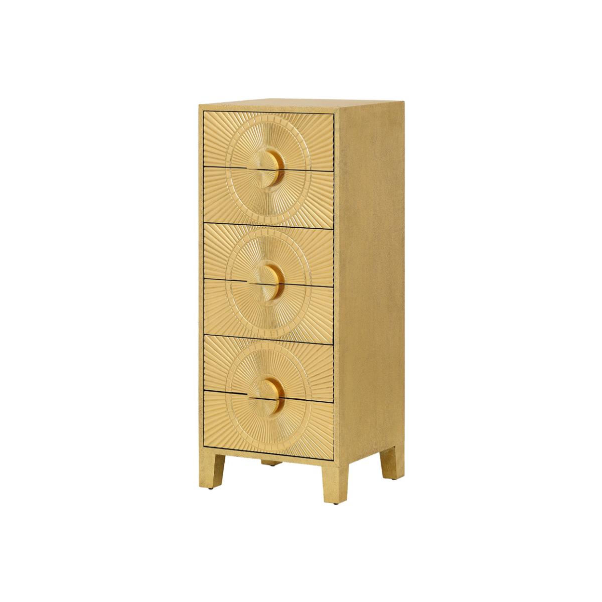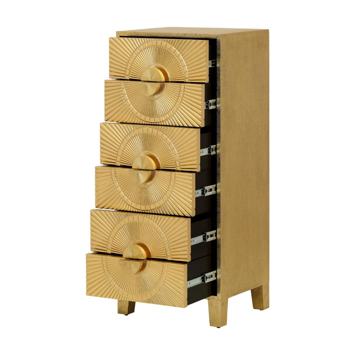 Add storage and style to your bedroom with the Libra Interiors Coco Gold Embossed Metal 6 Drawer Tall Boy. Crafted from wood and metal, this tall boy exudes modern elegance. Its gold embossed metal finish adds texture and visual interest, while the six drawers offer ample space for clothing and accessories. The tall, slim design makes it a space-saving solution for smaller bedrooms. Whether used on its own or paired with other Coco collection pieces, this tall boy adds a touch of luxury to your bedroom decor. Elevate your storage game with the Coco Gold Embossed Metal Tall Boy from Libra Interiors.