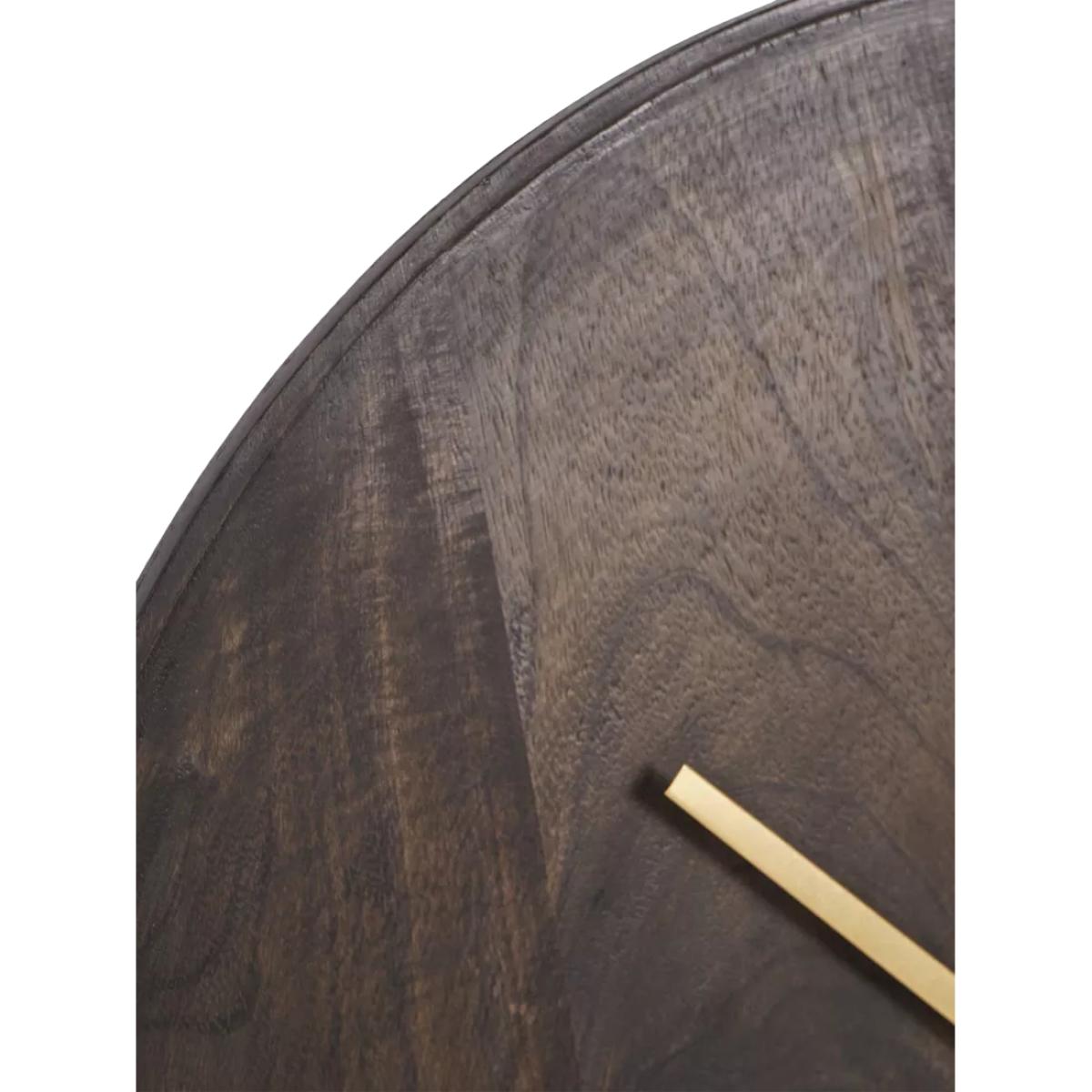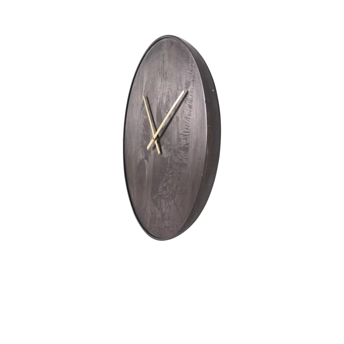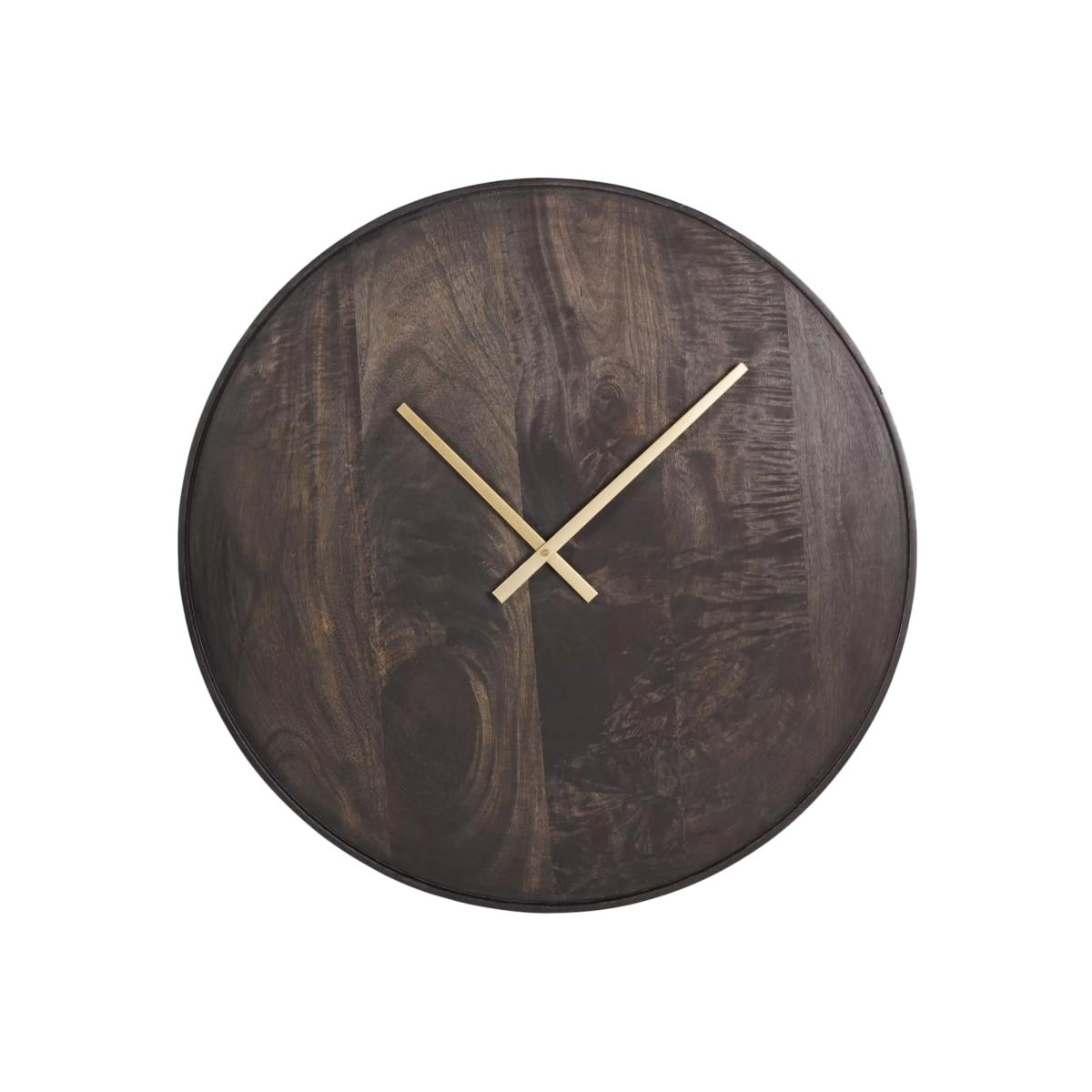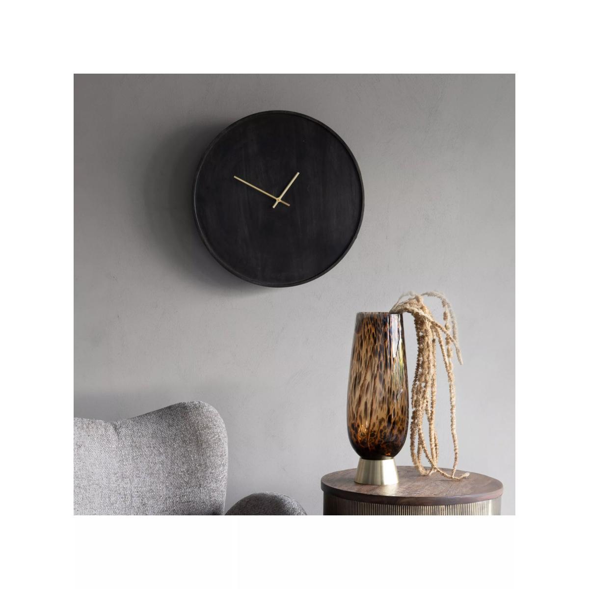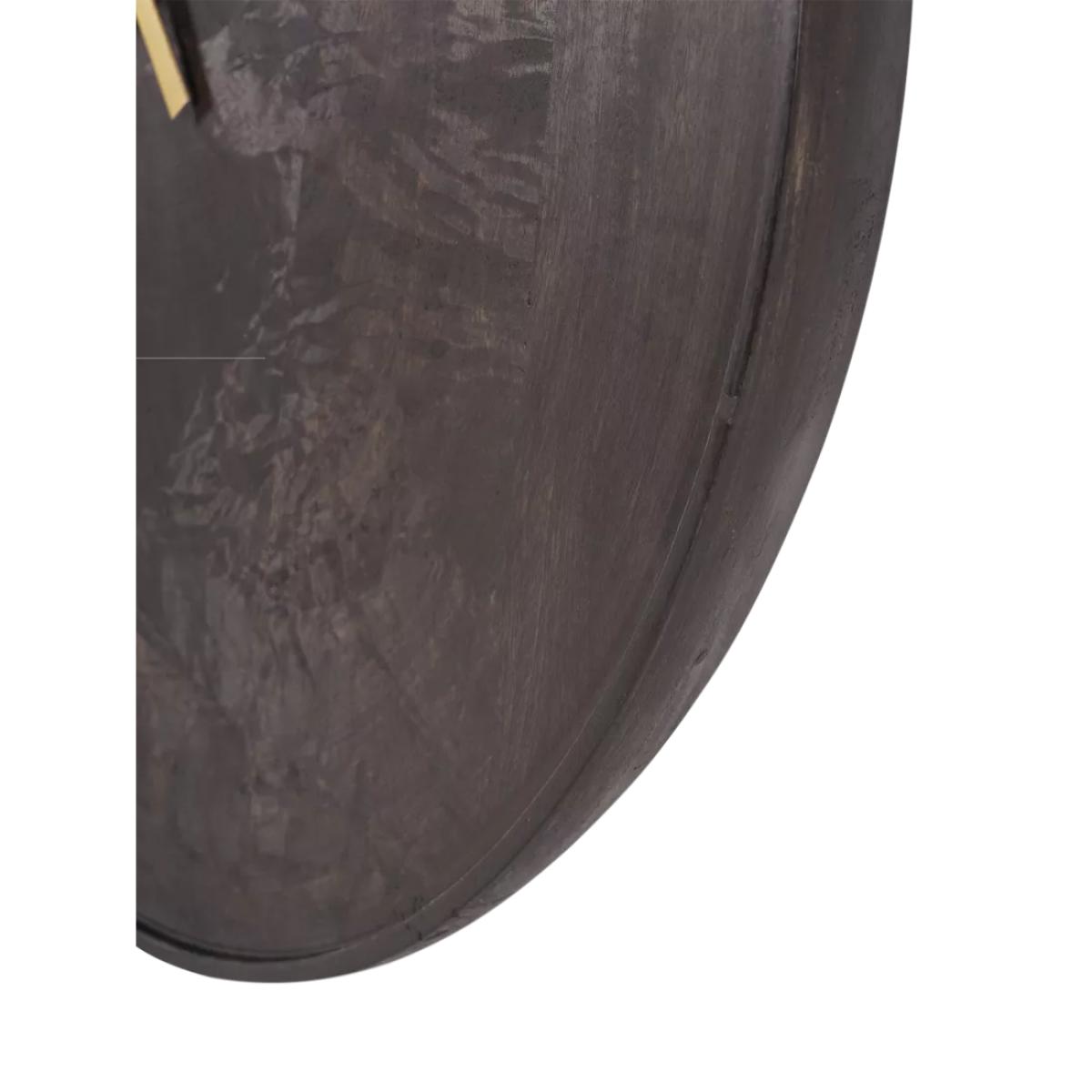 Wall clock with a black smoked finish, made from solid 100% mango wood for a modern, natural look. Contrasting antiqued brass hands add a striking finishing touch. This clock produces a gentle ticking sound, adding to its charm.