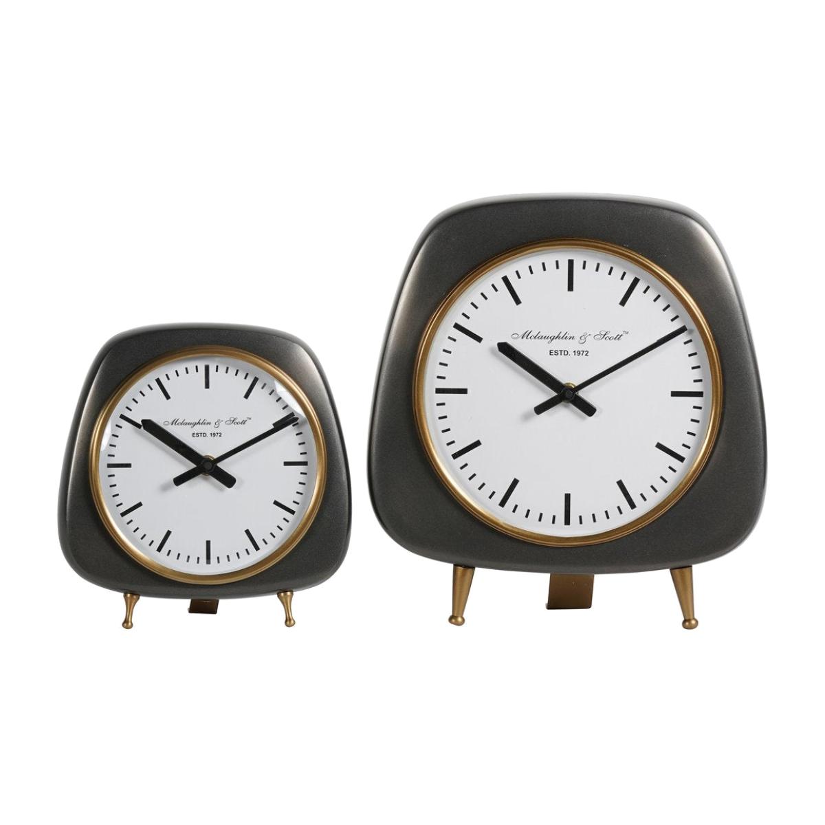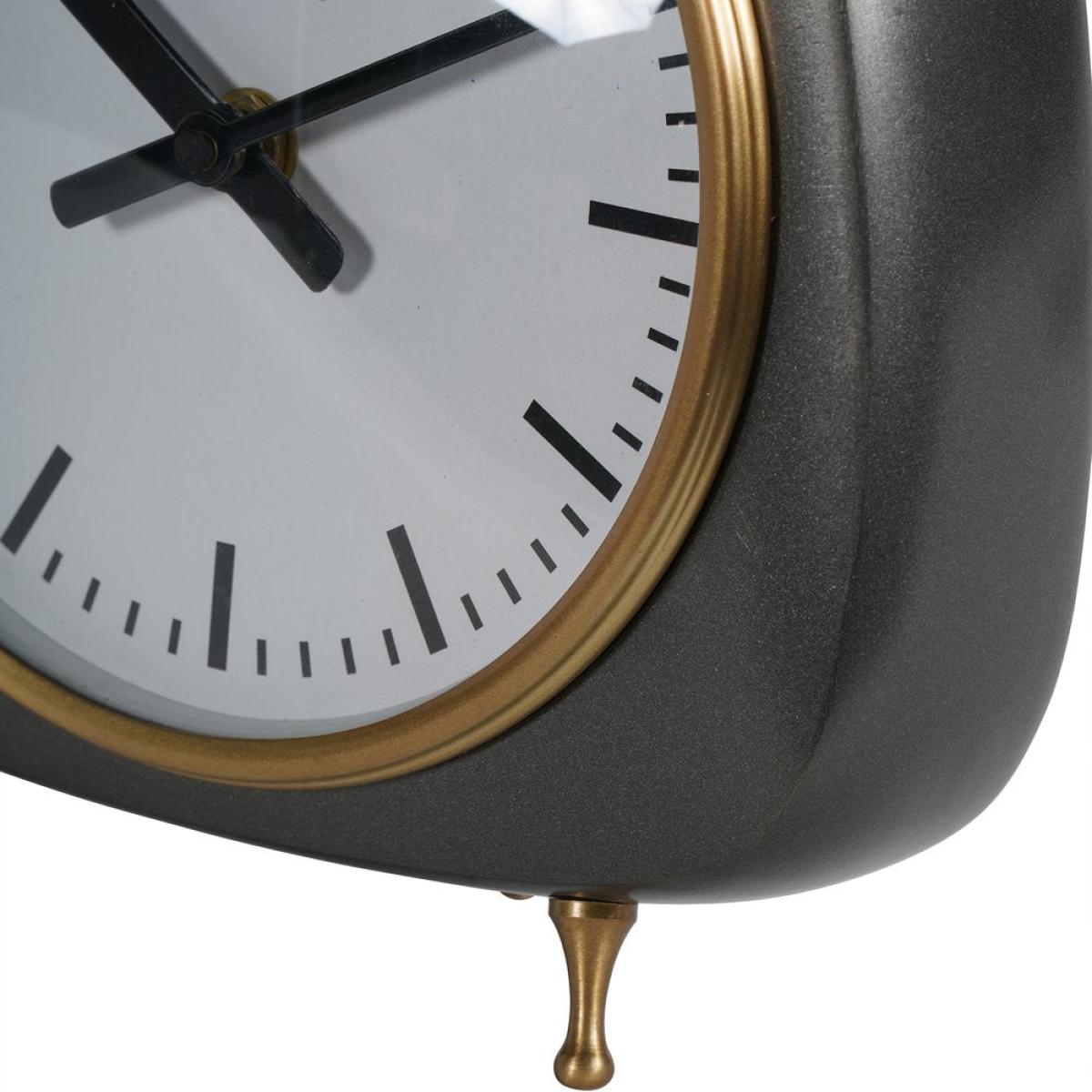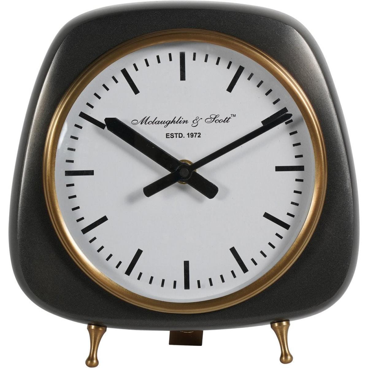 Quartz Clock on a gold metal distressed finish stand. The clock face is made from a light coloured natural Travertine which is one of the world's oldest building materials, which adds a sense of age and prestige to the home. Thanks to its soft palette of colours, travertine maintains a reserved dignity that is much more sublte than granite or marble. Clock features numeric markers and a quartz movement requiring 1 x AA battery (not included).