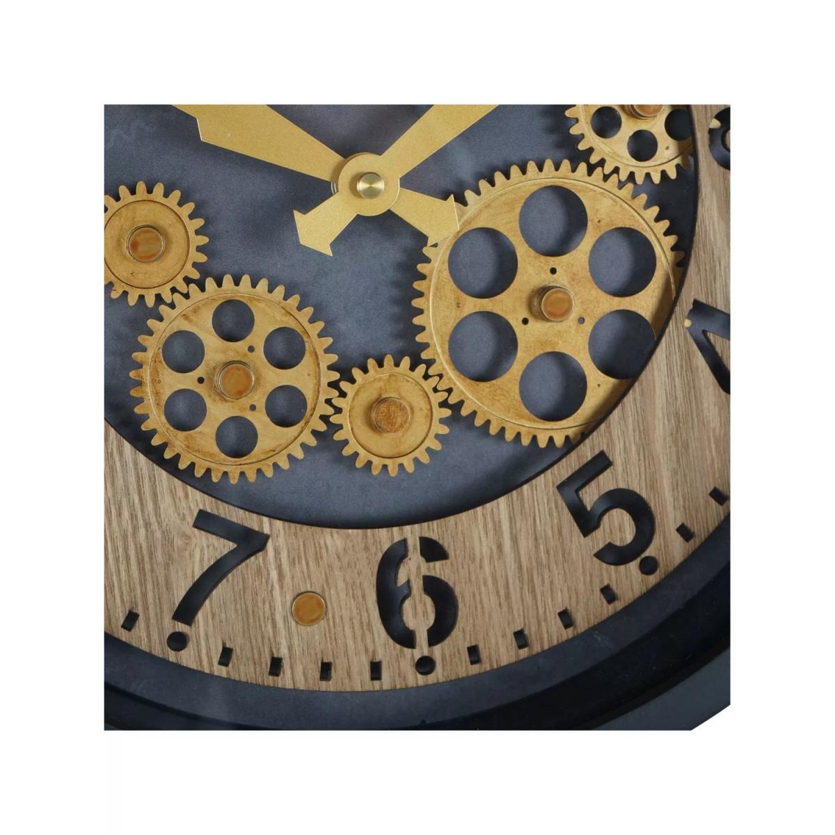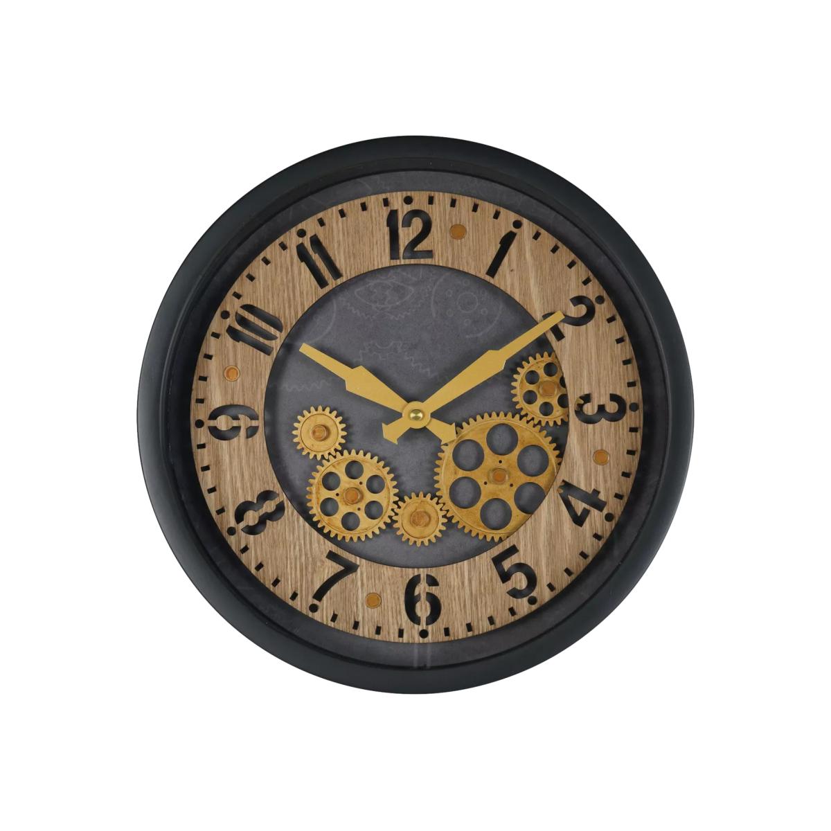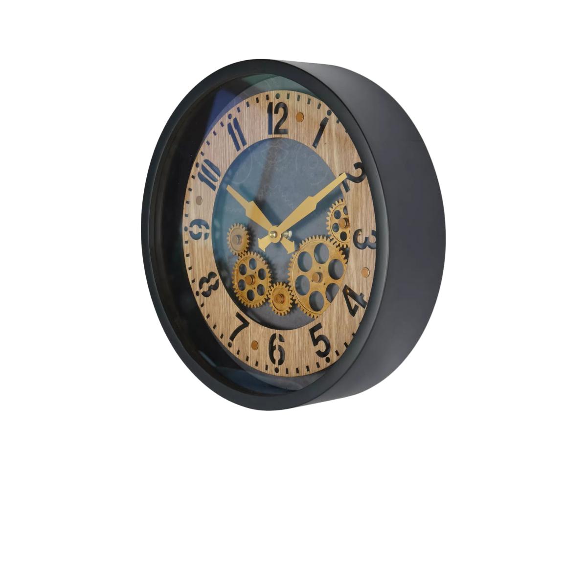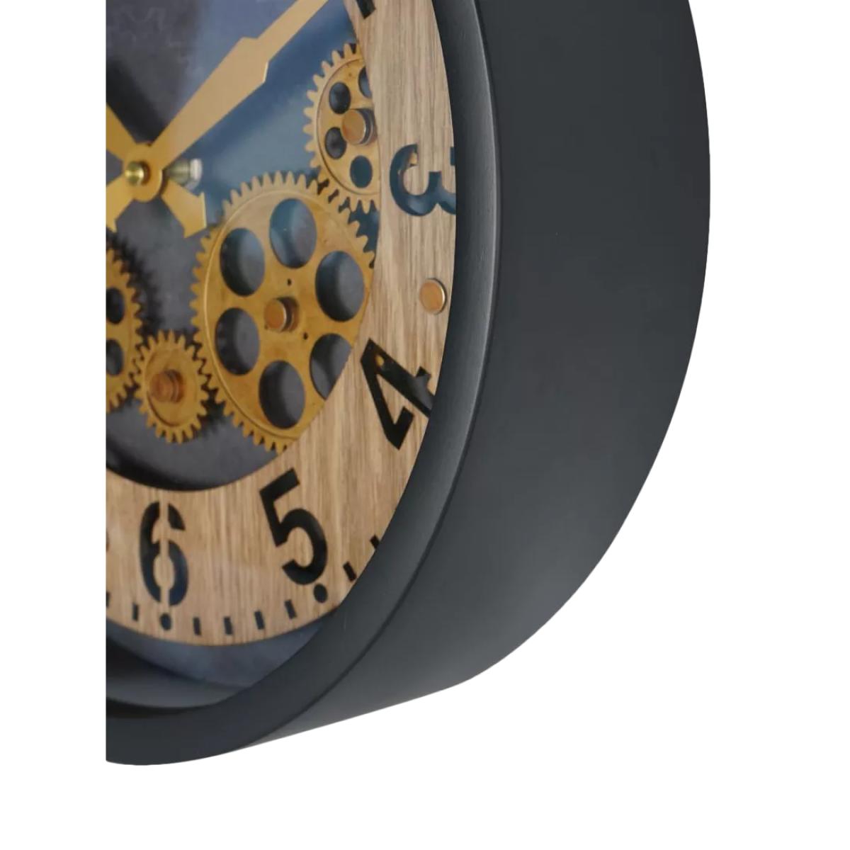 Palladium Wall Clock with moving cogs, a blend of sophistication and innovation. Crafted with precision, this clock features a painted black frame with intricate wooden dial cut-outs including on the classic hour numerals. Bold gold hands stand out against the black centre, while five moving brass-gold cogs add visual appeal. This clock produces a gentle ticking sound, adding to its nostalgic charm.