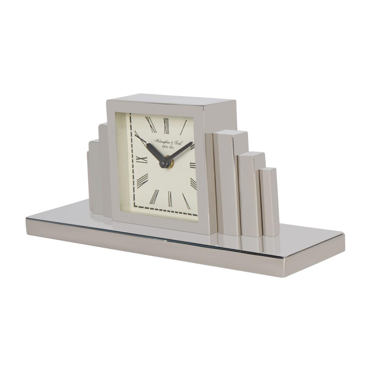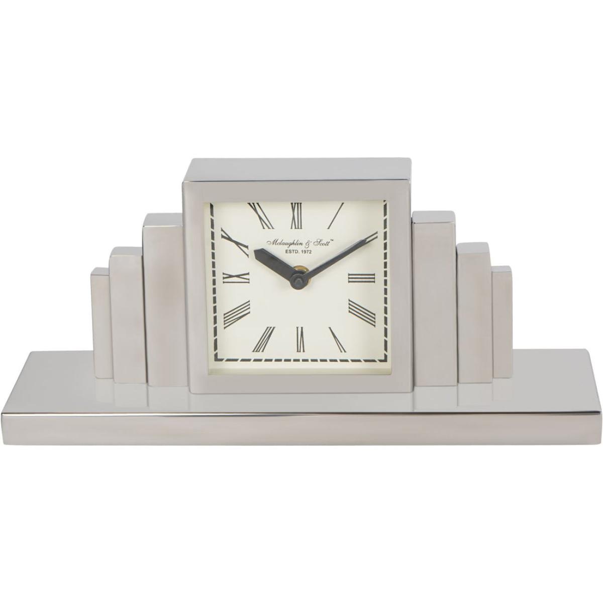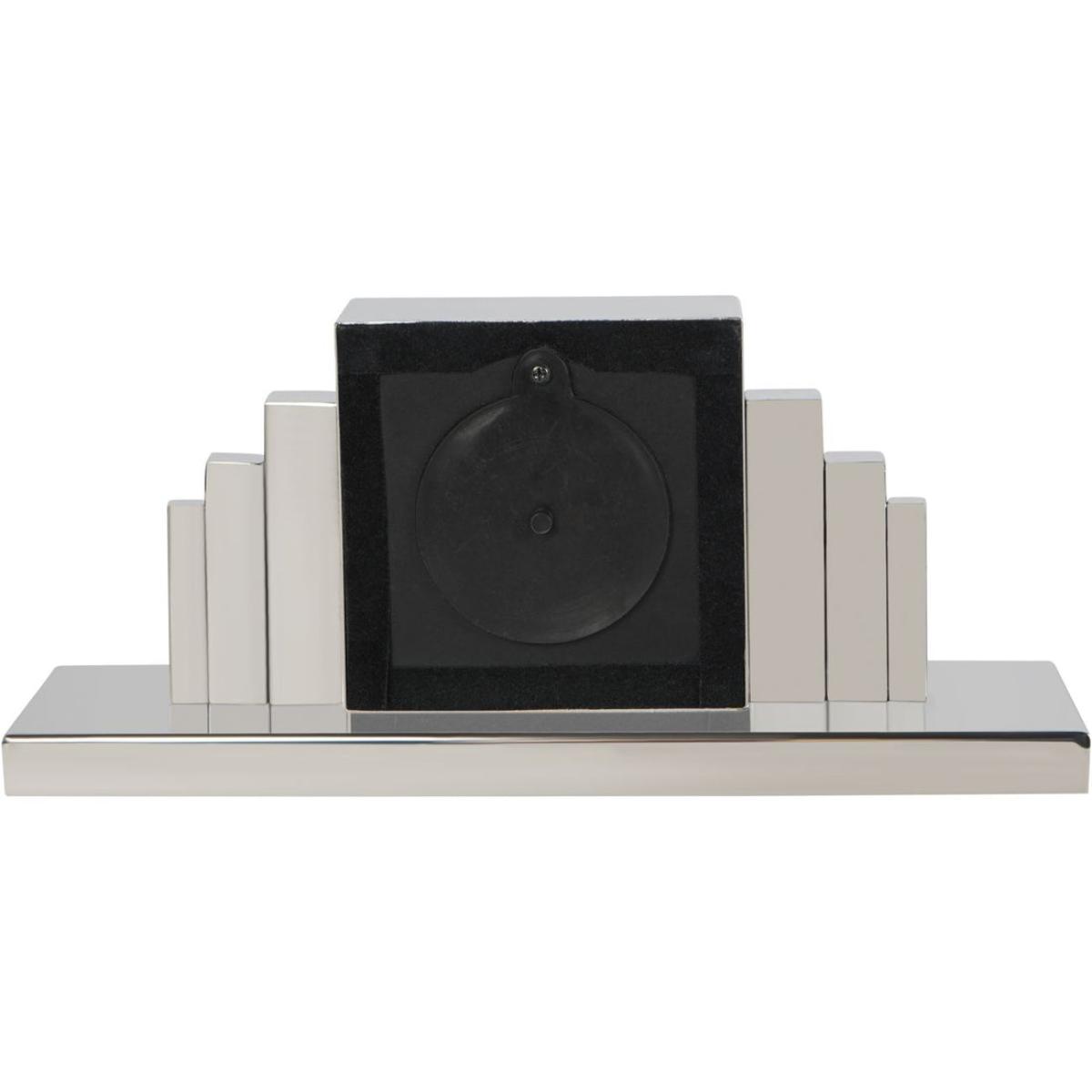 Enhance any space with the timeless elegance of the Plaza Nickel Mantel Clock. This silver nickel plated mantel clock features a sleek Art Deco design adding a touch of sophistication from a bygone era. With its clean lines and minimalist aesthetic, it effortlessly complements both modern and traditional decor styles. Keep track of time in style with this exquisite piece, a perfect blend of form and function for your home. Measuring W34.5 x D10.2 x H15.5. Dimensions: H: 15.5 x W: 34.5 x D: 10.2cm Materials: Steel Care Instructions:Wipe clean with a soft, dry cloth.