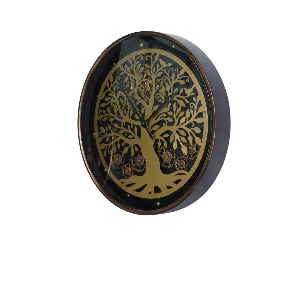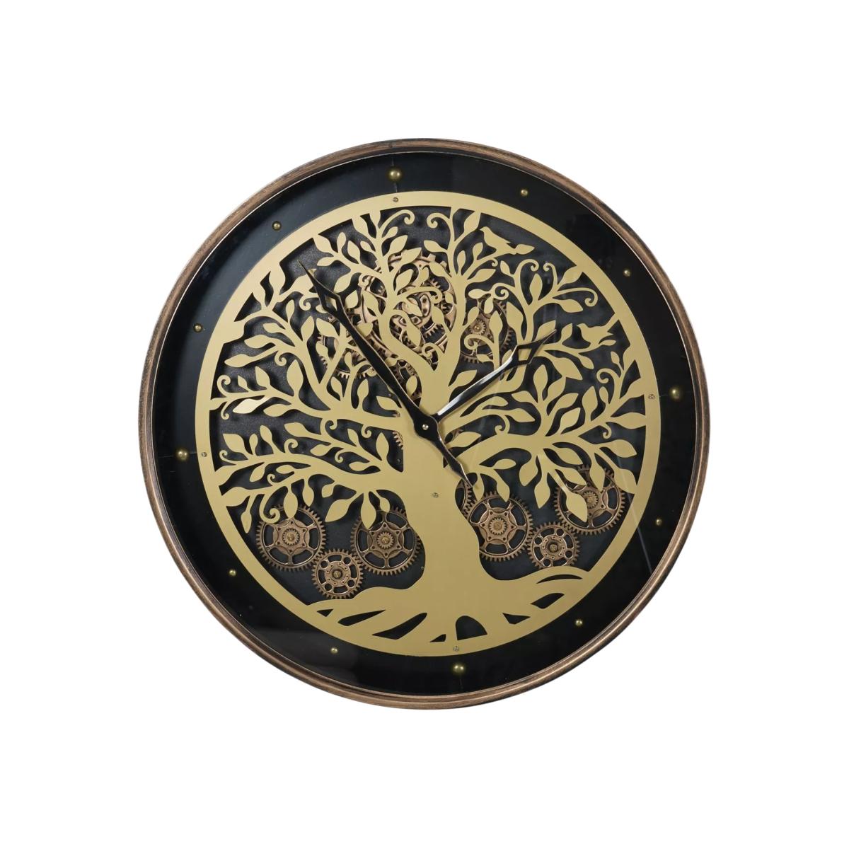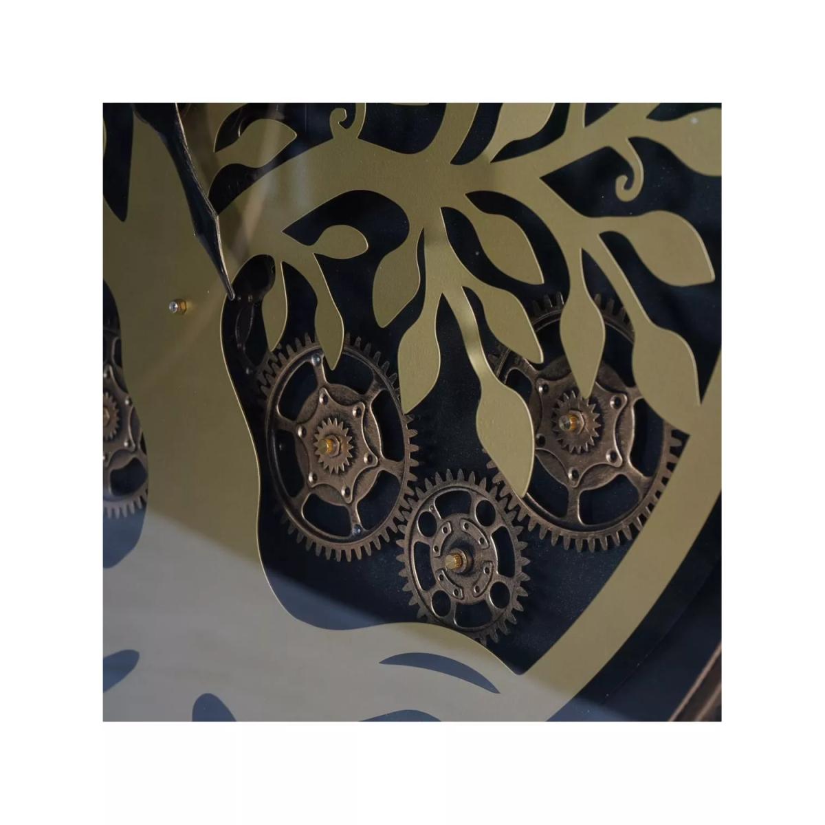 A captivating timepiece inspired by the majestic Tree of Life. Crafted with meticulous attention to detail, this wall clock features a stunning gold tree silhouette against a sleek black background behind a glass face. Intricately placed moving gold cogs behind the tree bring the design to life, evoking a sense of timeless wonder. The contrast between the rich gold tones and the deep black background creates a mesmerising visual impact, ensuring this clock becomes a focal point in any space.