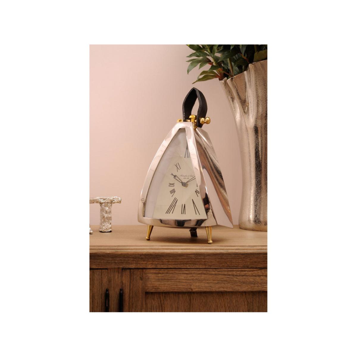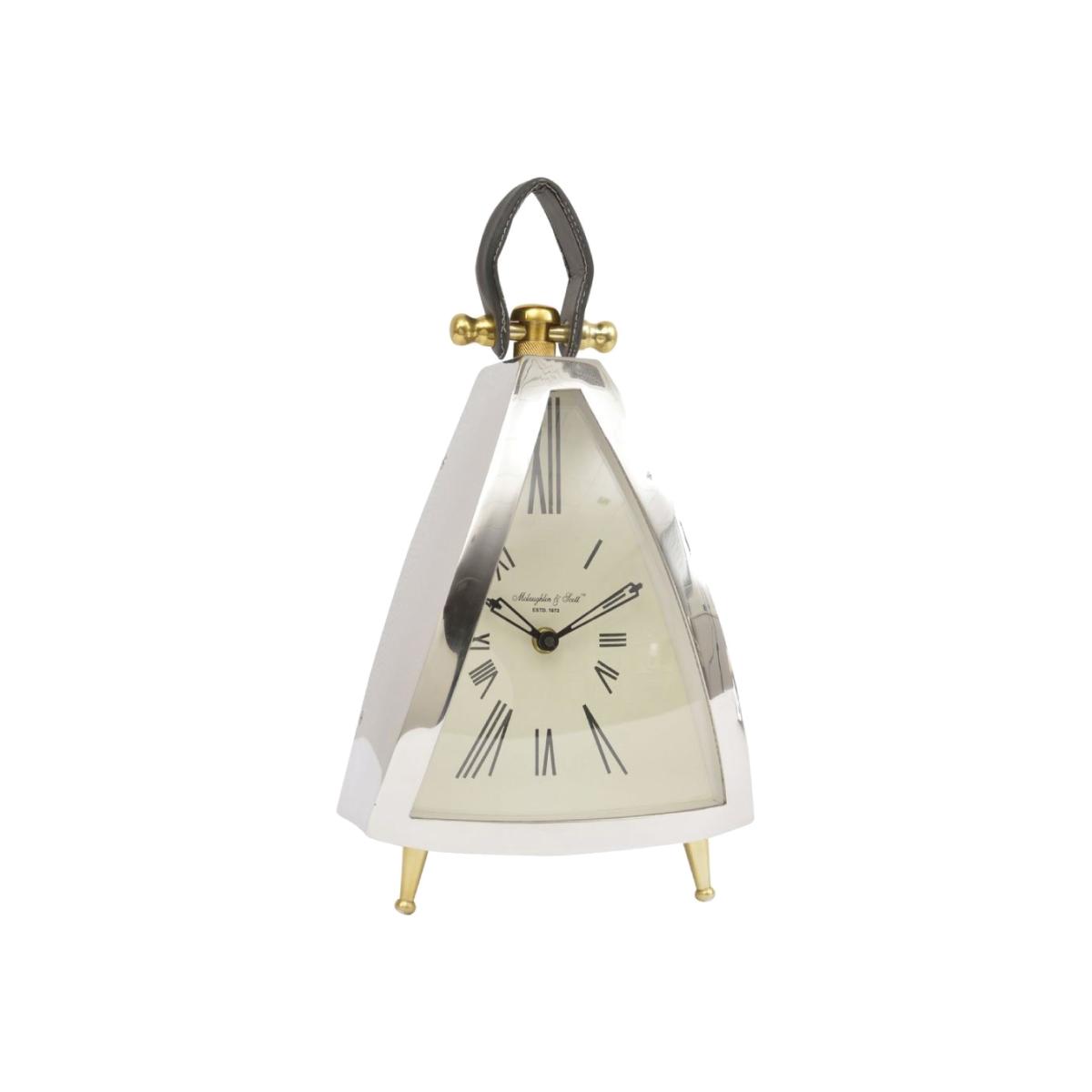 Add the finishing touches to your interior, with this beautifully designed mantel clock. Featuring a smart, black leather handle at the top of its design, this polished nickel curved mantel clock is perfect for any contemporary-meets-traditional interior. Brass fittings contrast against its unusual frame shape, whilst beautiful roman numerals on the clock face add a timeless touch to its design. Dimensions: W:20 x D:15 x H:36cm. Weight: 1.75kg
