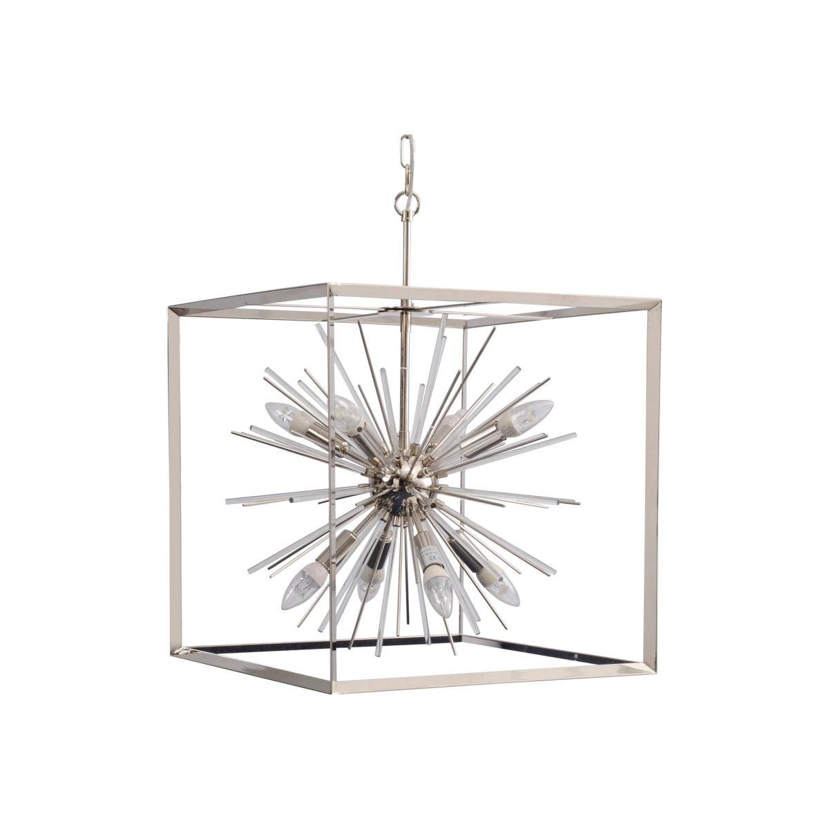 This contemporary chandelier is a real showstopper, perfect for making a statement. Featuring a central globe which is interspersed with acrylic and nickel rods and light bulbs, the pendant light d. View More. This contemporary chandelier is a real showstopper, perfect for making a statement. Featuring a central globe which is interspersed with acrylic and nickel rods and light bulbs, the pendant light design is reminiscent of a star burst. A silver cube frames the light, offering a nod to traditional hallway lighting. This pendant hangs from a 1 meter cord and chain, and comes with silver ceiling rose. Weight: 3. 36kg.
