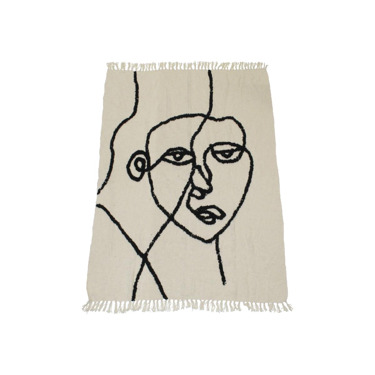 This cotton throw by Libra is from the Linework Face collection of finishing touches. Featuring a stylised sketch of face known as linework, this piece will continually catch your eye. ##Made from. View More. This cotton throw by Libra is from the Linework Face collection of finishing touches. Featuring a stylised sketch of face known as linework, this piece will continually catch your eye. #. #Made from 100% cotton in a versatile off white shade, each end of this striking throw is finished with small tassels along the full length. The design itself is embroidered in black, providing a sharp contrast to the background colour. Woven in India, this lightweight throw will enhance your furnishings with its unusual, intriguing design. A true talking point textile product for your home! Dimensions: W: 130 x D: 170 x H: 3 cm.