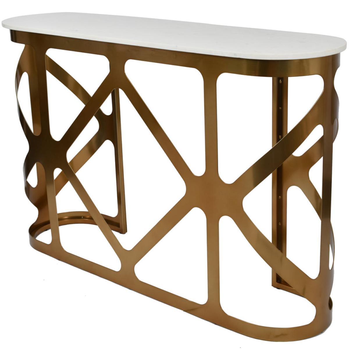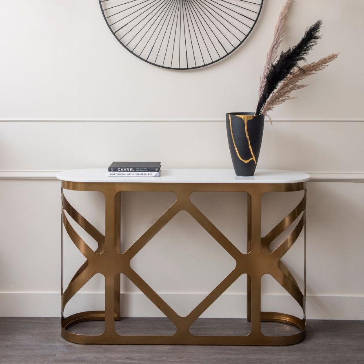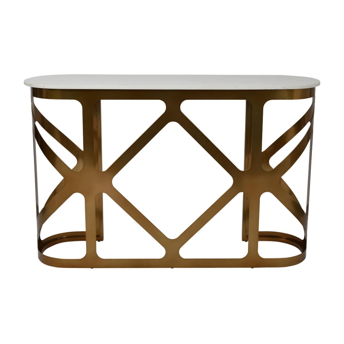 Love art deco? We do too – that’s why this Metropolitan Console Table finished in Satin Bronze Finish with Off-White Marble Top is a real standout style for any home. With its opulent marble top and attractive frame, this piece evokes the golden age of architecture and New York skyscraper style. Dimensions: W: 145.3 x D: 40.9 x H: 91.5 cm Materials: Iron, Marble Assembly Required: No Care Instructions:Dust with a clean, lint free cloth