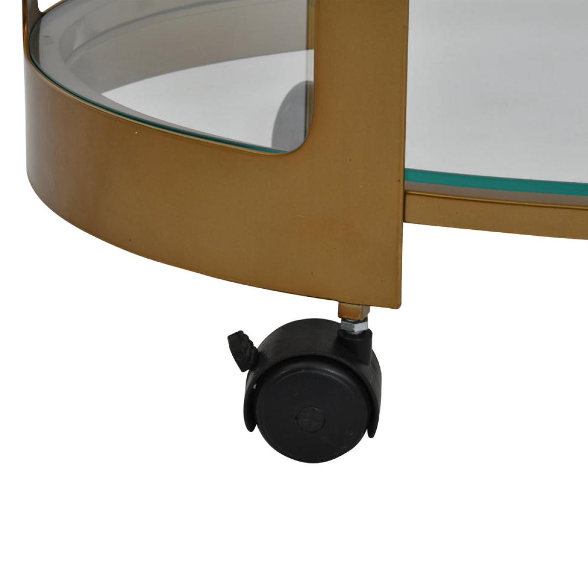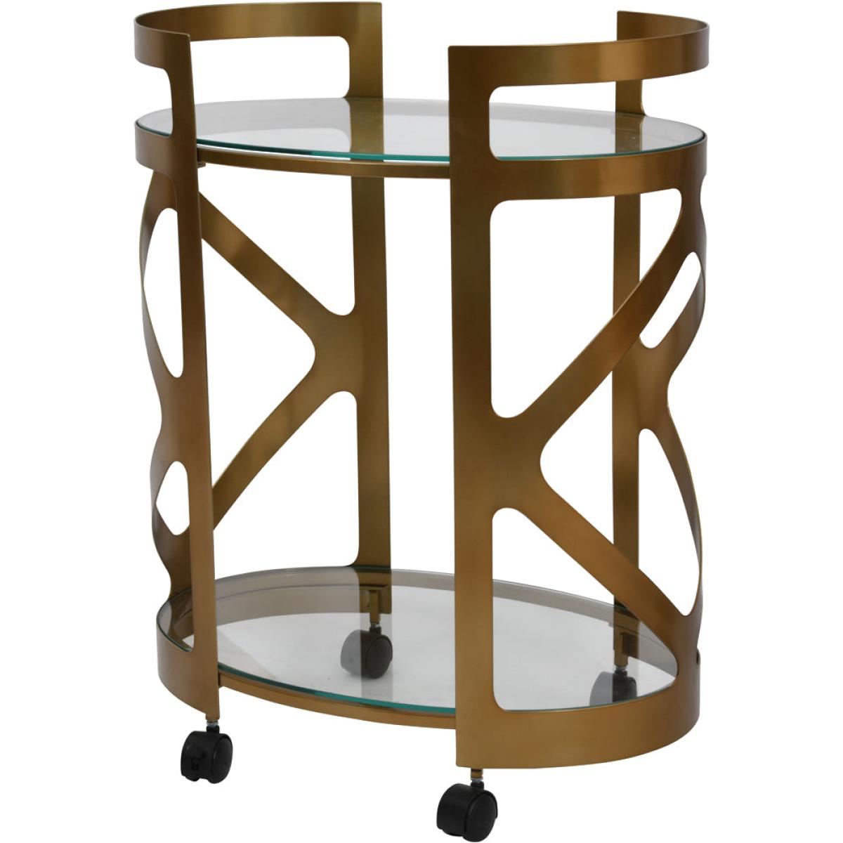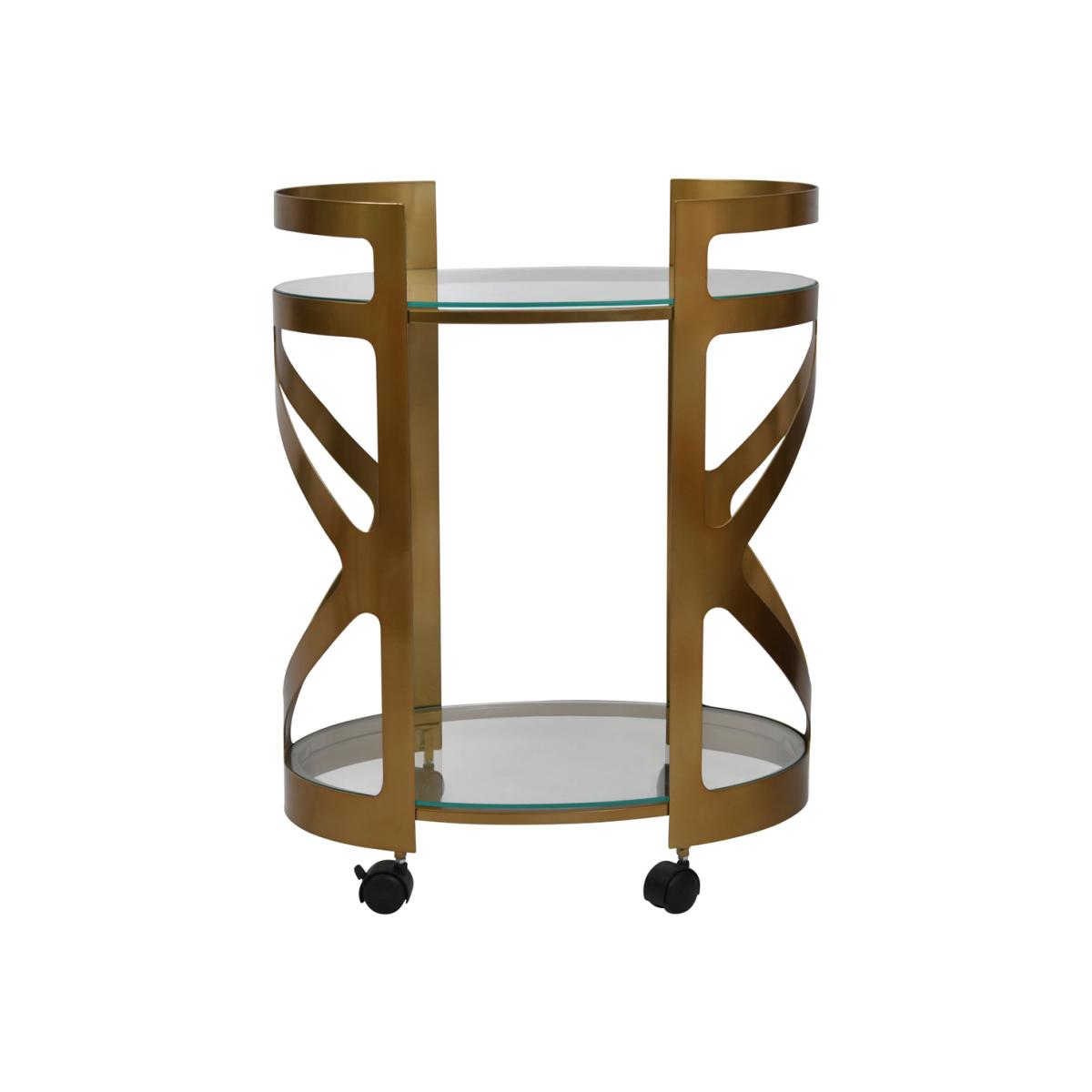 Drinks served with design flair of a true visionary when this Metropolitan Drinks Trolley is placed in a home. Featuring a warm satin bronze finish and glass shelves, this drinks trolley is designed to evoke the art deco 1920s period and we think it’s the perfect addition to serve up a cocktail (or two)…Manhattan, anyone? Dimensions: W: 62.2 x D: 42.5 x H: 82.5 cm Materials: Iron, Glass Assembly Required: Yes Care Instructions:Wipe with clean damp cloth and dry with a clean lint free cloth. No harsh abrasives or bleach