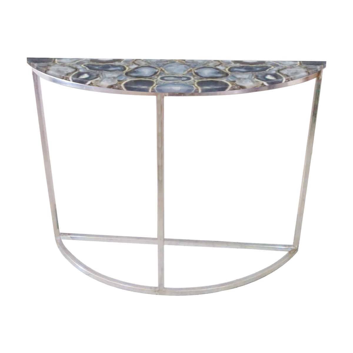 Libra Agate Crescent Console Table On Nickel Frame, from Olivia's. This beautifully designed Agate Round Side Table on Nickel Legs is the perfect accent piece to add interest to your home and complement your space. Finished in a natural agate, this stunning piece brings instant texture and luxury to your space. With its contemporary design, its sturdy semi-circular frame firmly holds and supports the thick agate table top. Contrasting beautifully against the natural agate surface, the half-moon frame is made with quality metals, glazed in a polished nickel finish. The ornamental agate tabletop makes a playful, welcome complement to the cold steel base. Perfect for filling those small spaces, the industrial mix of smooth agate top and shiny three-legged steel frame makes it a great choice to add extra shine and glamor to your space. Please note the pattern and colour will vary from piece to piece due to the natural material used. Dimensions: W:110 x D:30 x H:40 cm. Weight: 18 kg Base Material: StoneTexture/. Finish: Polished Assembly Required: No