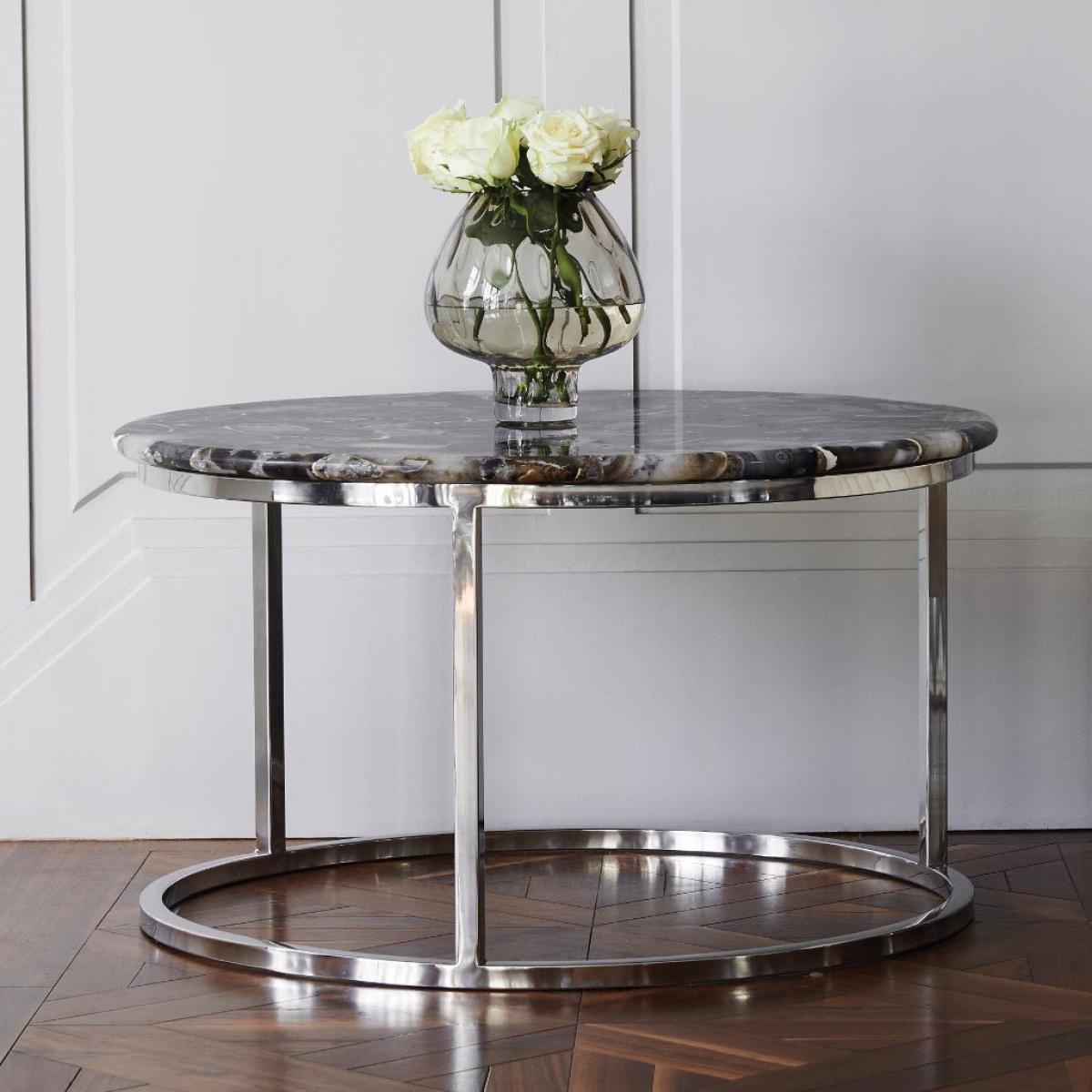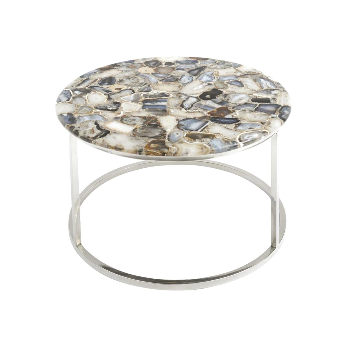 Exuding both elegance and sophistication, this stunning coffee table will transform your space effortlessly. Instantly bringing character and texture to your interior, this beautiful round coffee table looks fantastic in any neutrally themed space. Featuring a thick, circular slab of natural agate, with tones of black, white and very slight hue of blue. Made completely from natural agate, its round surface is visually enough to lose yourself in. Naturally abstract and rich in texture, this beautiful piece sits on a minimalistic, sleek polished steel base. Dimensions:W:73 x D:73 x H:45 cm. Weight: 23.5 kg Care Instructions: wipe clean with a soft damp cloth