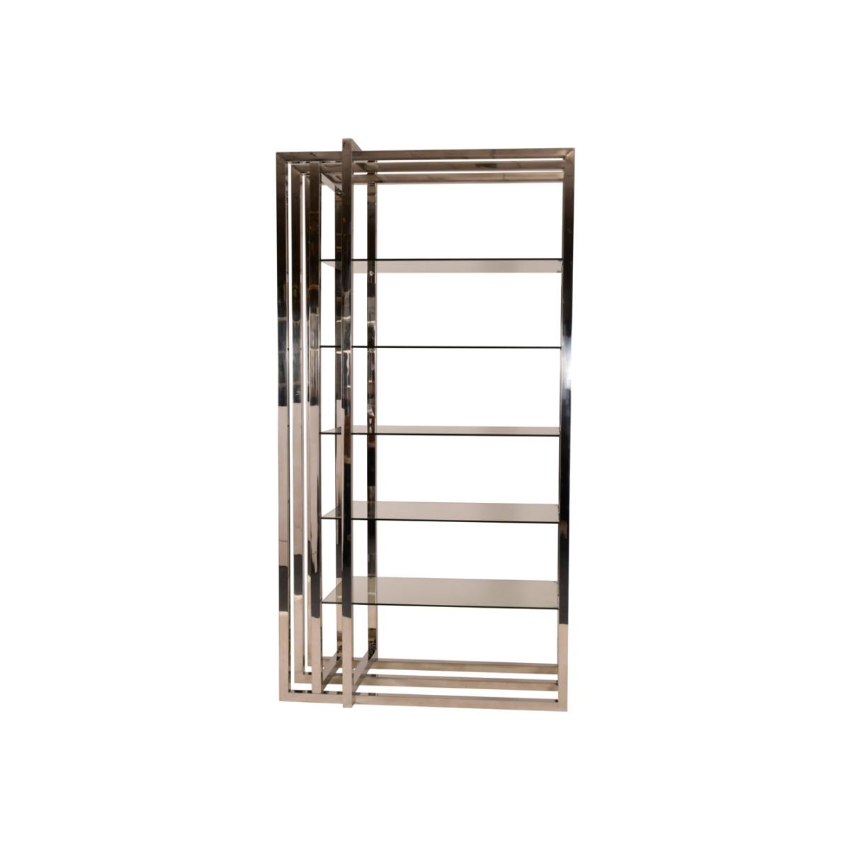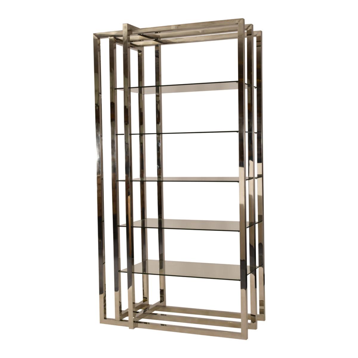 Showcase your favourite items with this striking display unit. Made from stainless steel and standing at 230cm tall, with a width of 120cm and a depth of 60cm, it will demand attention for both itself and its inhabitants! Art pieces, photographs and small sculptures can sit proudly on its 5 glass shelves. The unit has a clean, modern design feel, achieved with the smooth texture of the stainless steel and the solid frame pieces. Note the varying heights of the vertical frame elements, which create a dynamic and different appearance to the piece. A stunning display unit that has a character of its own. Dimensions: W: 120 x D: 60 x H: 230 cm Materials: Stainless Steel Assembly Required: No Care Instructions:Dust with a clean, lint free cloth