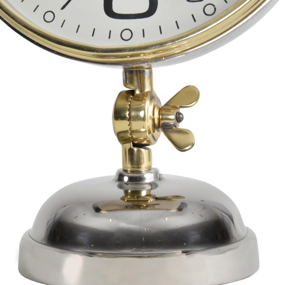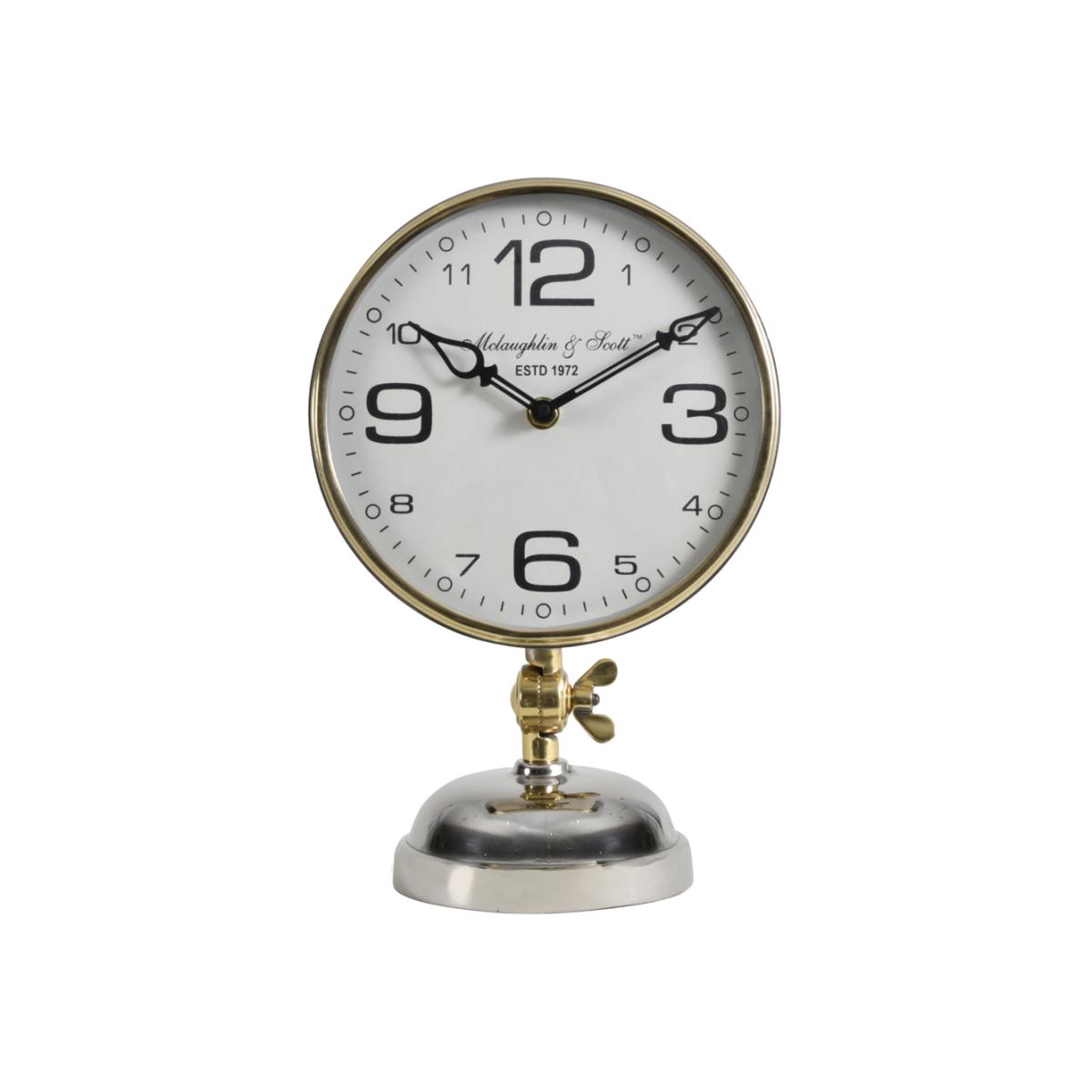Add some elegance and charm to your room with this stunning Silver Nickel Mantel Clock. Featuring an elegant gold angle adjuster that contrasts beautifully with the silver nickel face, the craftsmanship on this beautiful piece cannot fail to be noticed and provides a perfect finishing piece to any living space. At just over 30cm high and 13cm in width, this timeless clock allows you to tell the time with ease from anywhere in the room thanks to its large, 19cm-diameter pale face. Teamed with striking black hands and numbers, you can adjust the face to just the right angle for your room. Dimensions: W: 13 x D: 19 x H: 30.5 cm Materials: Aluminium Steel Brass Assembly Required: No Care Instructions:Dust with a clean, lint free cloth