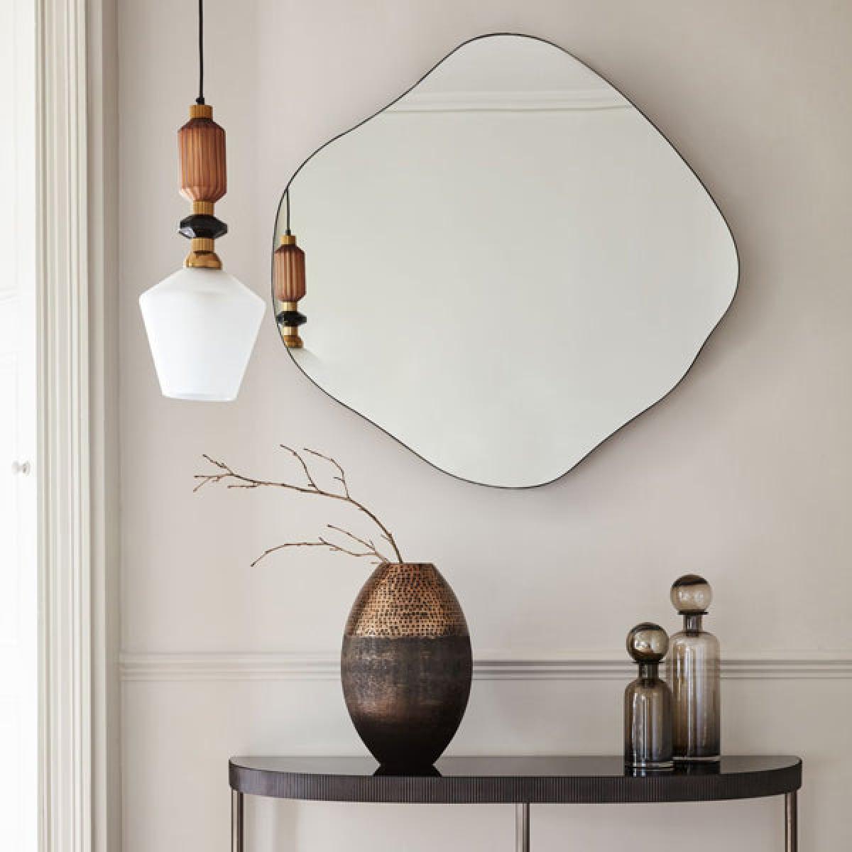 The addition of a mirror will refresh the style of your home. Get a great modern look for your home with this stylish metal framed wall mirror from the Libra range. It boasts an oak frame and an ir. View More. The addition of a mirror will refresh the style of your home. Get a great modern look for your home with this stylish metal framed wall mirror from the Libra range. It boasts an oak frame and an irregular shape, creating an unusual look. Hang the mirror in your lounge, dining room, hallway, bedroom or bathroom, its simple style makes it suitable for a variety of rooms throughout your home. It is available in three sizes, so you can choose the best size to suit your space. Sizes range from H:80. 5 x W:78cm, H:60. 5 x W:58. 5cm and H:100. 5 x W:97cm. All mirrors are 6cm deep.