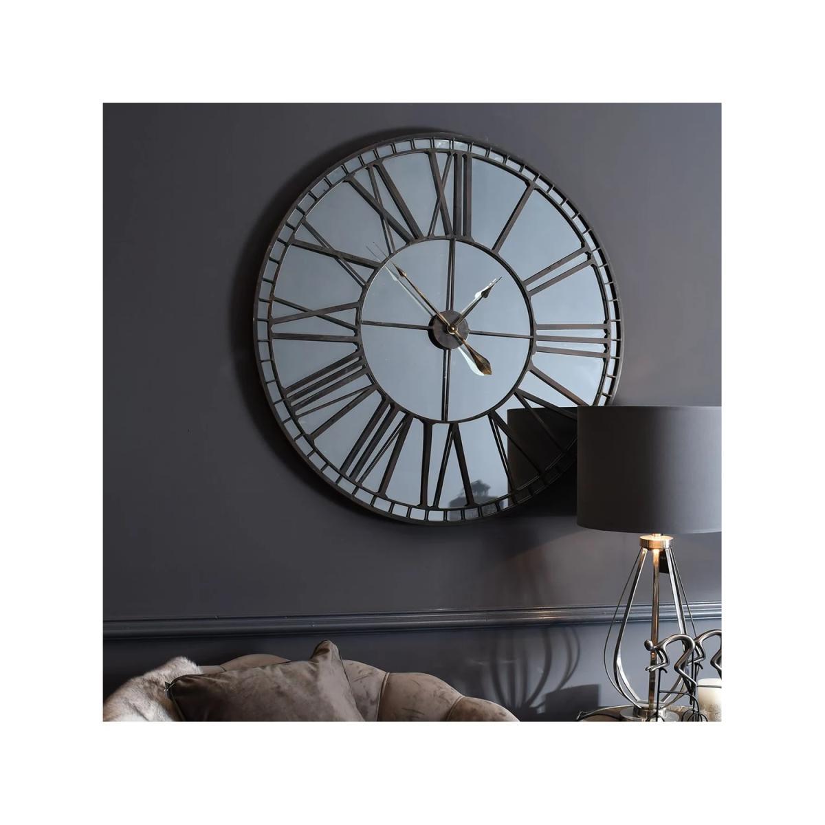 I love the Libra Skeleton Roman Numerals large round mirror wall clock for its contemporary yet classical appeal. Its bold black frame lends itself well to industrial or modern interiors, but it can also sharpen a minimalist space with its clean lines. The open design makes it a versatile piece, working well in both living rooms and kitchens, especially where you want to add an architectural feature without overwhelming the space. Practical styling tips include pairing it with textured neutrals or metallic accents to enhance its striking silhouette, and hanging it at eye level to keep the clock functional as well as stylish. Its large size makes it a statement piece, so keep surrounding decor simple to let it shine.