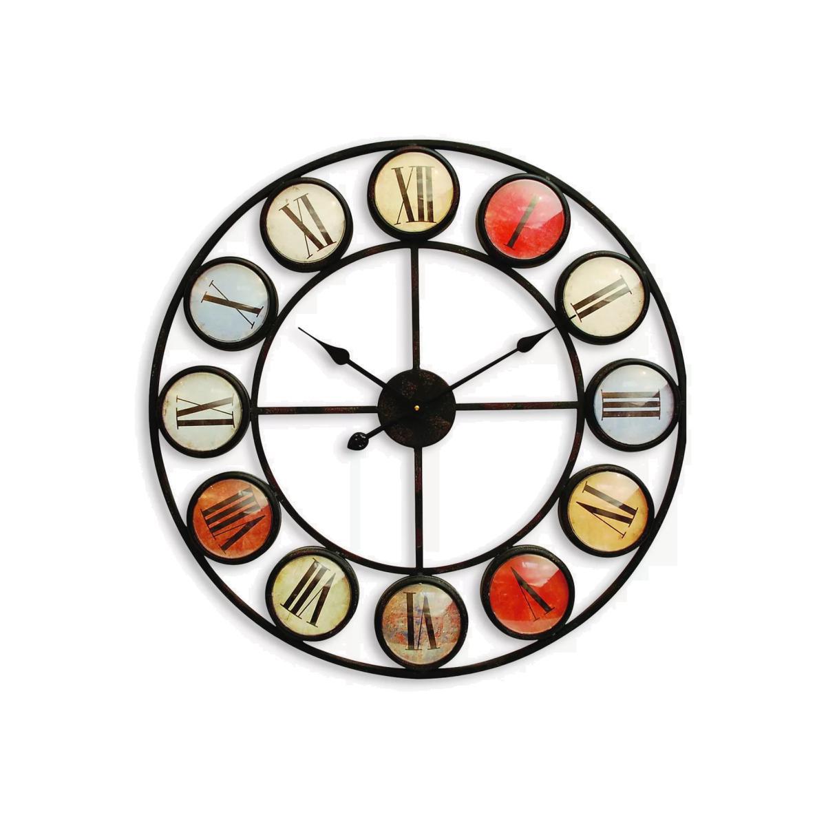 Bright pops of colour display the hours on this Libra clock, within a black iron skeletal frame that allows your wall decor to show. The Roman numerals add a classic touch with the multi-hued domes creating a dramatic effect. The iron framing has a subtle rusted antique finish.