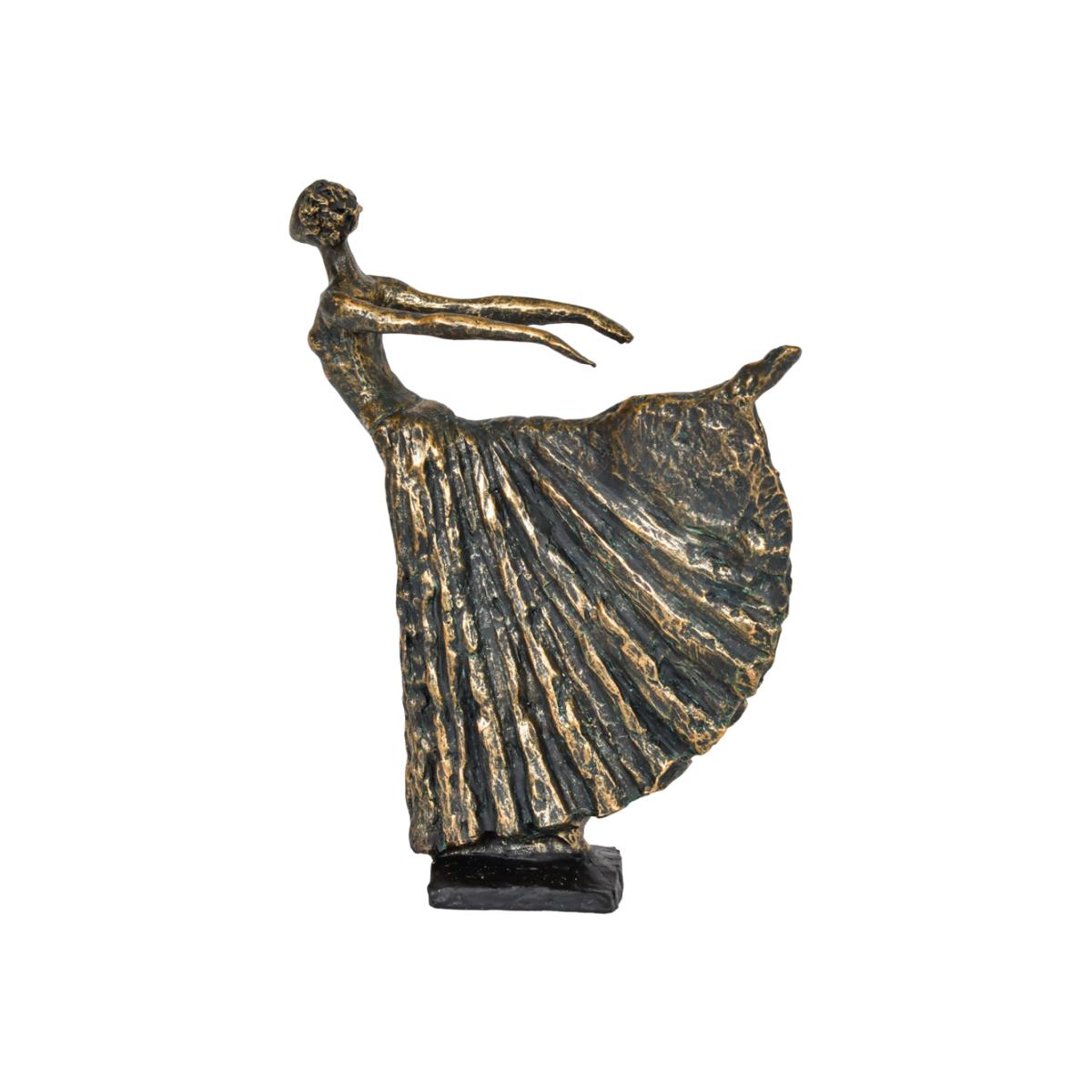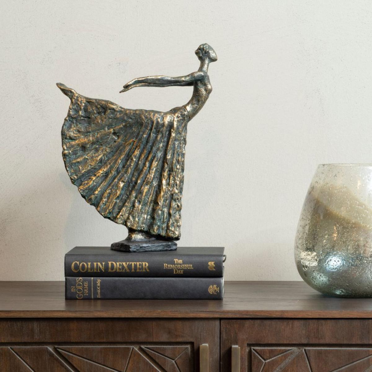 The Libra Standing Bronze Resin Lady Dancer would look absolutely beautiful posing on any piece of furniture in the house. She has been made out of resin and is finished with a bronze effect. This means that her base colour is black, and she has flecks of golden bronze all over, which gives her a lovely shimmer and texture. The ballet dancer is standing in an arabesque, which is famous pose known for its elegance and power. It is a piece of art that every dance lover must have! This item measures 25cm in width, 9.2cm in depth and 32cm in height. Dimensions: W: 25 x D: 9.2 x H: 32 cm Materials: 100% Polyresin Assembly Required: No Care Instructions:Dust with a clean, lint free cloth