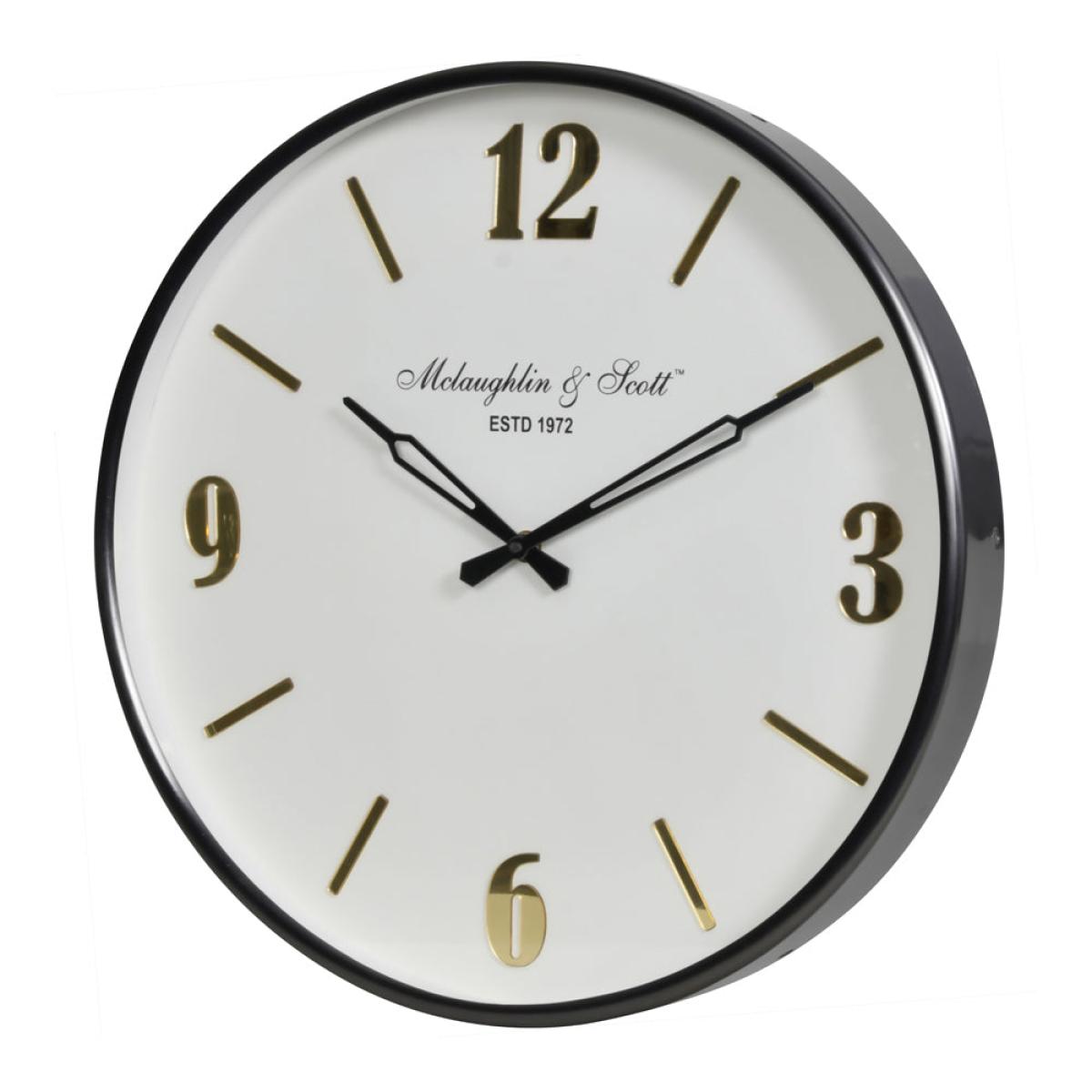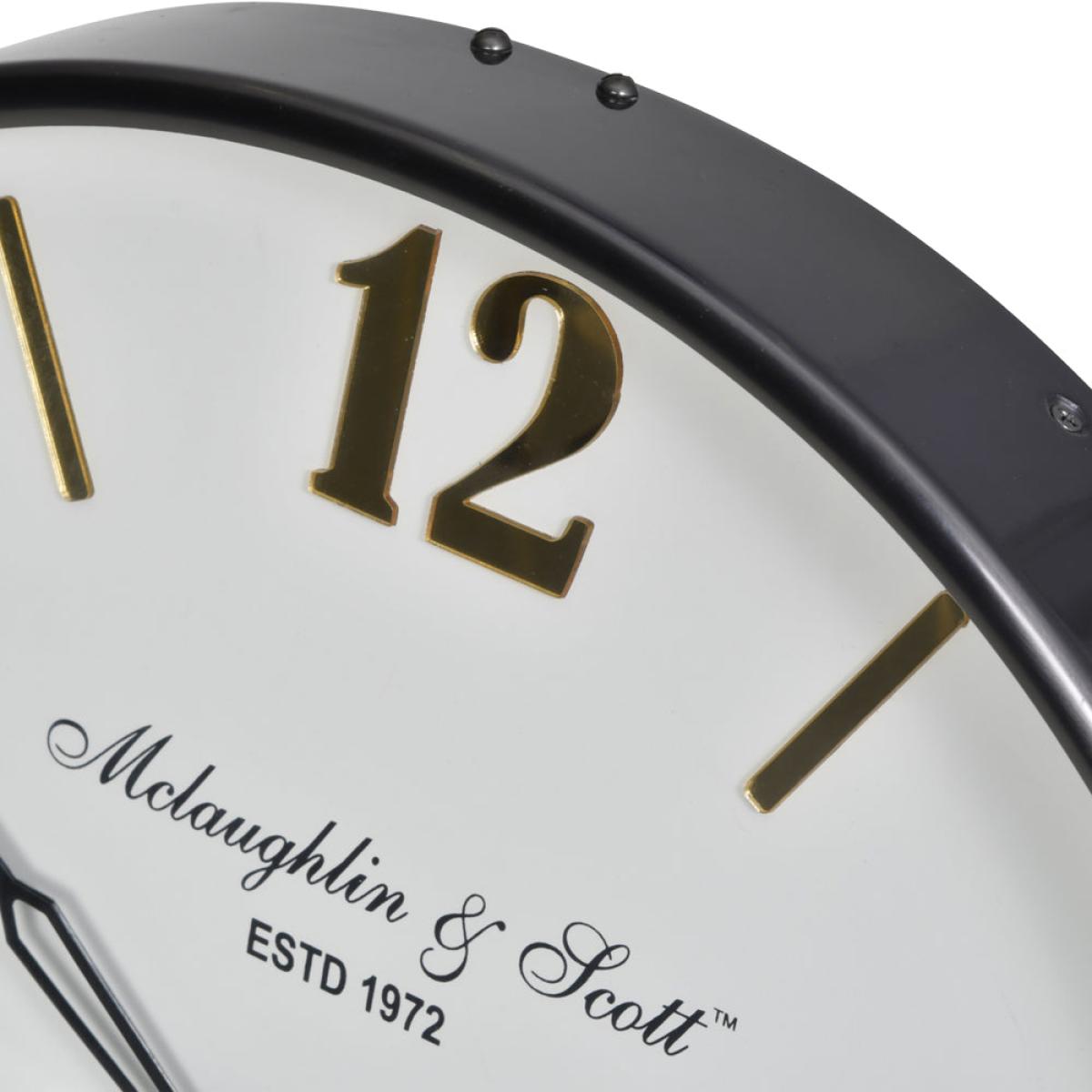 It's easy to keep on schedule with the handsome Libra Thompson Black Nickel Wall Clock with Gold Detail by Olivia's on display. This striking wall clock boasts a delightful combination of classic a. View More. It's easy to keep on schedule with the handsome Libra Thompson Black Nickel Wall Clock with Gold Detail by Olivia's on display. This striking wall clock boasts a delightful combination of classic and contemporary design details, making it the ideal choice for any style of home. With a traditional round face in a chic white hue, the gleaming metallic golden numerals and matt nickel hands add a funky touch that's sure to delight. An elegant and minimalist black frame pulls the whole look together, with the result being a timeless time-keeper which looks superb in any living area, kitchen or dining space.
