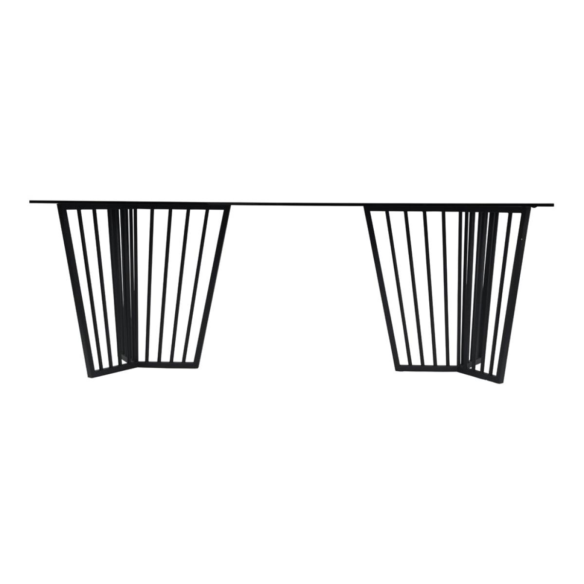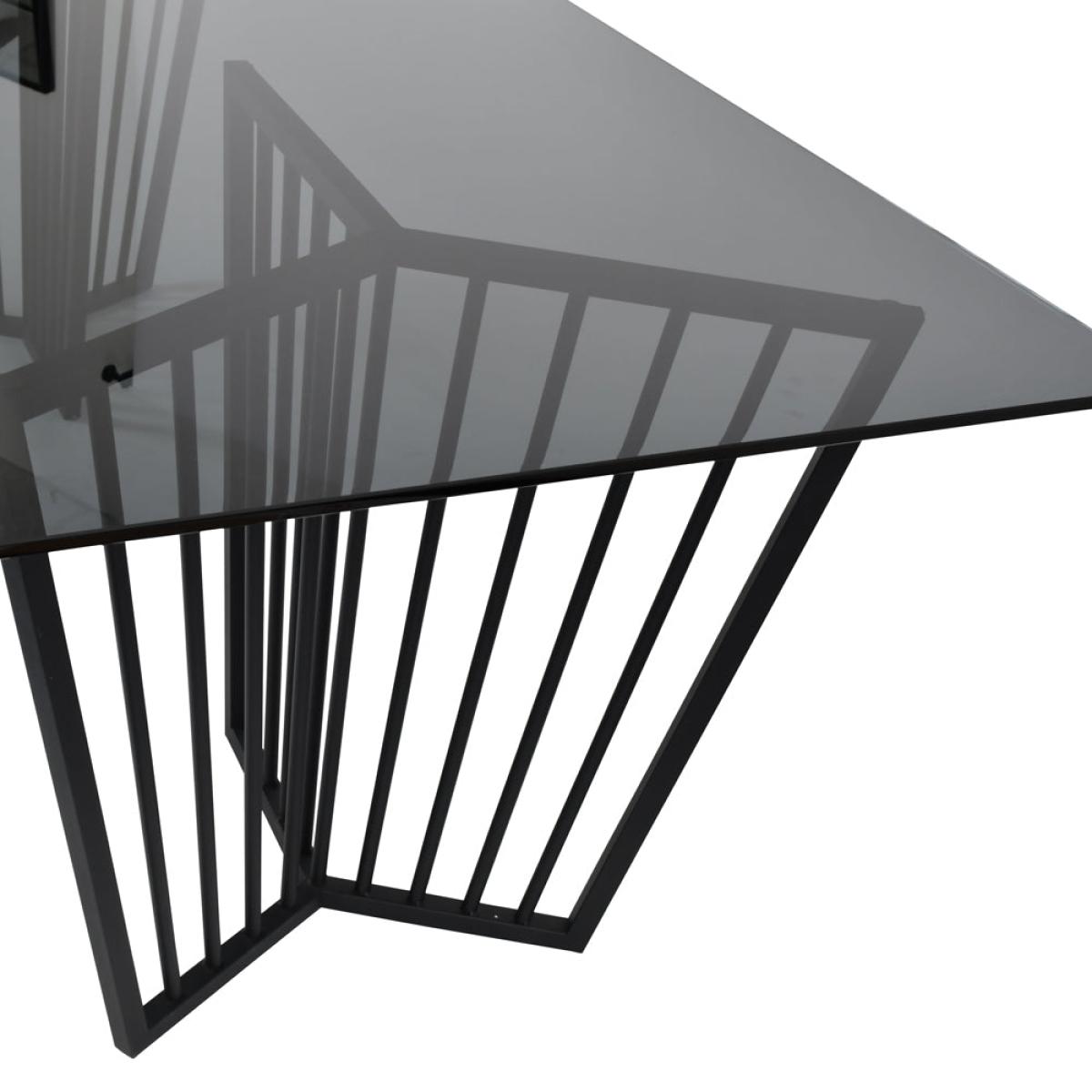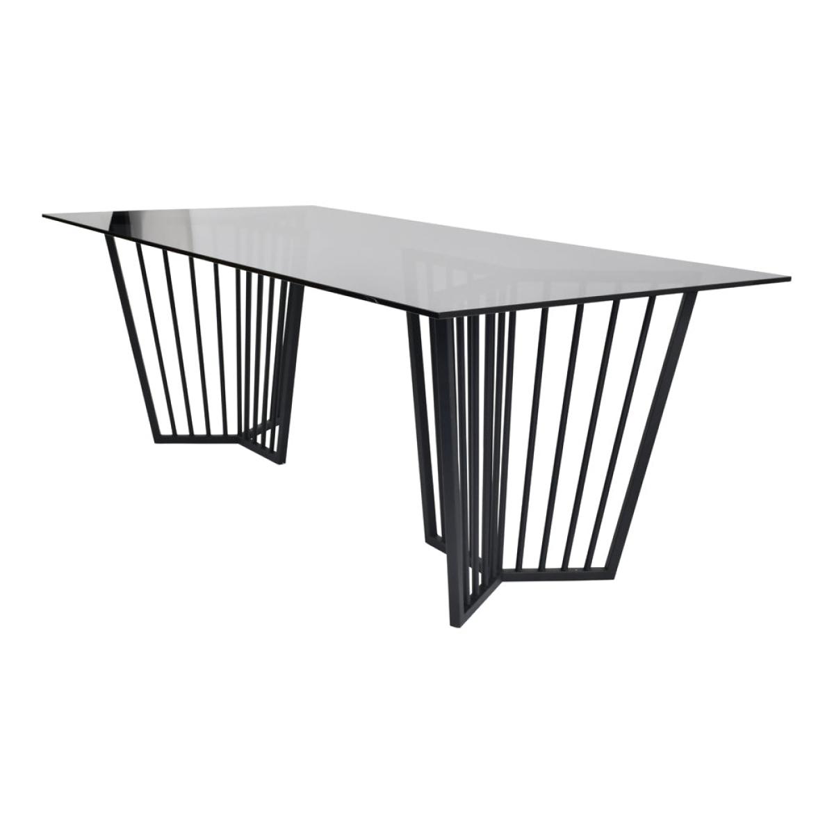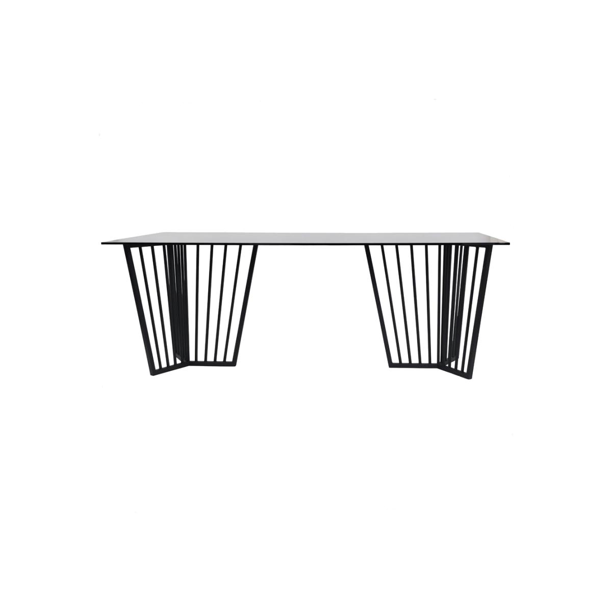 The Abington Glass Dining Table is made in matte black powder coated metal and tinted glass. The pedestal bases offer a striking alternative to a traditional dining table. Each pedestal measures 72cm wide, and has an angled tripod structure. A tempered glass sheet rests securely on top and measures 100x200cm and is 12mm thick. The Abington Dining Table comfortably sits six diners, two on each length and one at each end. This dining table is also available in stainless steel with clear glass. Dimensions: W: 200 x D: 100 x H: 75 cm Materials: Stainless Steel, Glass Assembly Required:Yes Care Instructions:Wipe with clean damp cloth and dry with a clean lint free cloth. No harsh abrasives or bleach