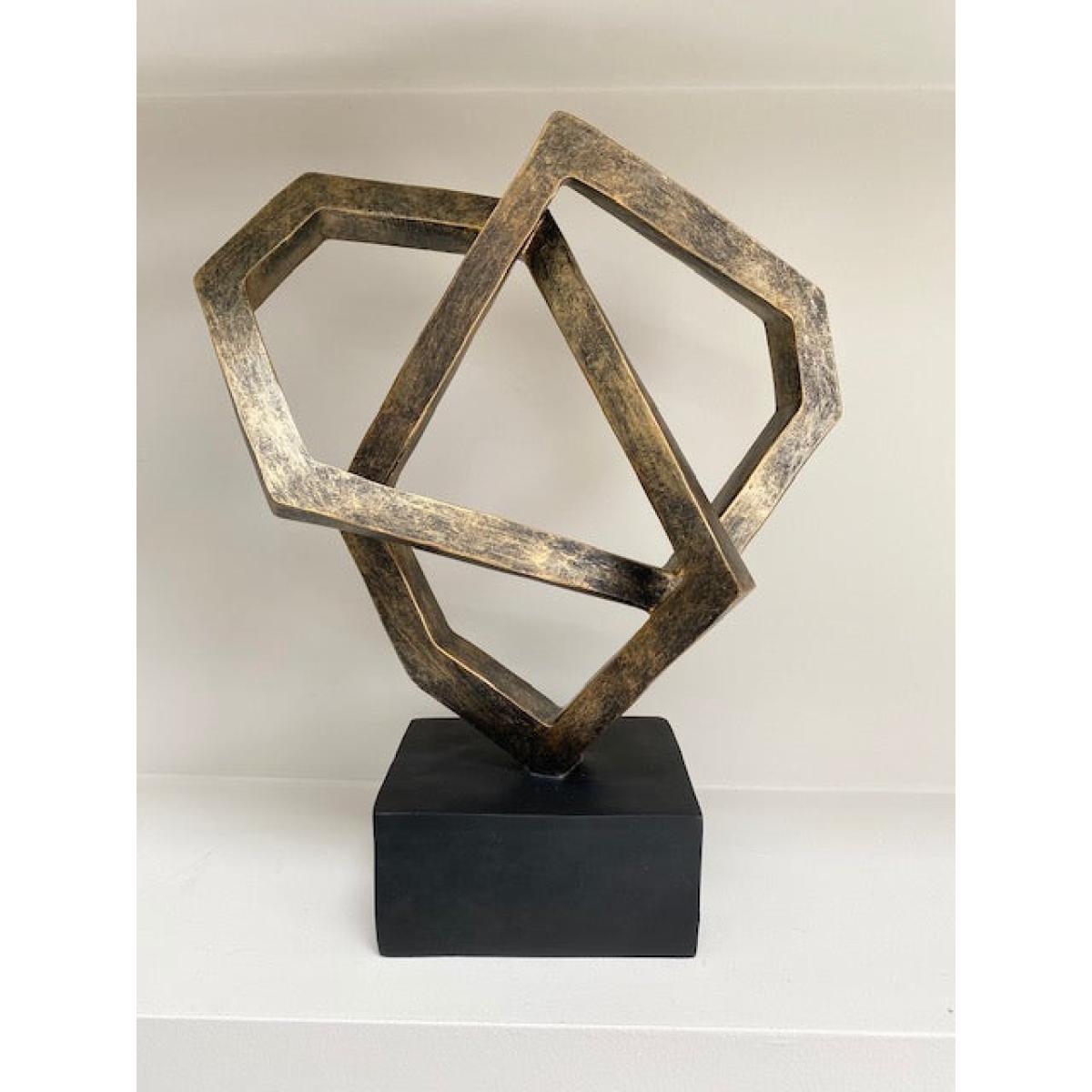 Contemporary and unusual in design, this geometric-inspired sculpture is perfect for bringing your interior to life. Add a unique sculpture to add a design element with a touch of sophistication. Finished in a rough, antique bronze, this piece is beautifully detailed and shaded. Its gold body contrasts beautifully with its black cube base, creating a striking, rich colour palette. Perfect for any modern home, this cubist sculpture adds an interesting viewpoint to your home. Complete the look by positioning on a sideboard or mantle space. Dimensions: W:29.2 x D:10.7 x H:35.9cm Materials: Polyresin. Weight: 1.9kg