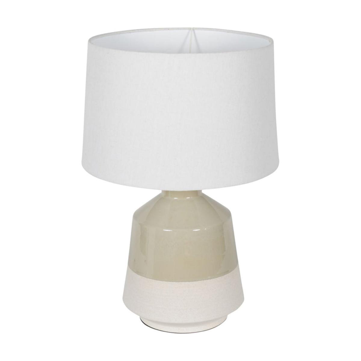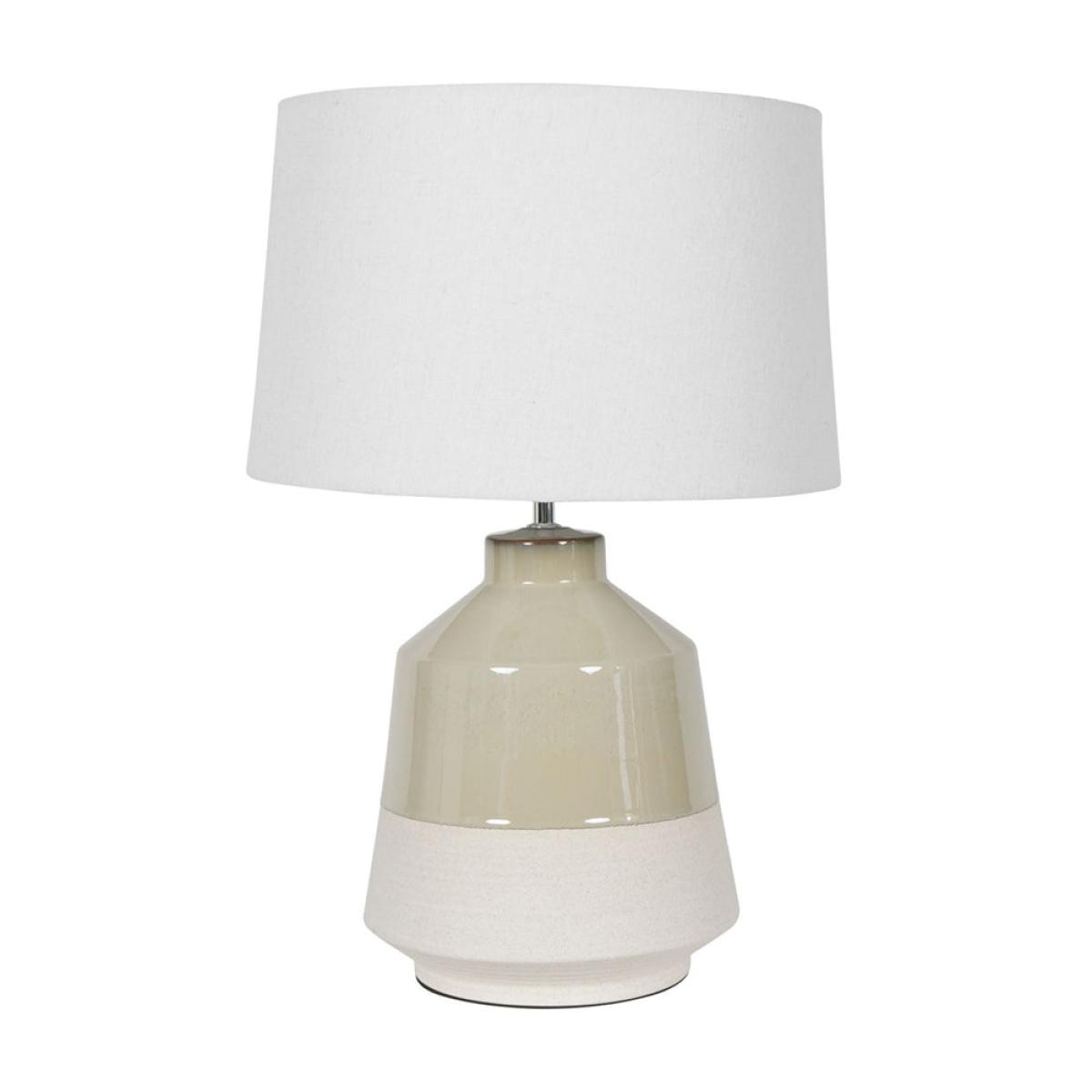 Our Canterbury Table Lamp is made in ceramic, with a rustic stone coloured bisque fired base, topped with a beautiful creamy soft sage green glaze, on the top 2/3 of the lamp base, for a contrast look. The lamp comes complete with a Coolie shade in an ivory colour. It benefits from a 120cm black cable with an inline rocker switch. Dimensions: Small - H: 44 x W: 30 x D: 30 cm Large - H: 58 x W: 40 x D: 40 cm Materials: 60% Ceramic base, 40% Linen shade Assembly Required: No Care Instructions:Dust with a dry, soft cloth Bulb Type: 1x E27 Bulb - not included
