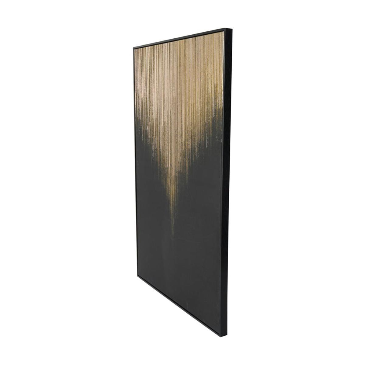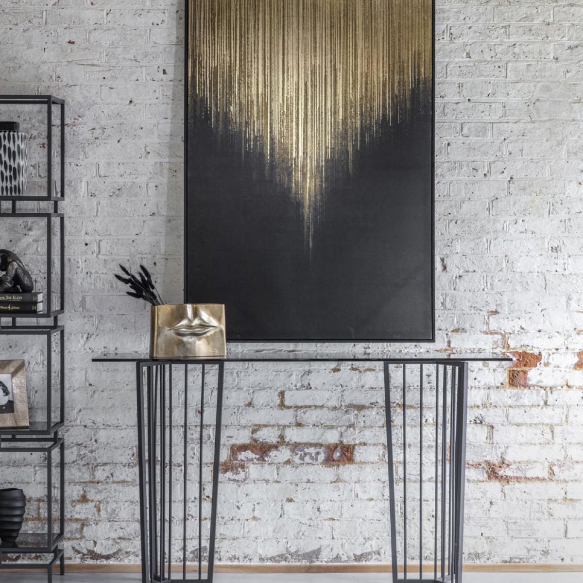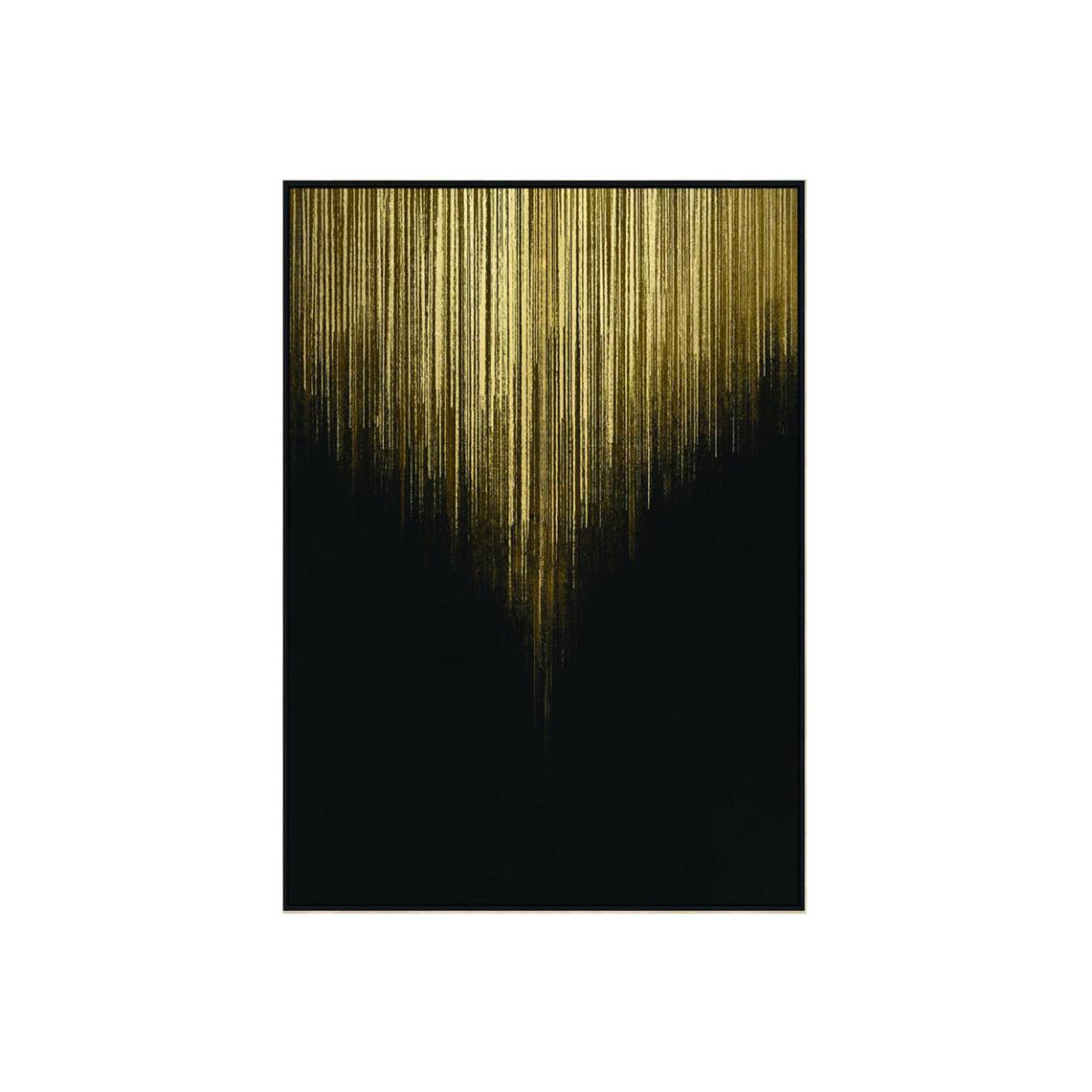 This Abstract and Contemporary Canvas consists of a moody black backdrop, with a textured golden painted and foiled design. Measuring 140cm x 100cm, the canvas is framed with a black wood effect frame. It hangs portrait only on two integral hooks. Wall fixtures not included. This product is hand finished to ensure that no two will be the same. Dimensions: H: 140 x W: 100 x D: 4 cm Materials: 50% Canvas, 20% PSFrame, 20% Wood. Frame, 10% Dr Assembly Required: No Care Instructions:Dust with a dry, soft cloth. Fixing Type: D-Ring. Orientation: Portrait